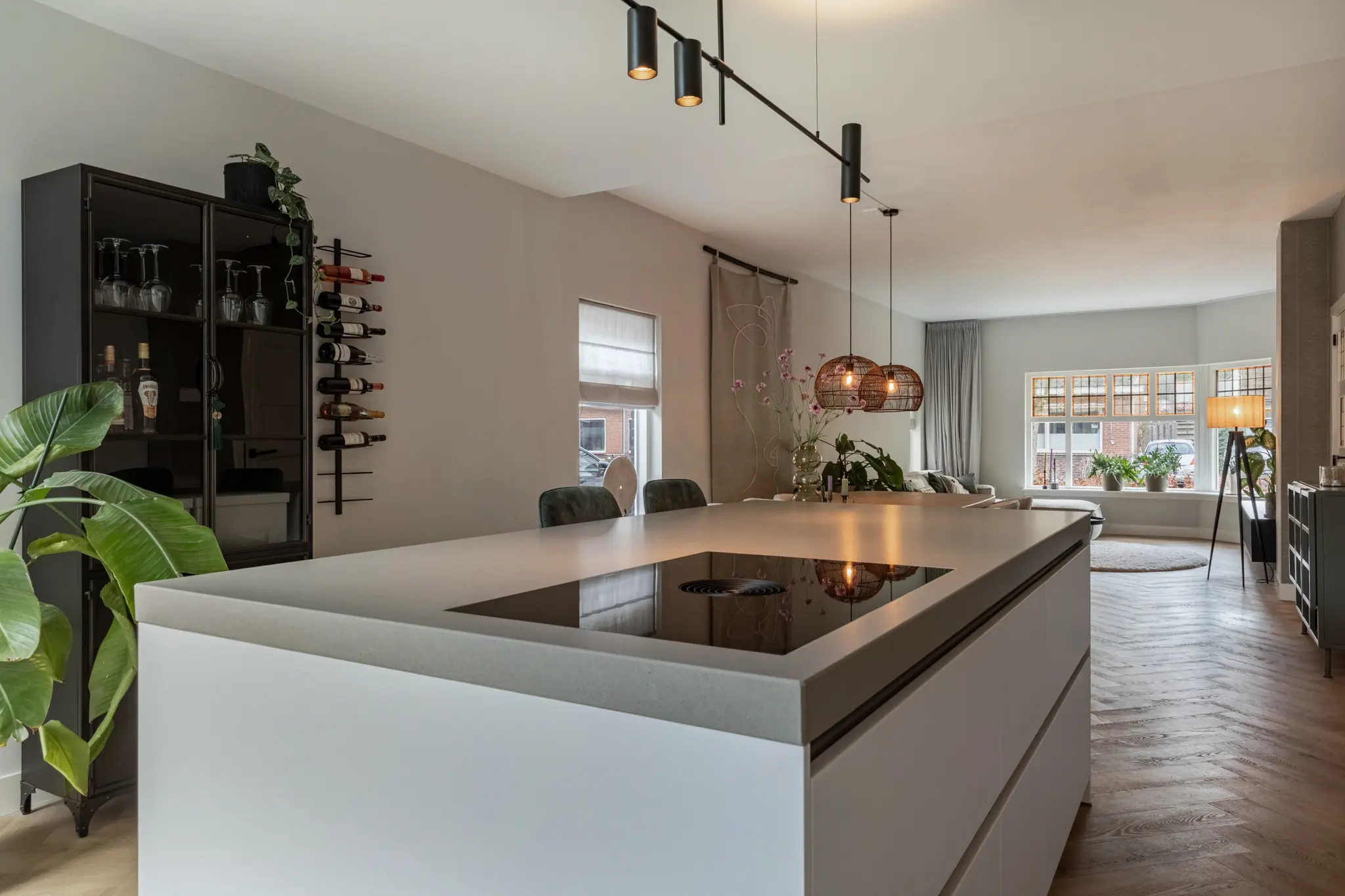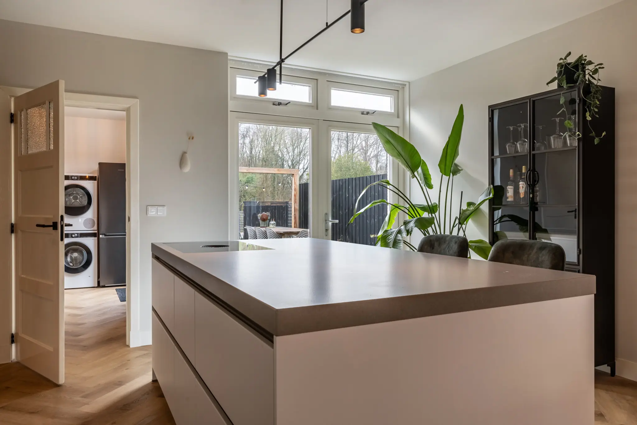 Via de entree betreed je de hal met trapopgang en toegang tot de leefruimte. Direct valt de ruimtelijkheid en prettige lichtinval op. De woning is aan de achterzijde fors uitgebouwd, wat heeft geresulteerd in een royale en open woon-/eetruimte met aangenaam tuincontact. De moderne keuken (2023) met kookeiland, vormt het hart van de woning en is strak uitgevoerd met eigentijdse materialen en hoogwaardige inbouwapparatuur. Dankzij de vloerverwarming en de hoogwaardige afwerking voelt de begane grond comfortabel en luxe aan. Grote raampartijen en de open verbinding met de tuin maken dit een heerlijke plek om te wonen en te leven. Aan de achterzijde bevinden zich bovendien een praktische ruime bijkeuken en een vernieuwd toilet.