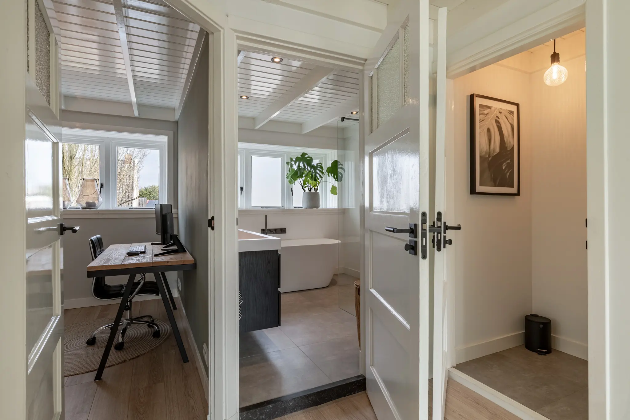 Op de eerste verdieping zijn twee comfortabele slaapkamers gesitueerd, evenals een volledig vernieuwde badkamer (2023). De badkamer is modern en stijlvol ingericht en voorzien van luxe sanitair, waaronder een ligbad, een inloopdouche en een wastafelmeubel. Daarnaast is er een separaat toilet. Ook deze verdieping is tot in detail afgewerkt en direct klaar voor gebruik.