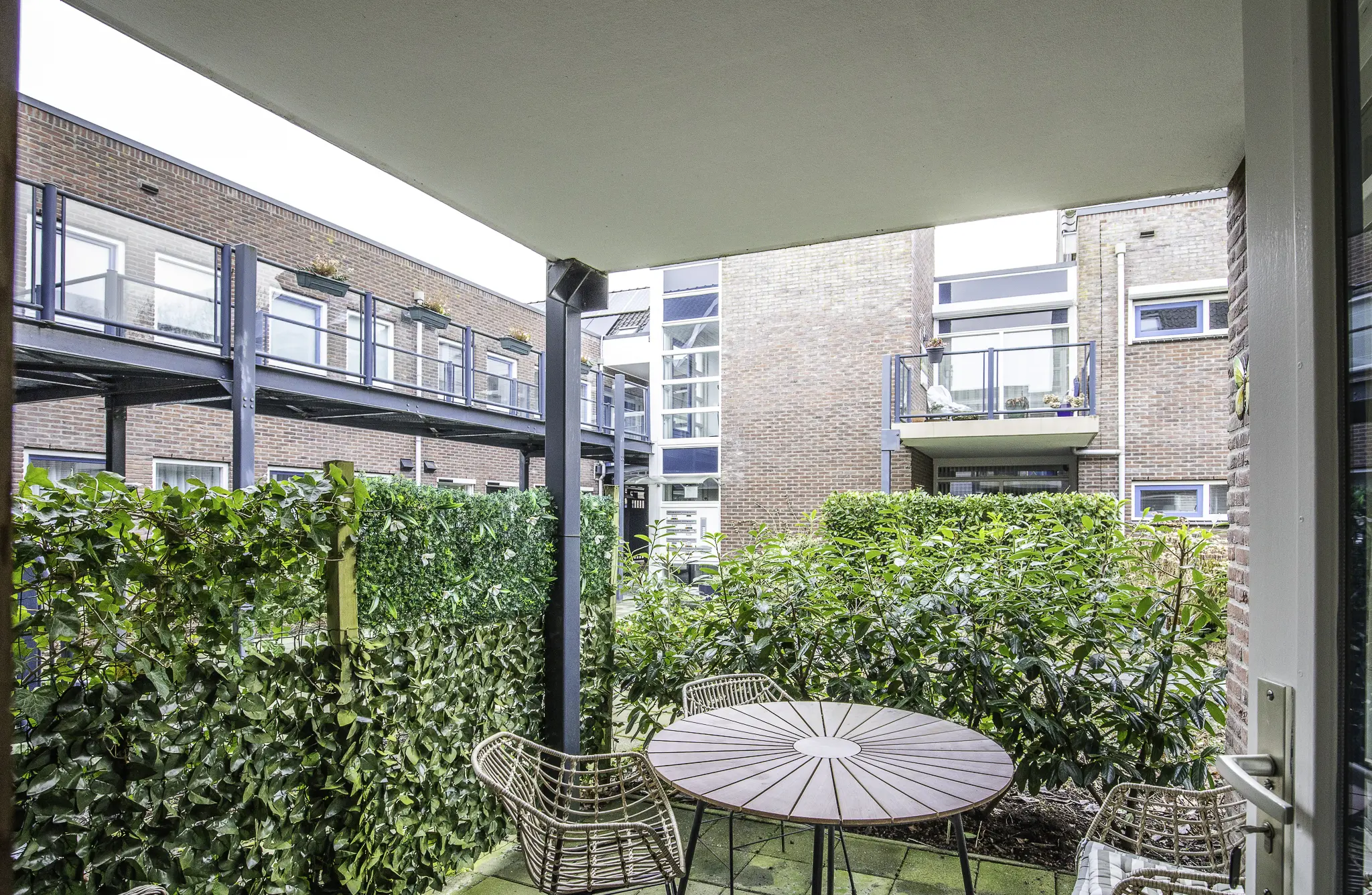 Het appartement beschikt over een eigen terras en een privé garage. Daarnaast ligt het complex in een besloten gemeenschappelijke tuin, wat zorgt voor een rustige en groene woonomgeving.