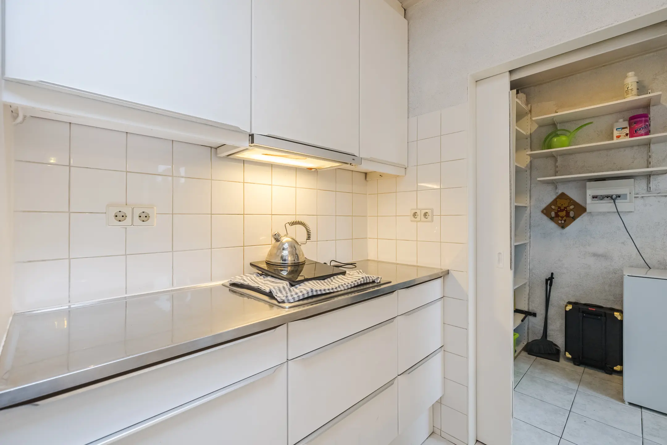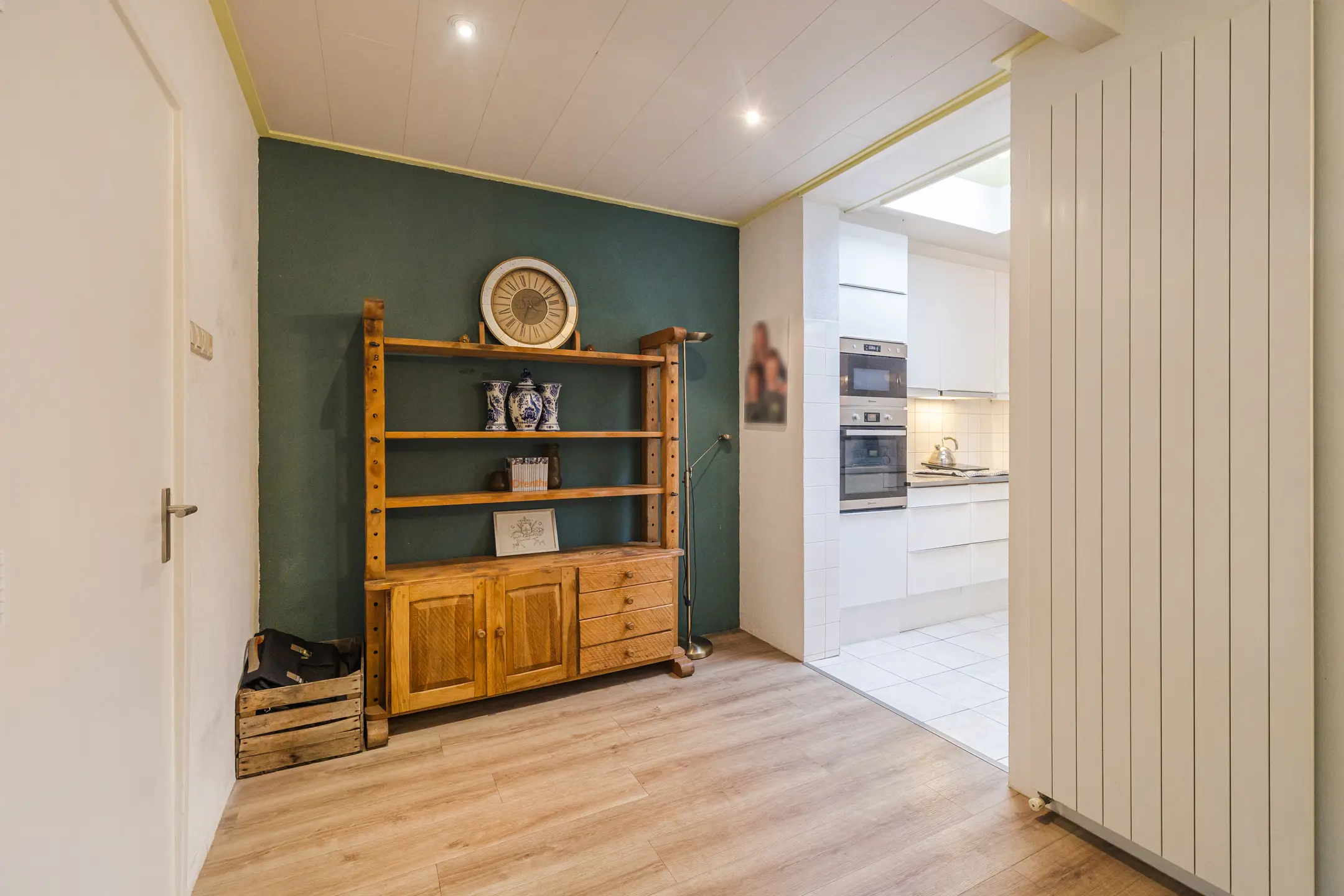 Entree/hal met PVC-vloer, toilet, meterkast en trapkast. Ruime woonkamer met eethoek en halfopen keuken, voorzien van oven, magnetron en 4-pits gasstel. Vanuit de keuken toegang tot de bijkeuken met aansluiting voor wasmachine, opstelplaats voor de omvormer van de zonnepanelen en ruimte voor extra apparatuur (zoals een losse koelkast).