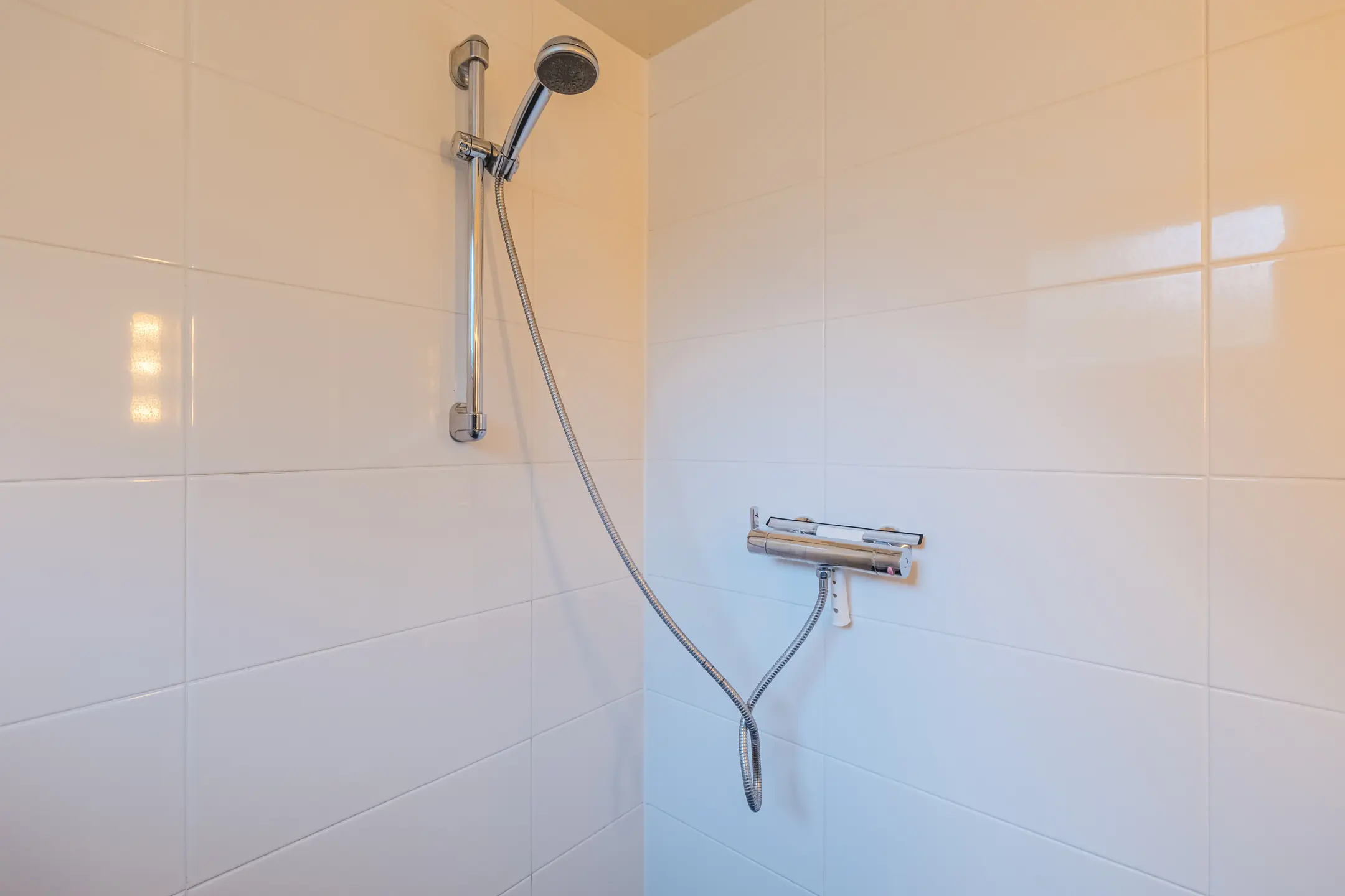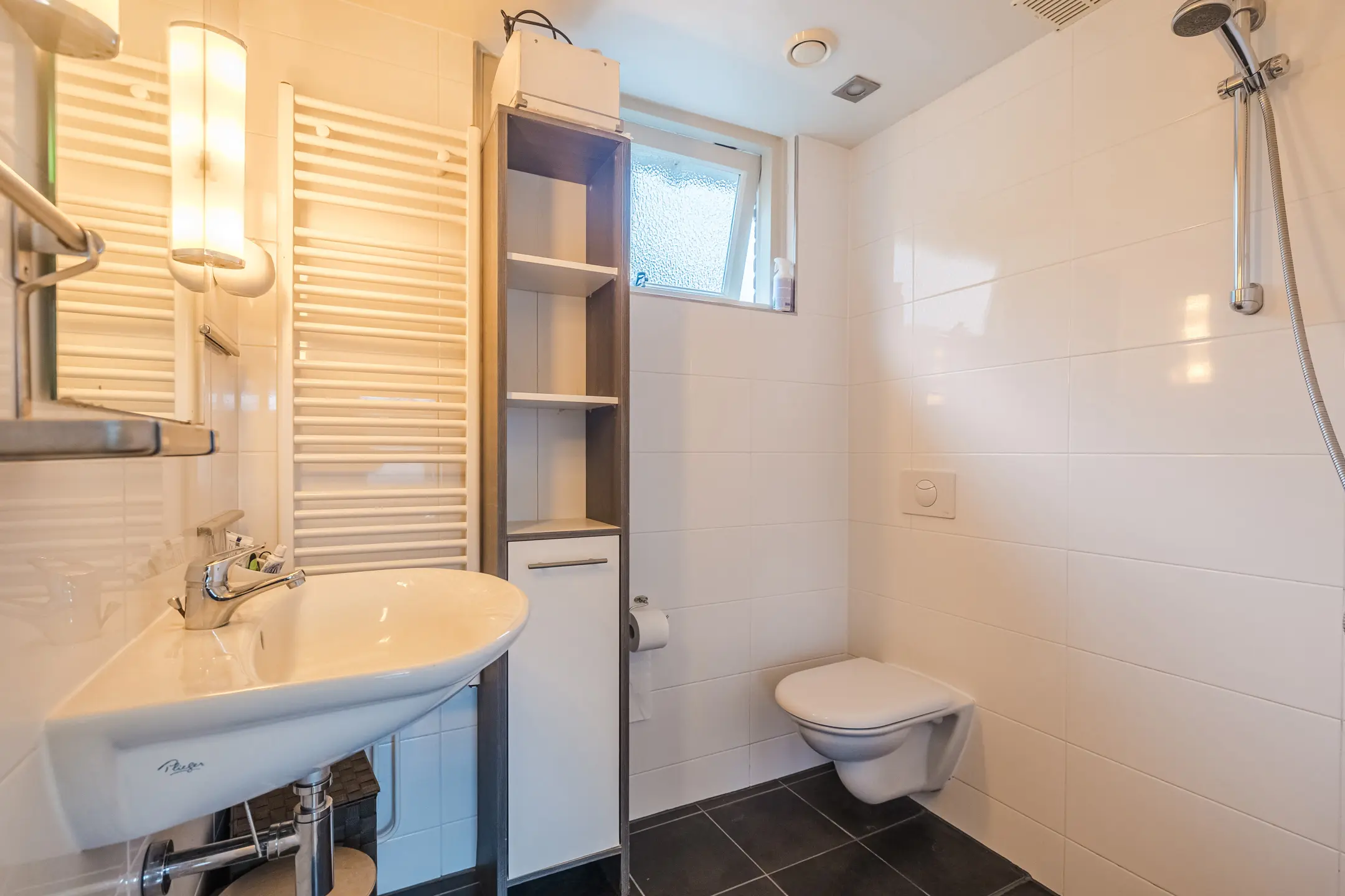 Overloop met drie slaapkamers (kunststof kozijnen) en een nette badkamer met douche, toilet en wastafel.