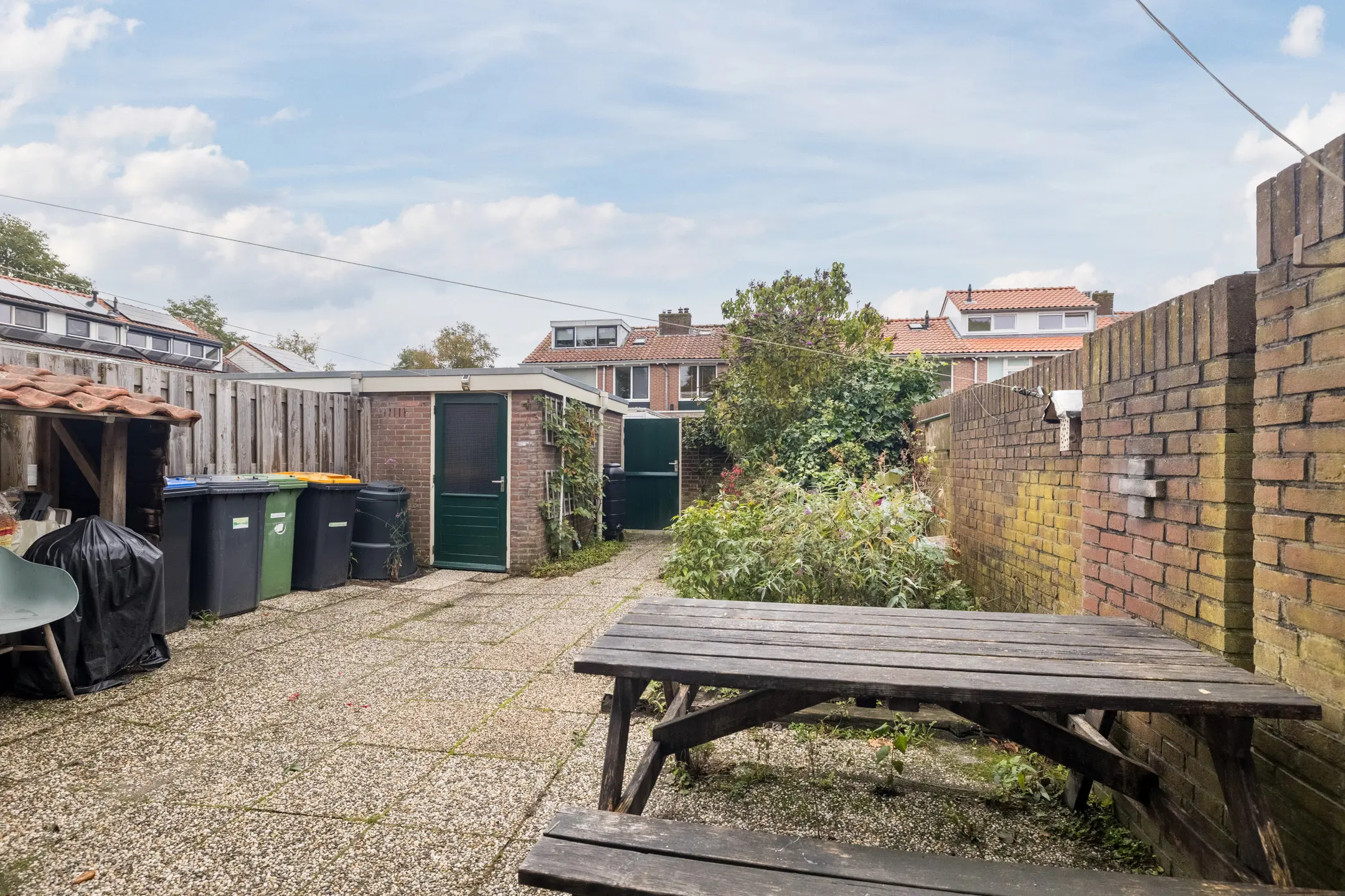 Zonnige achtertuin op het zuidoosten met overkapping en vrijstaande stenen berging met elektra.