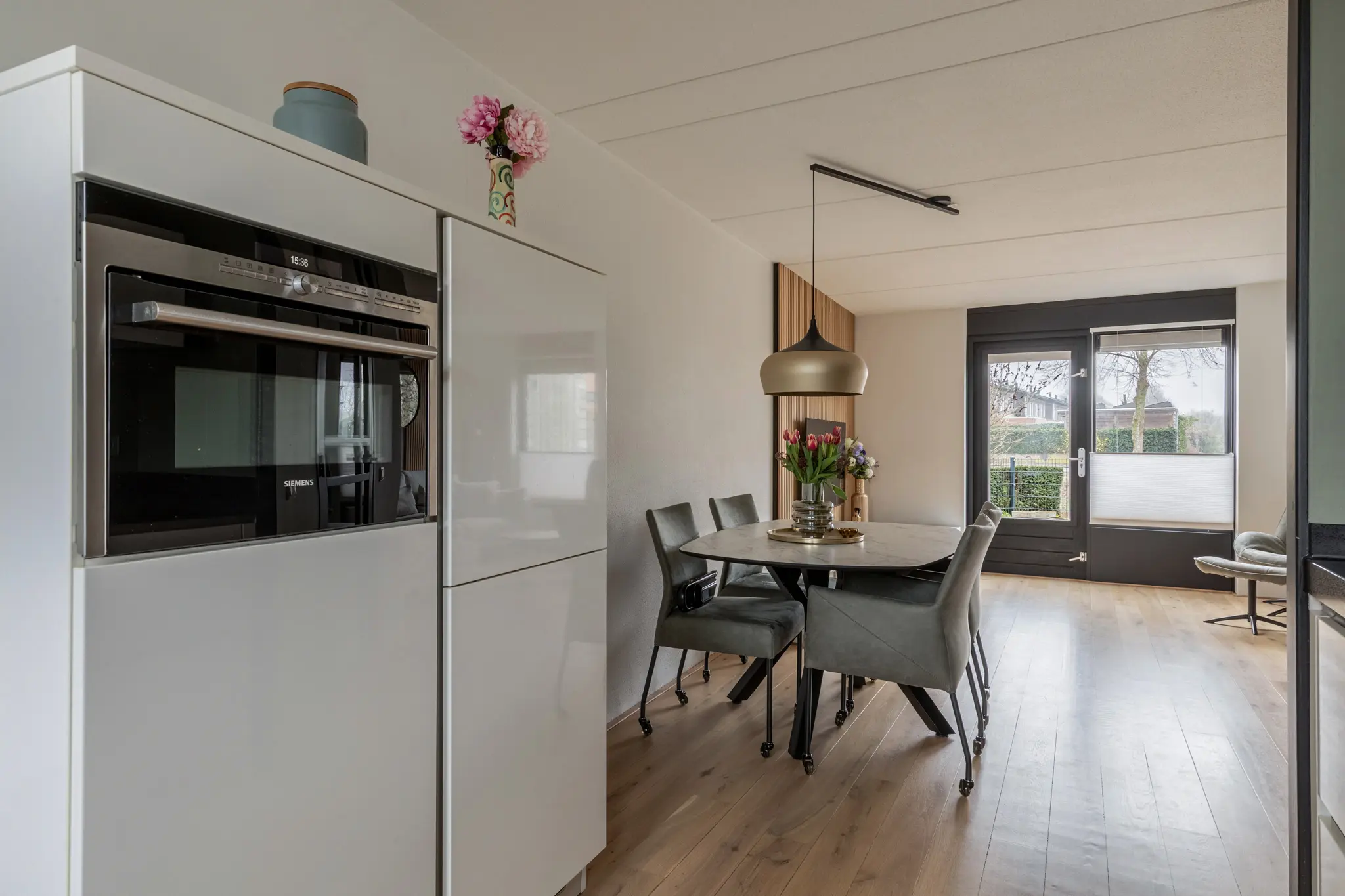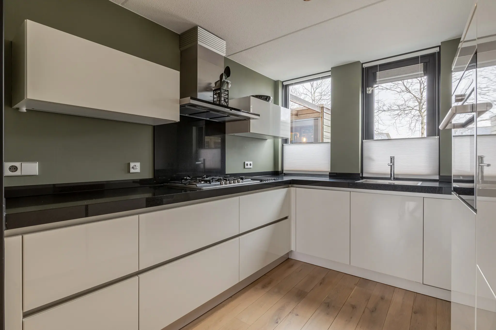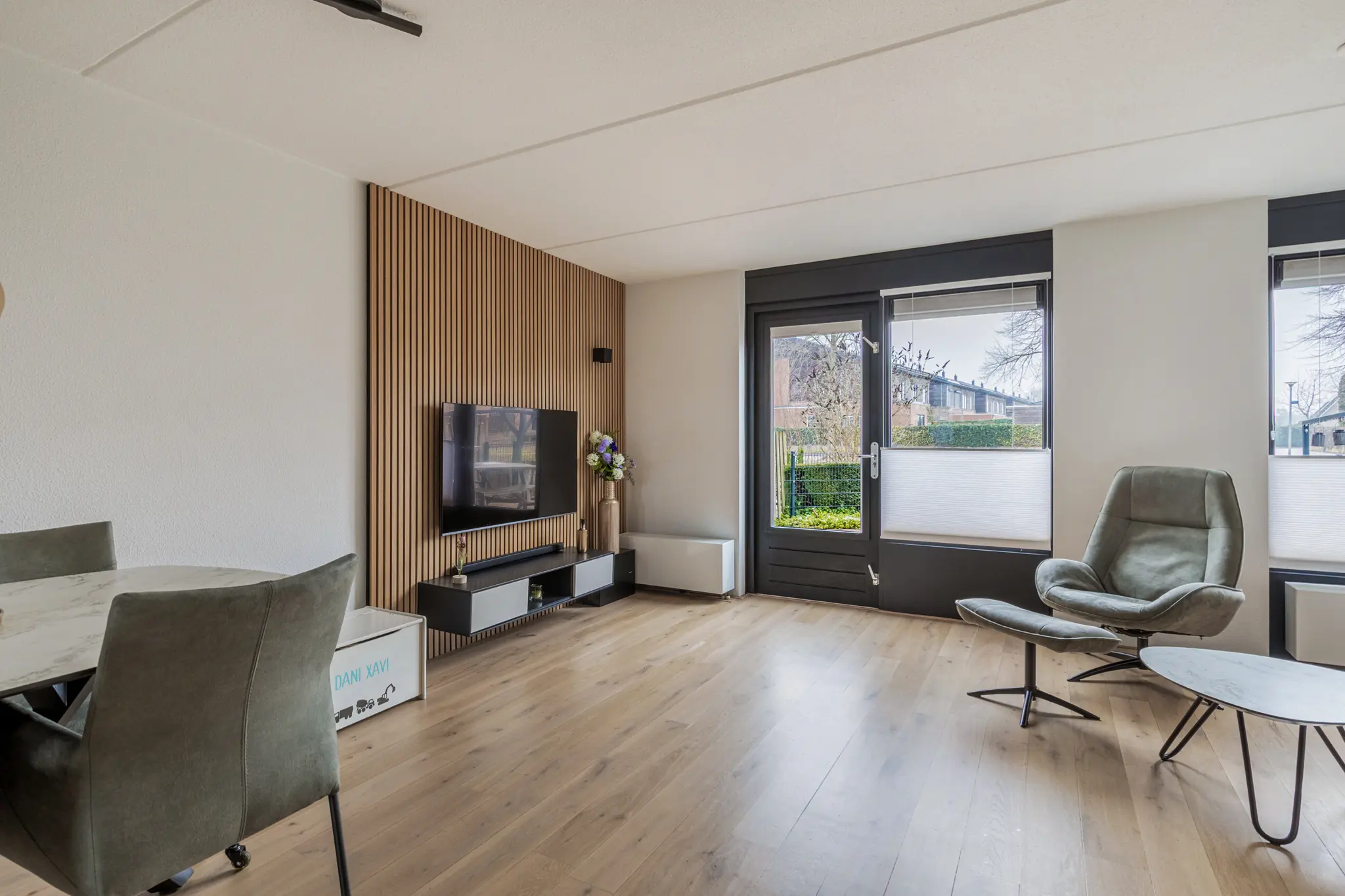 Entree/hal met meterkast en een modern toilet. De lichte en sfeervolle woonkamer is strak en modern afgewerkt en staat in prettig contact met de tuin. Aan de voorzijde bevindt zich de open keuken (2013), uitgerust met diverse inbouwapparatuur, waaronder een in 2022 vernieuwde vaatwasser.