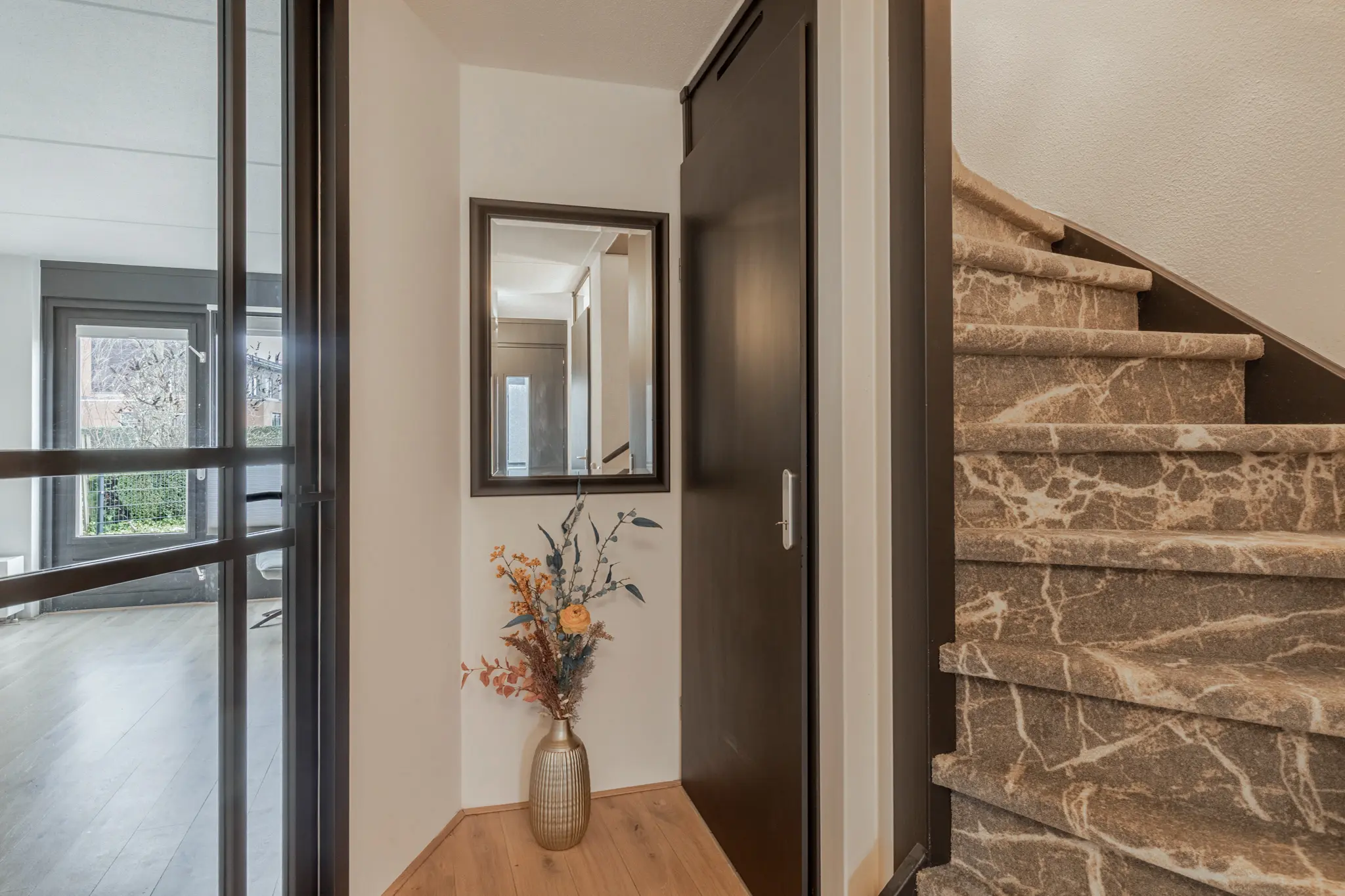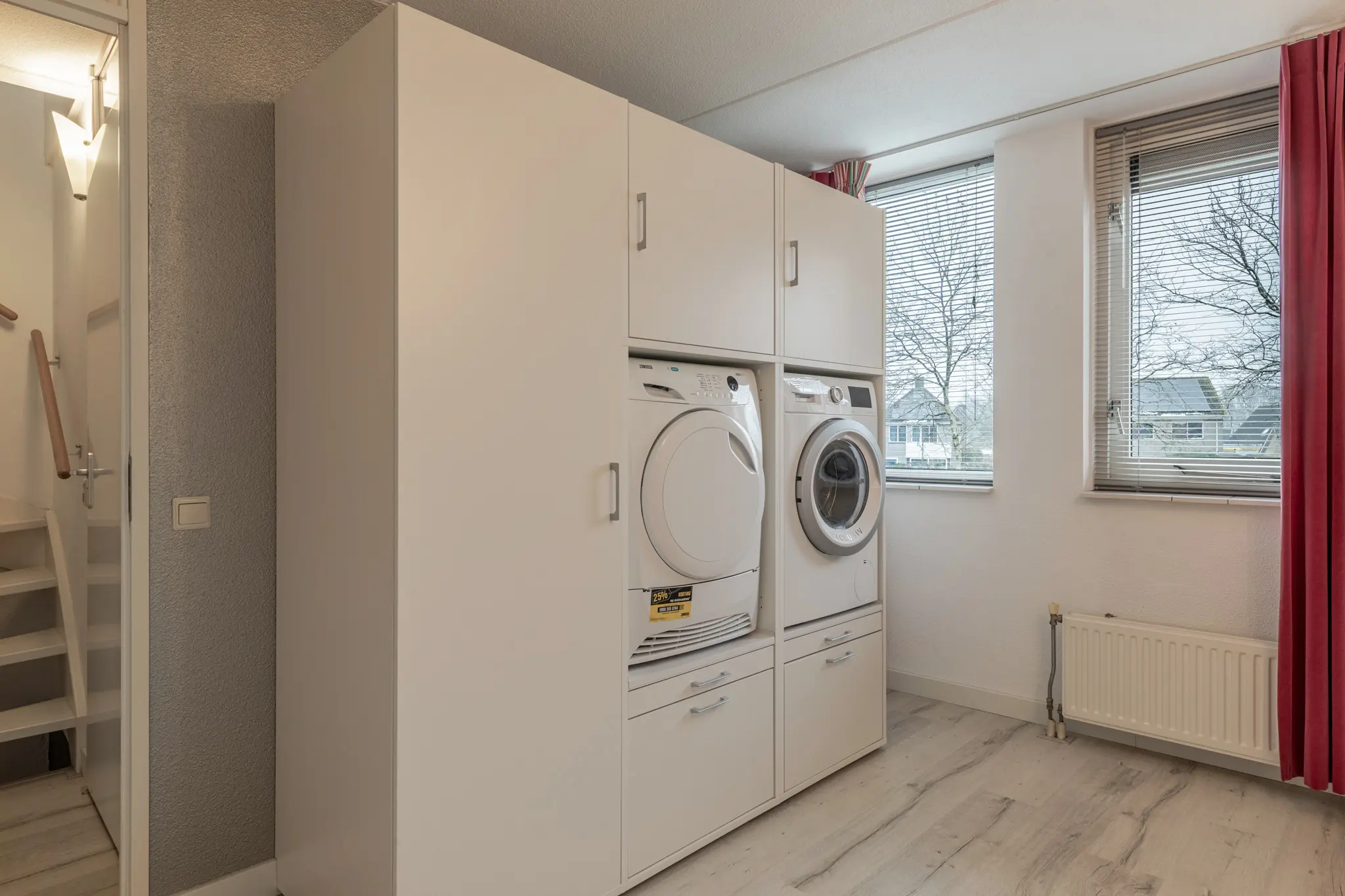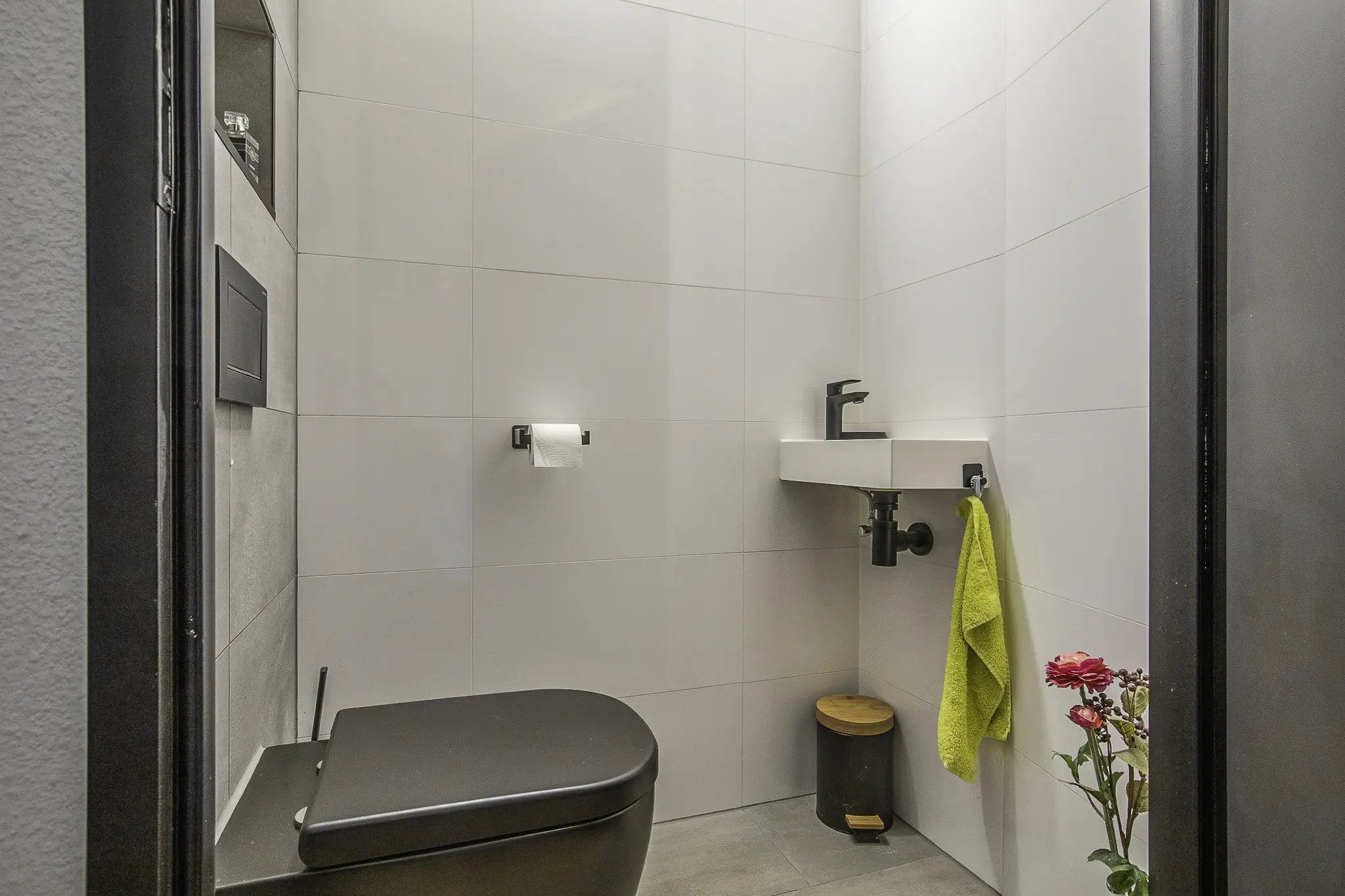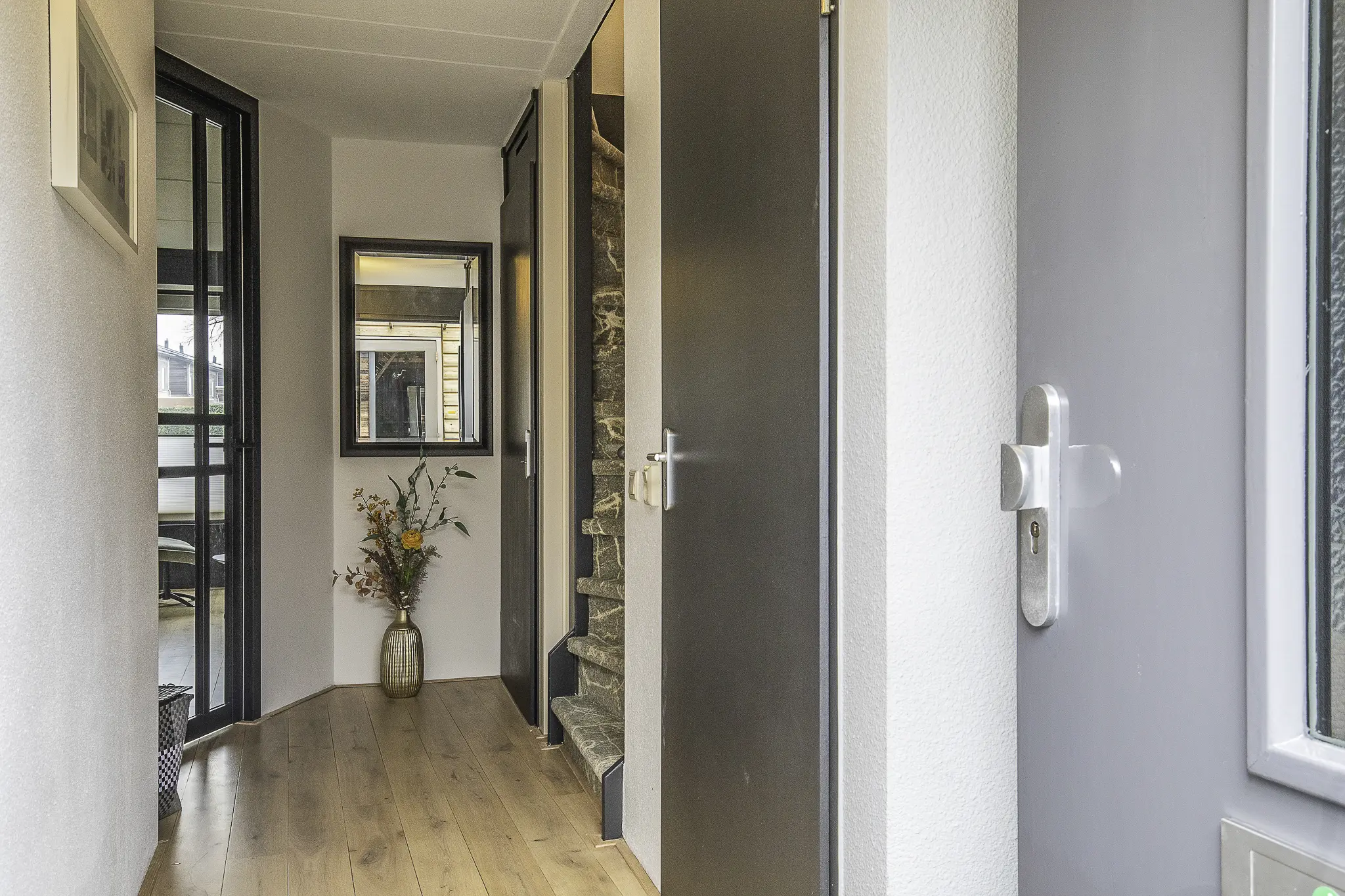 Entree/hal met meterkast en een modern toilet. De lichte en sfeervolle woonkamer is strak en modern afgewerkt en staat in prettig contact met de tuin. Aan de voorzijde bevindt zich de open keuken (2013), uitgerust met diverse inbouwapparatuur, waaronder een in 2022 vernieuwde vaatwasser.