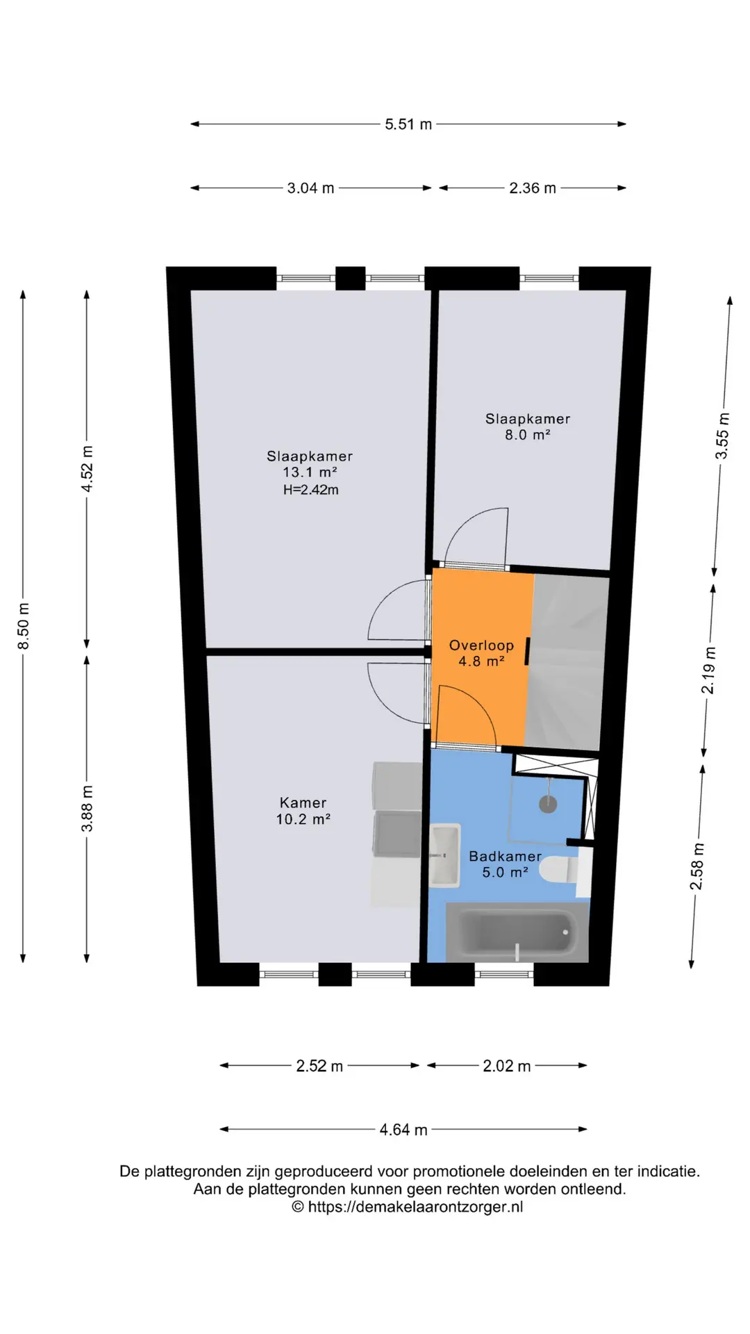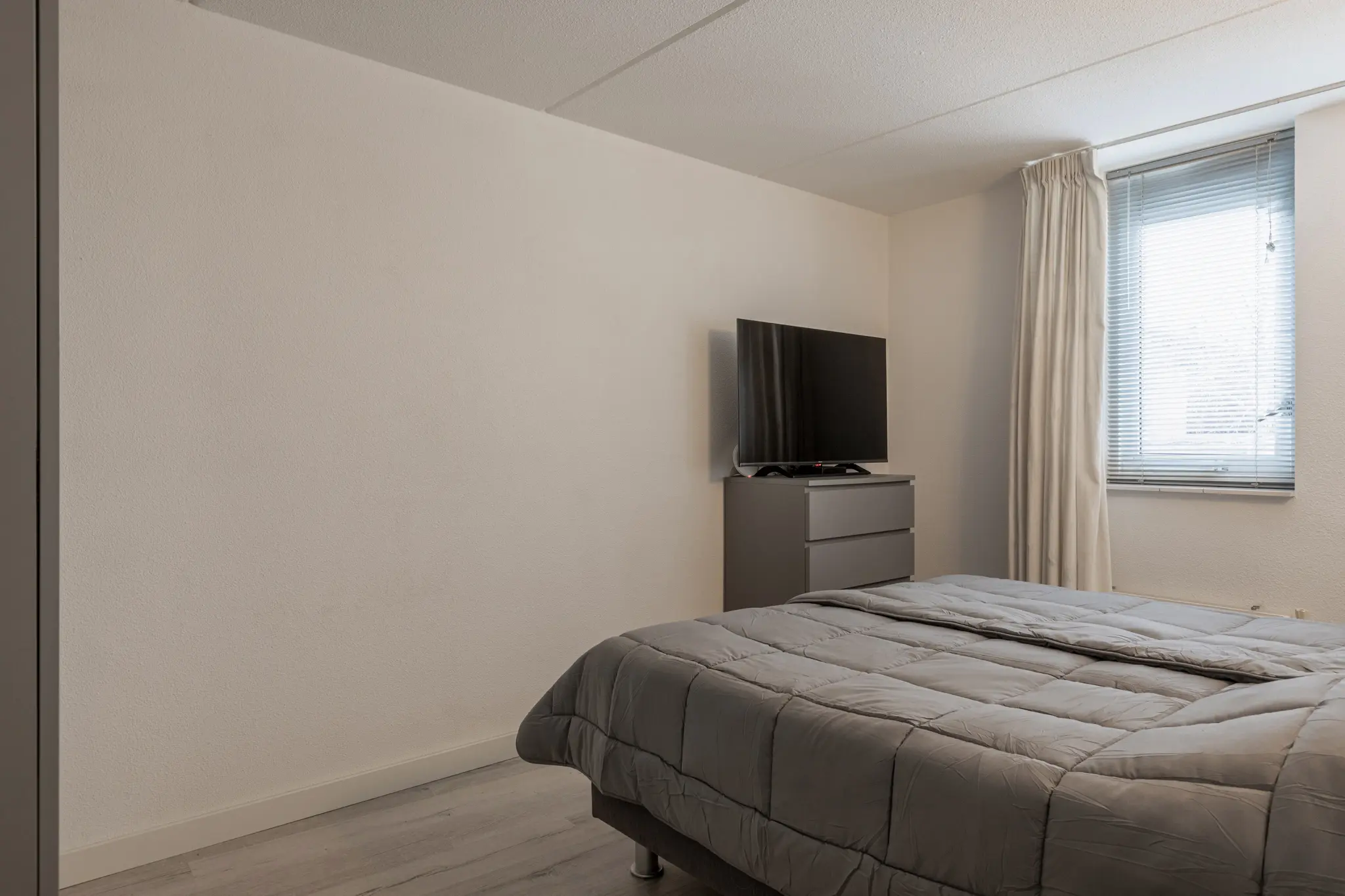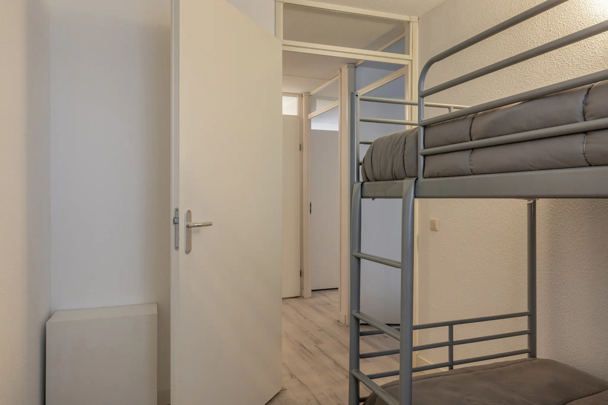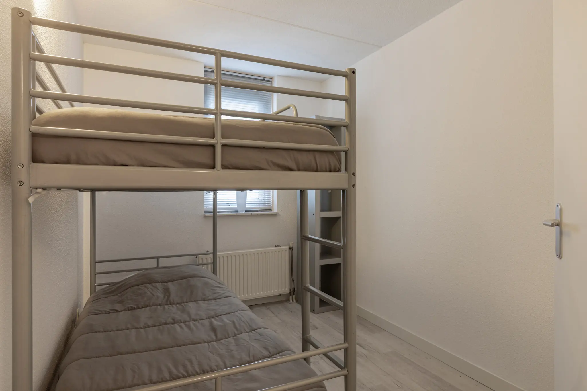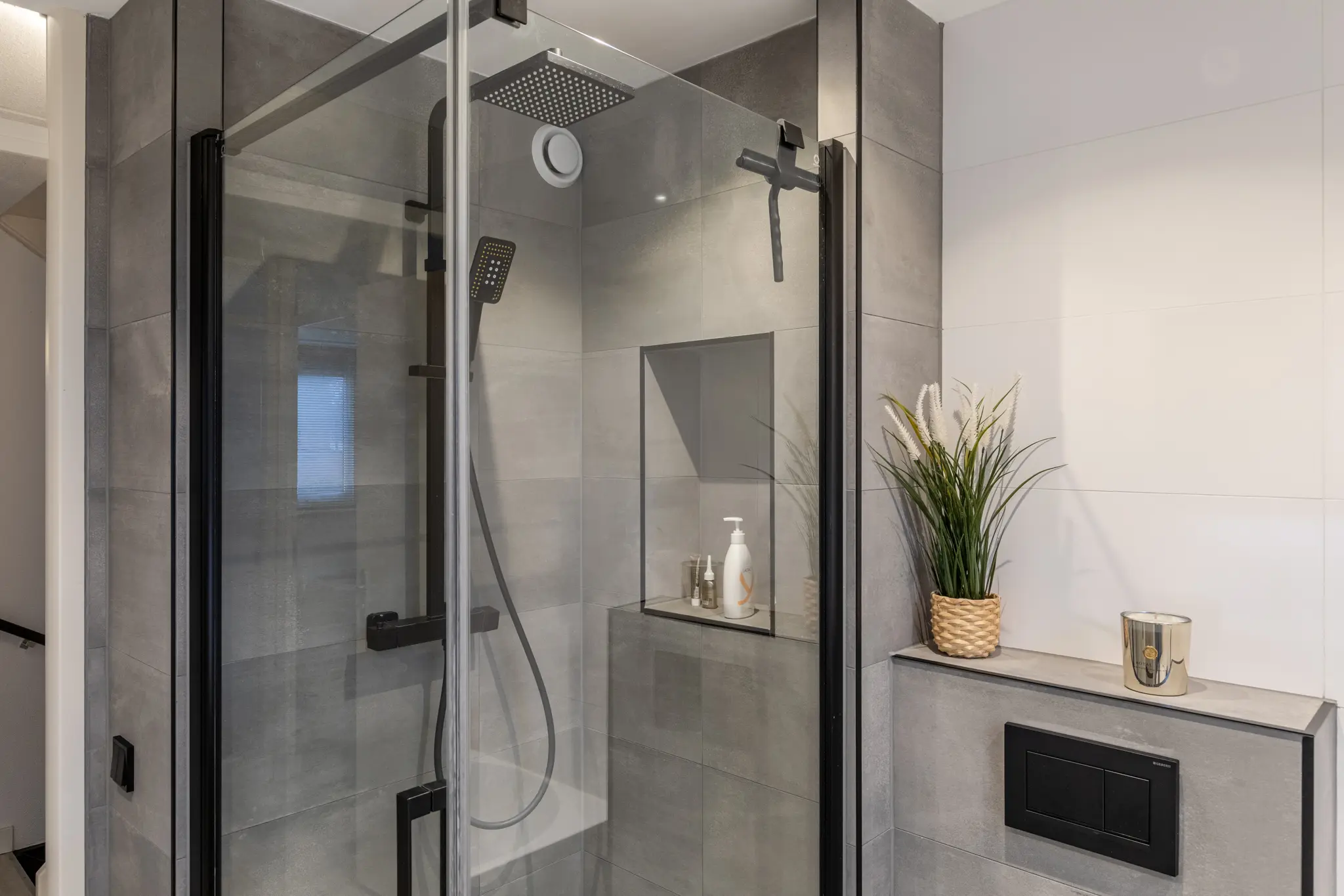 Overloop met toegang tot meerdere slaapkamers en een moderne badkamer (2023). De badkamer is uitgevoerd in eigentijdse materialen en heeft een frisse, verzorgde uitstraling. Deze is voorzien van een ligbad, douche, toilet en een wastafelmeubel. In één van de slaapkamers bevindt zich een kast met witgoedopstelling.