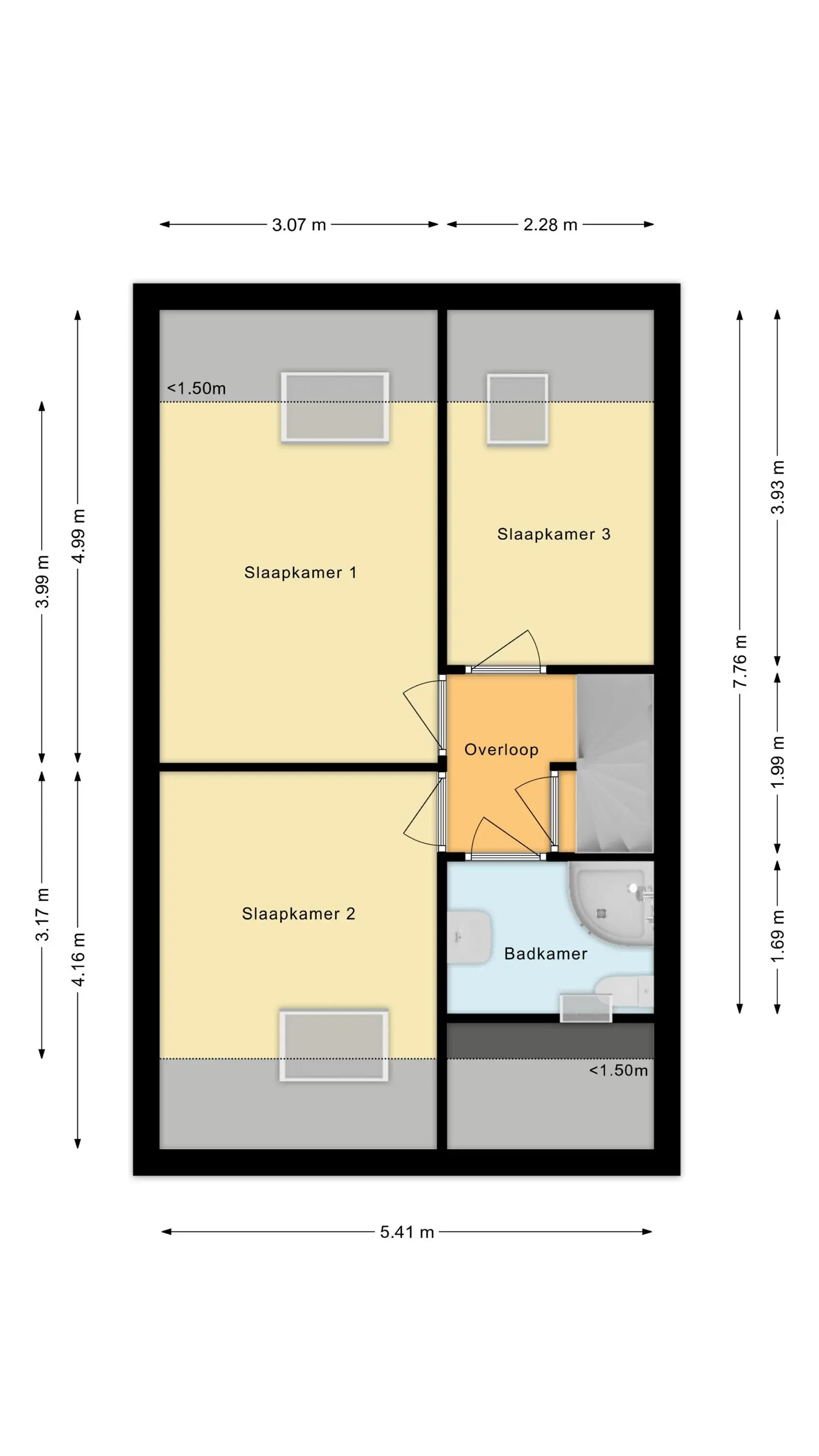 Op de eerste verdieping bevinden zich drie slaapkamers van goed formaat. De kamers zijn praktisch in te delen en geschikt voor diverse doeleinden. De badkamer is voorzien van een douche, wastafel en toilet.