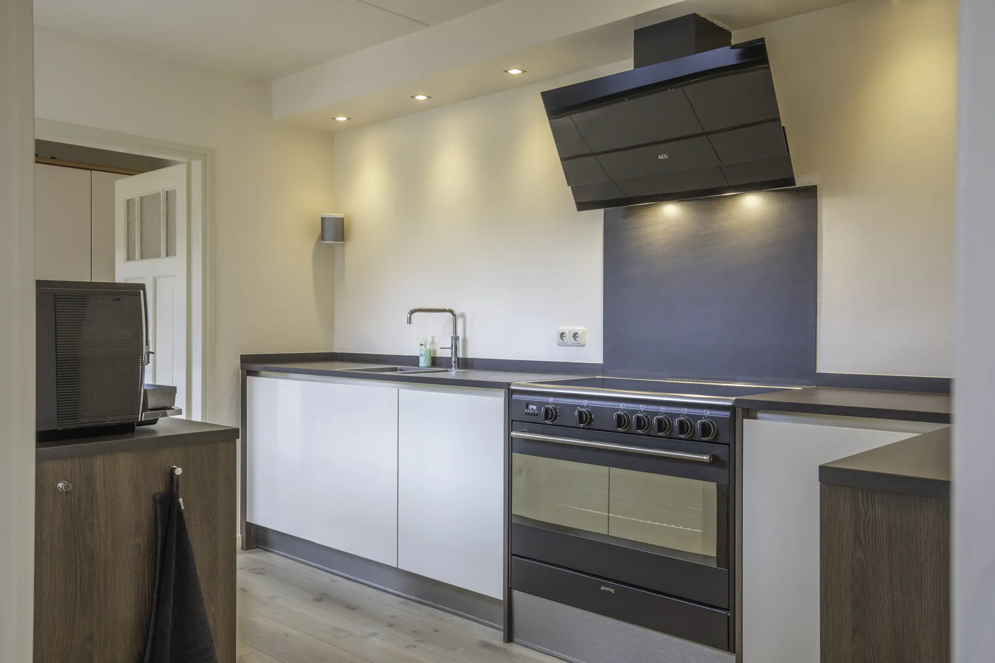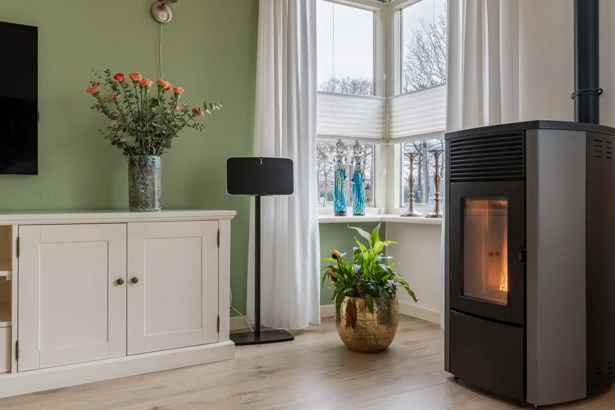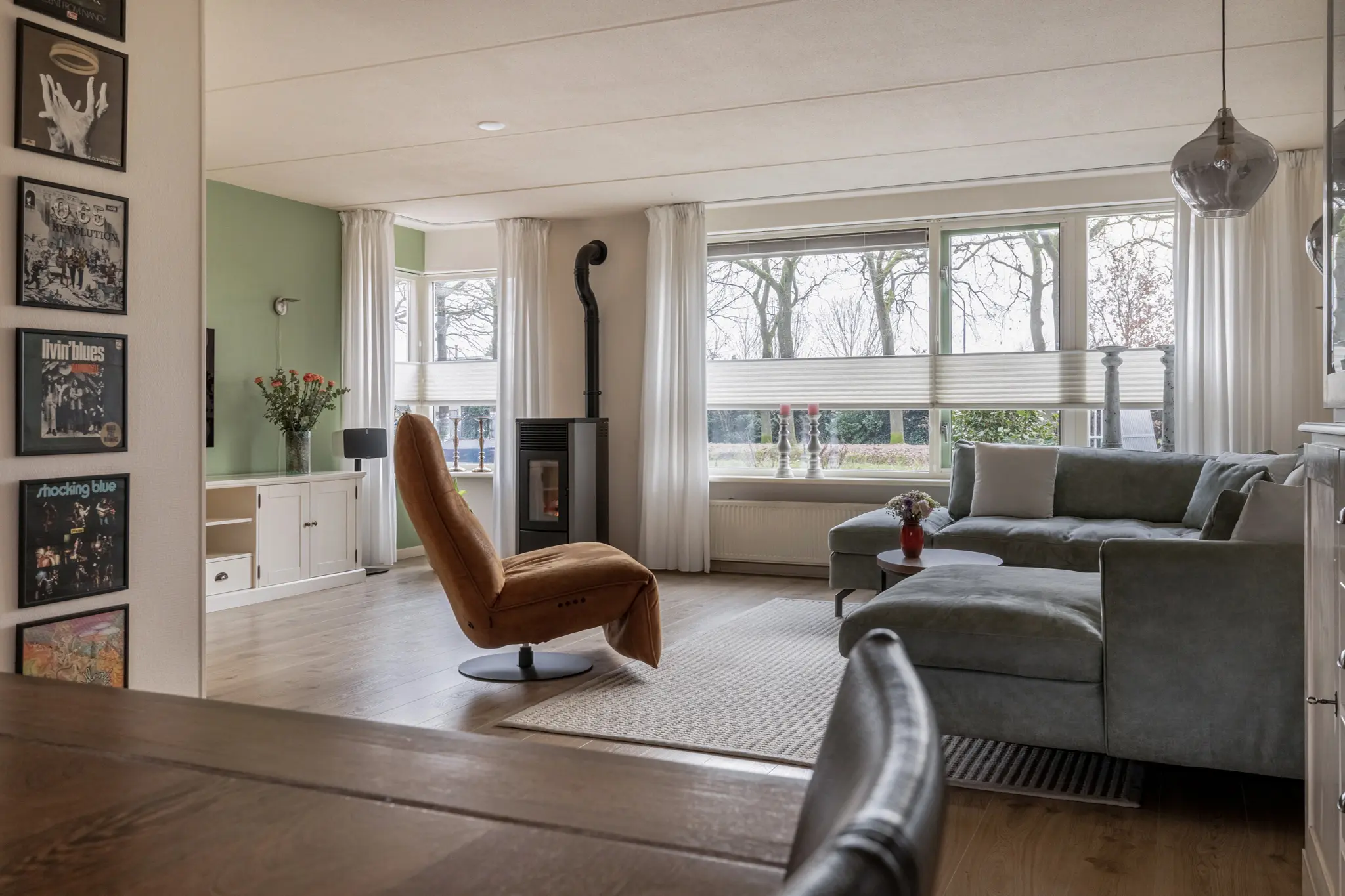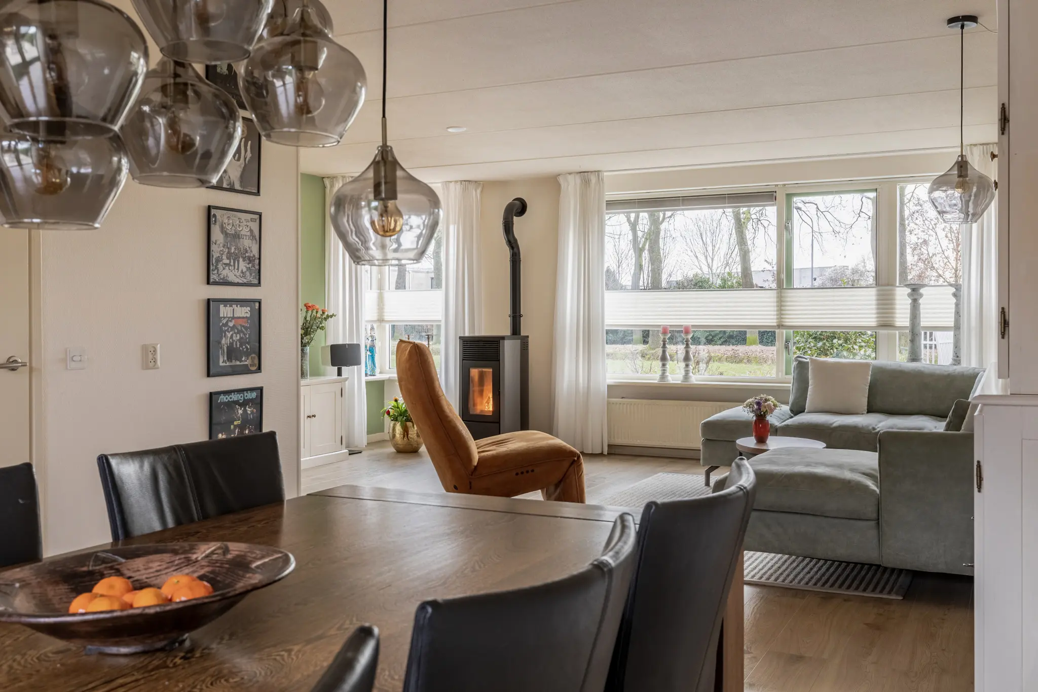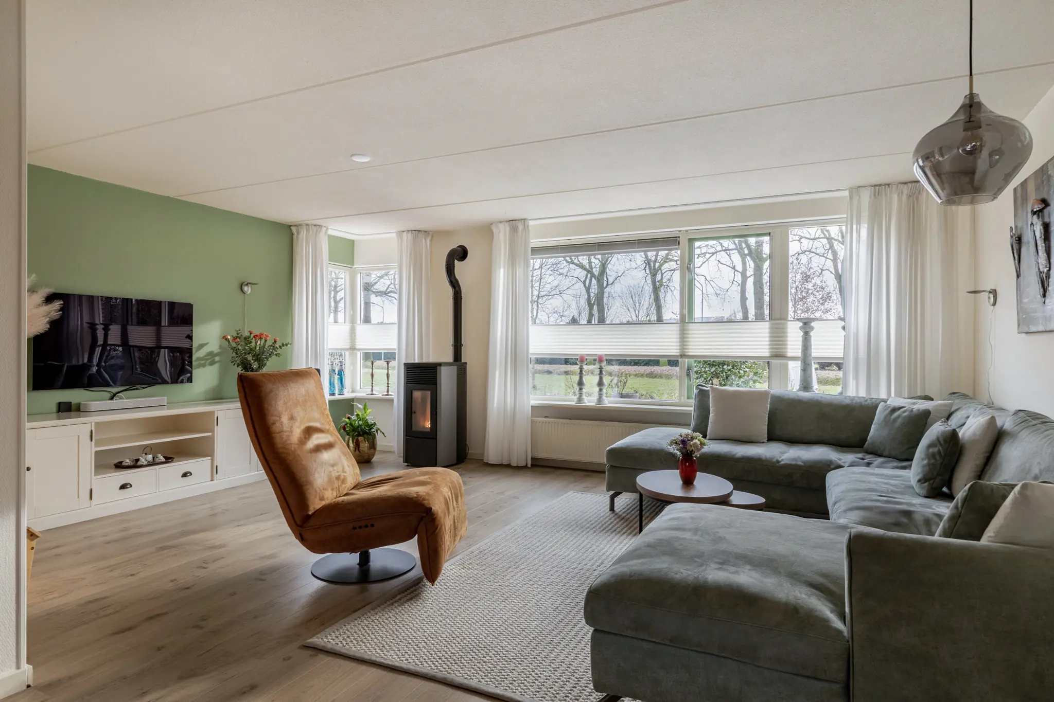 Entree in de hal met trapopgang en toegang tot de royale woonkamer. De woonkamer is heerlijk licht en ruim van opzet en voorzien van een sfeervolle pelletkachel, die niet alleen warmte maar ook extra wooncomfort biedt. Aan de achterzijde bevindt zich de luxe keuken (2015), uitgevoerd met hoogwaardige inbouwapparatuur, waaronder een Quooker, inductiekookplaat met grote oven, vaatwasser, koel-vriescombinatie en afzuigkap. Vanuit de keuken en woonkamer is er een prettige verbinding met de tuin. Aansluitend bevindt zich de ruime bijkeuken met volop bergruimte en witgoedaansluitingen. Vanuit de bijkeuken is er binnendoor toegang tot de garage, wat zorgt voor extra gemak.