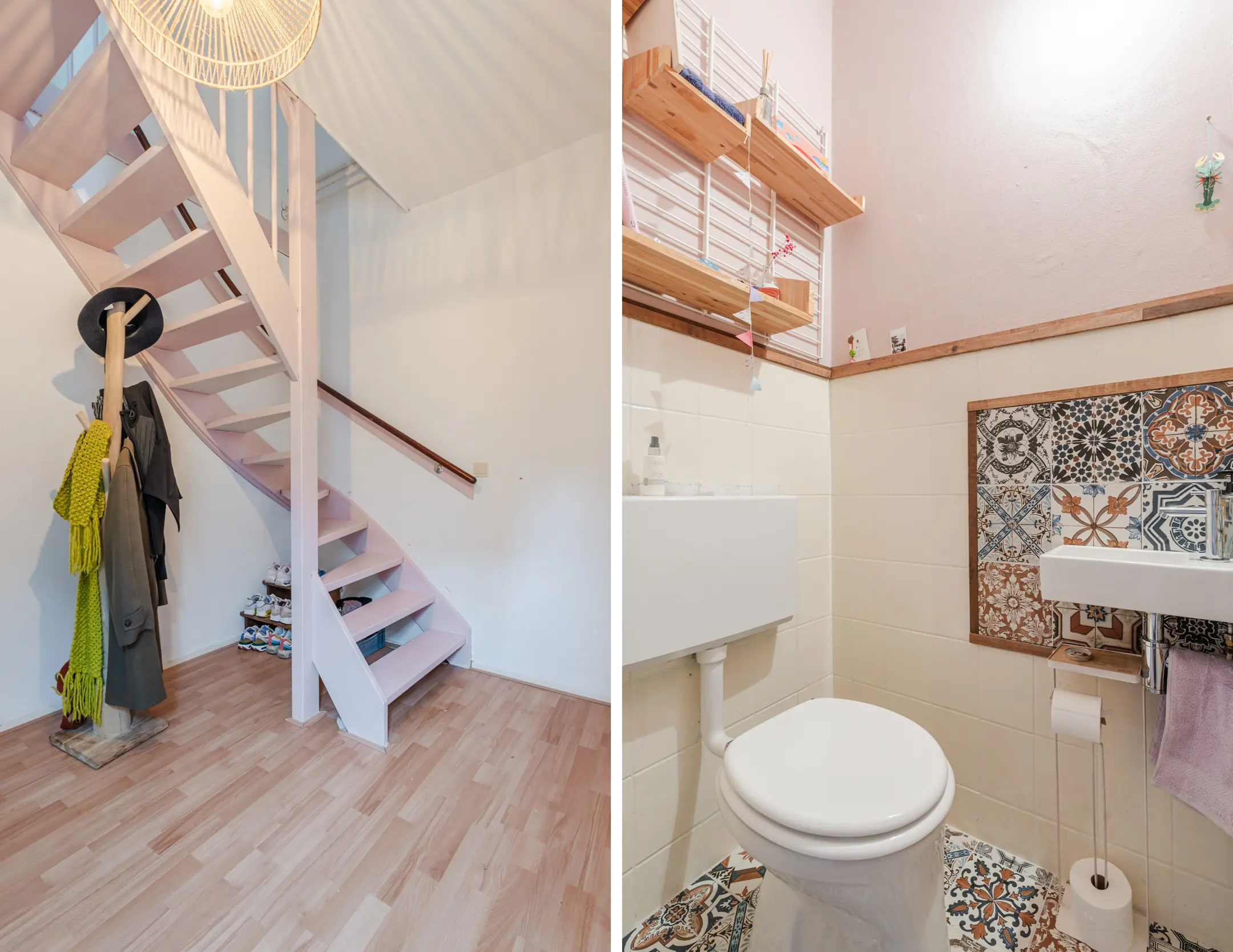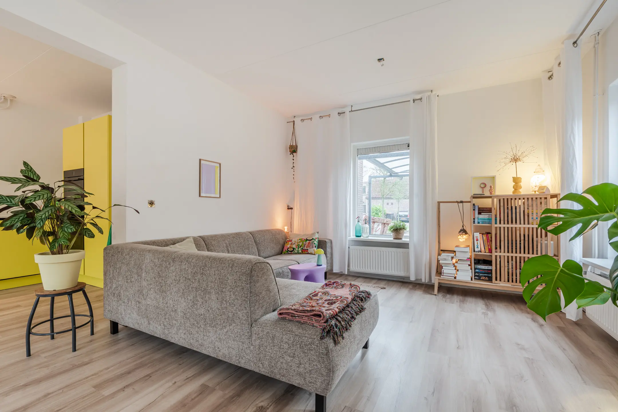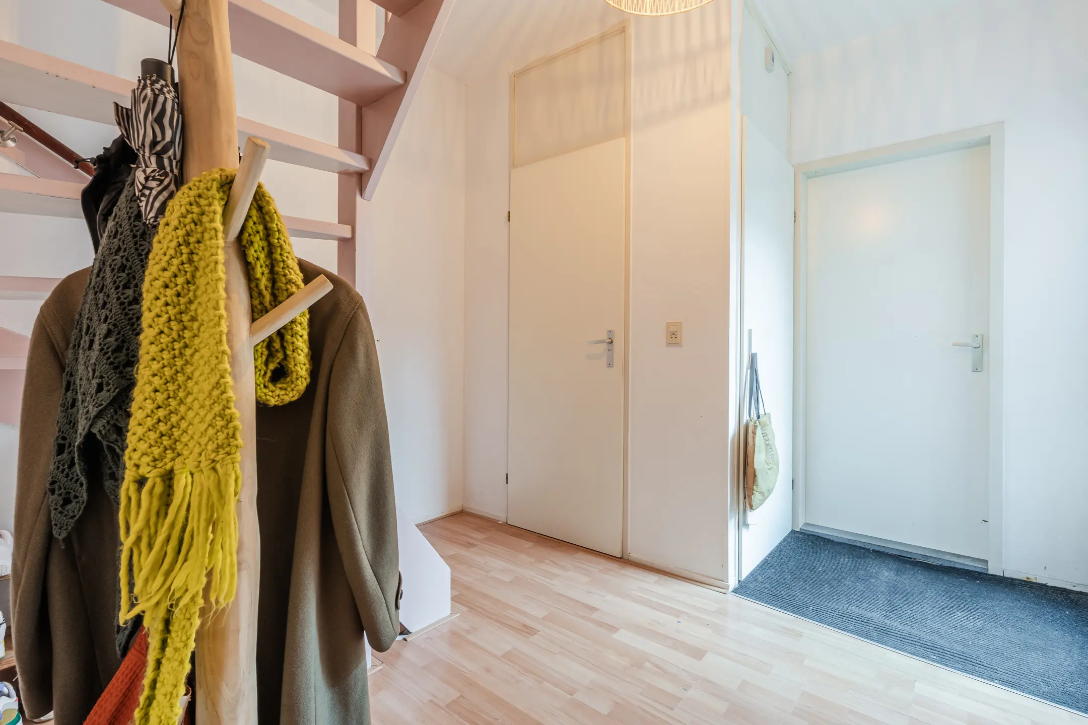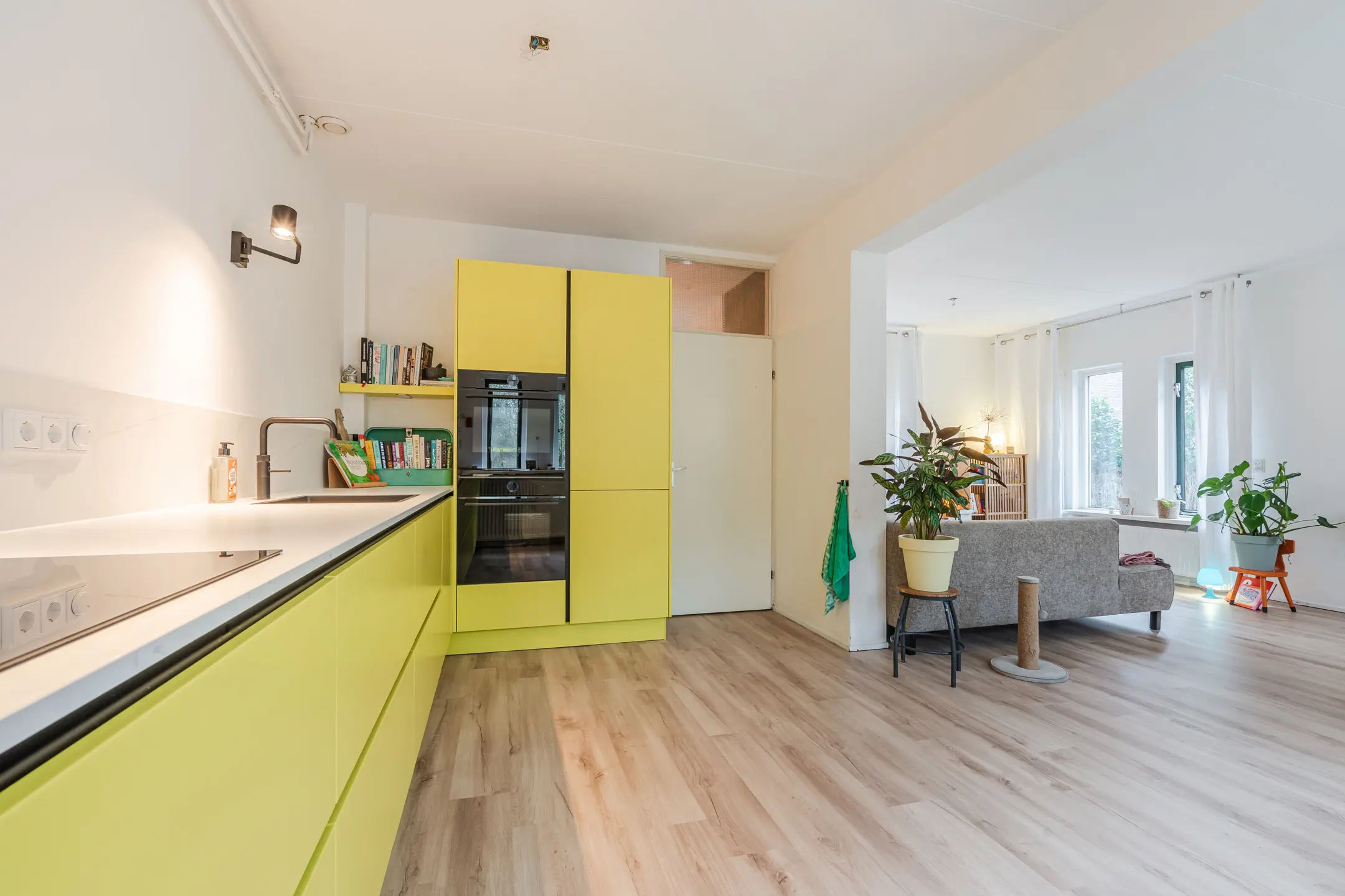 Entree/hal met toilet, meterkast en trapopgang. Vanuit hier toegang tot de lichte woonkamer en de open keuken, die in 2023 volledig is vernieuwd en is voorzien van moderne inbouwapparatuur. Via de woonkamer bereikt u de achtertuin. De inpandige stenen berging is zowel van binnenuit als buitenom bereikbaar.