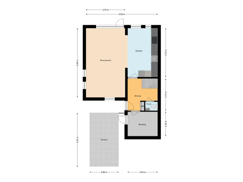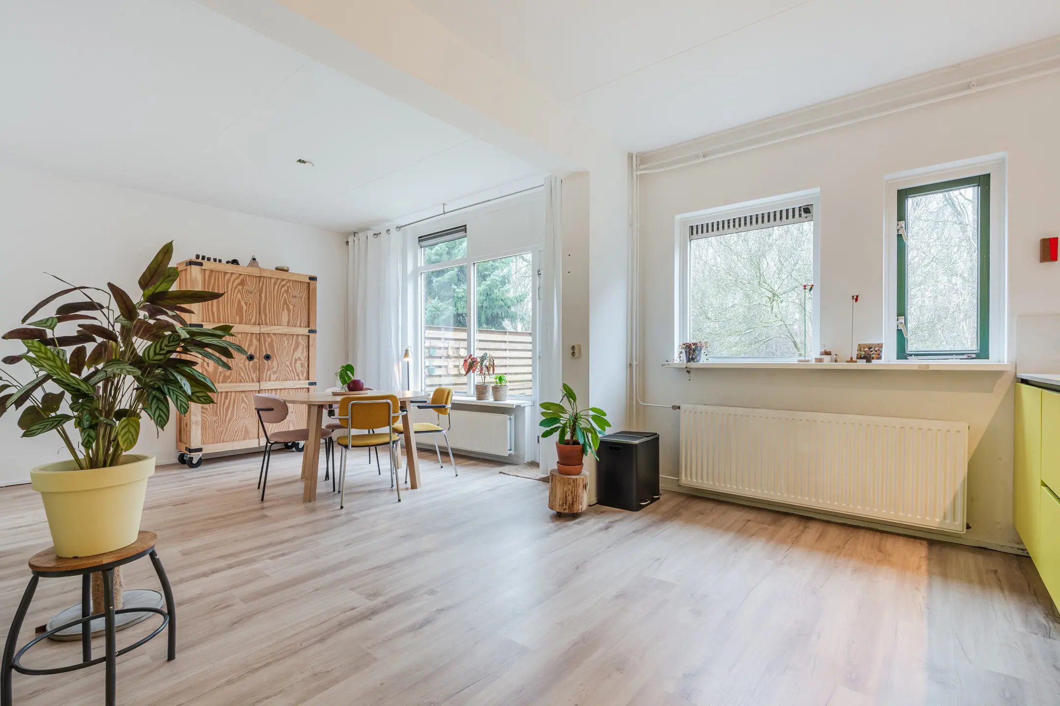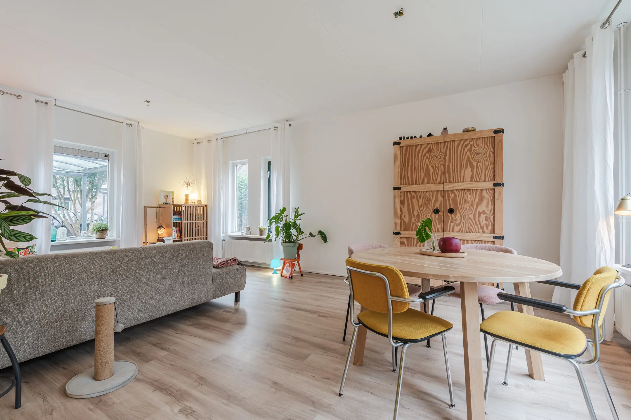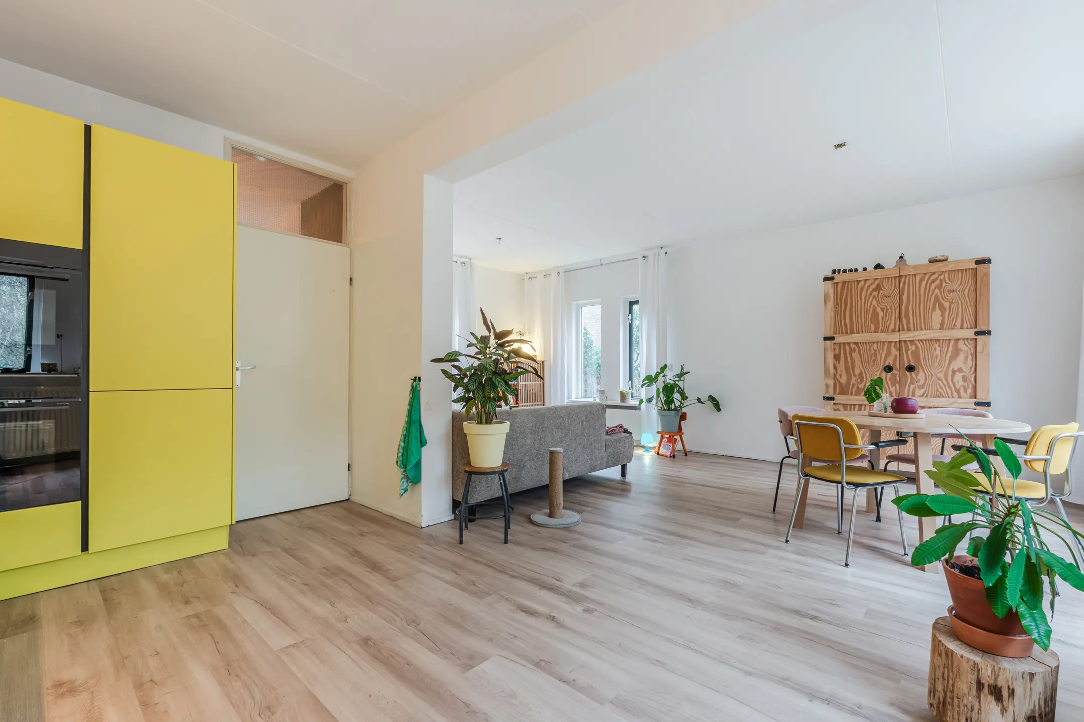 Entree/hal met toilet, meterkast en trapopgang. Vanuit hier toegang tot de lichte woonkamer en de open keuken, die in 2023 volledig is vernieuwd en is voorzien van moderne inbouwapparatuur. Via de woonkamer bereikt u de achtertuin. De inpandige stenen berging is zowel van binnenuit als buitenom bereikbaar.
