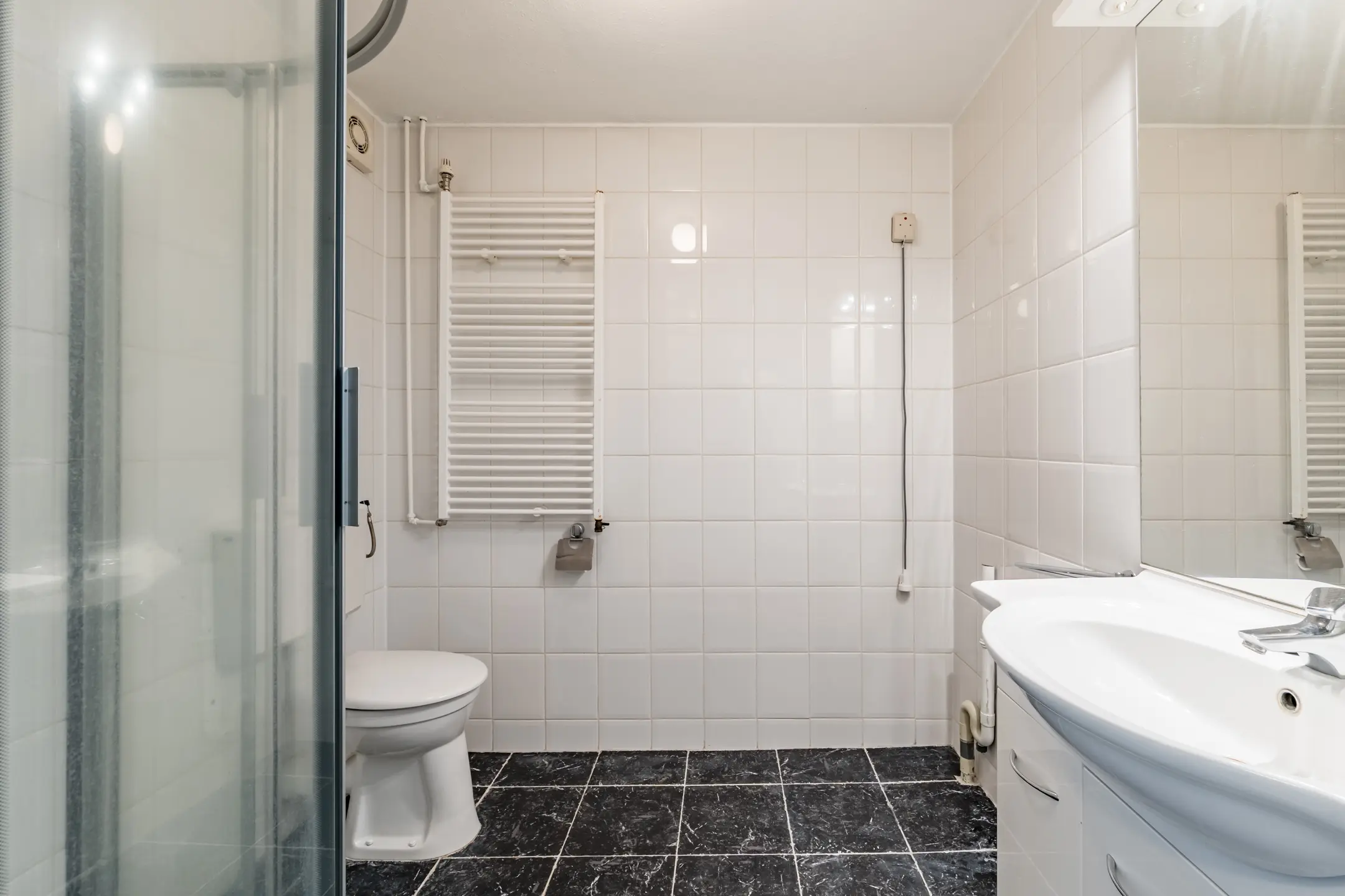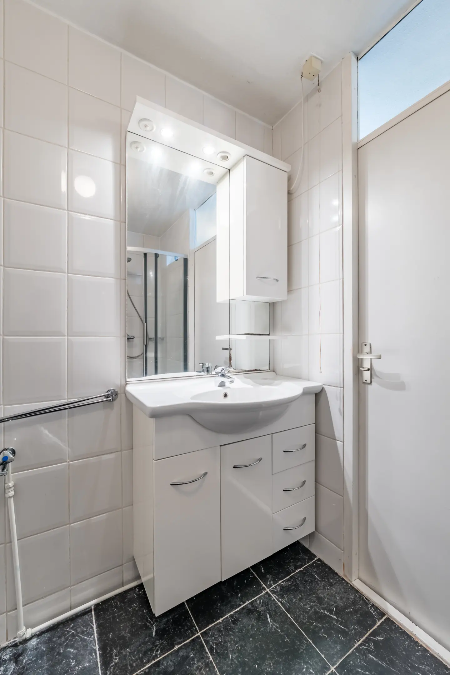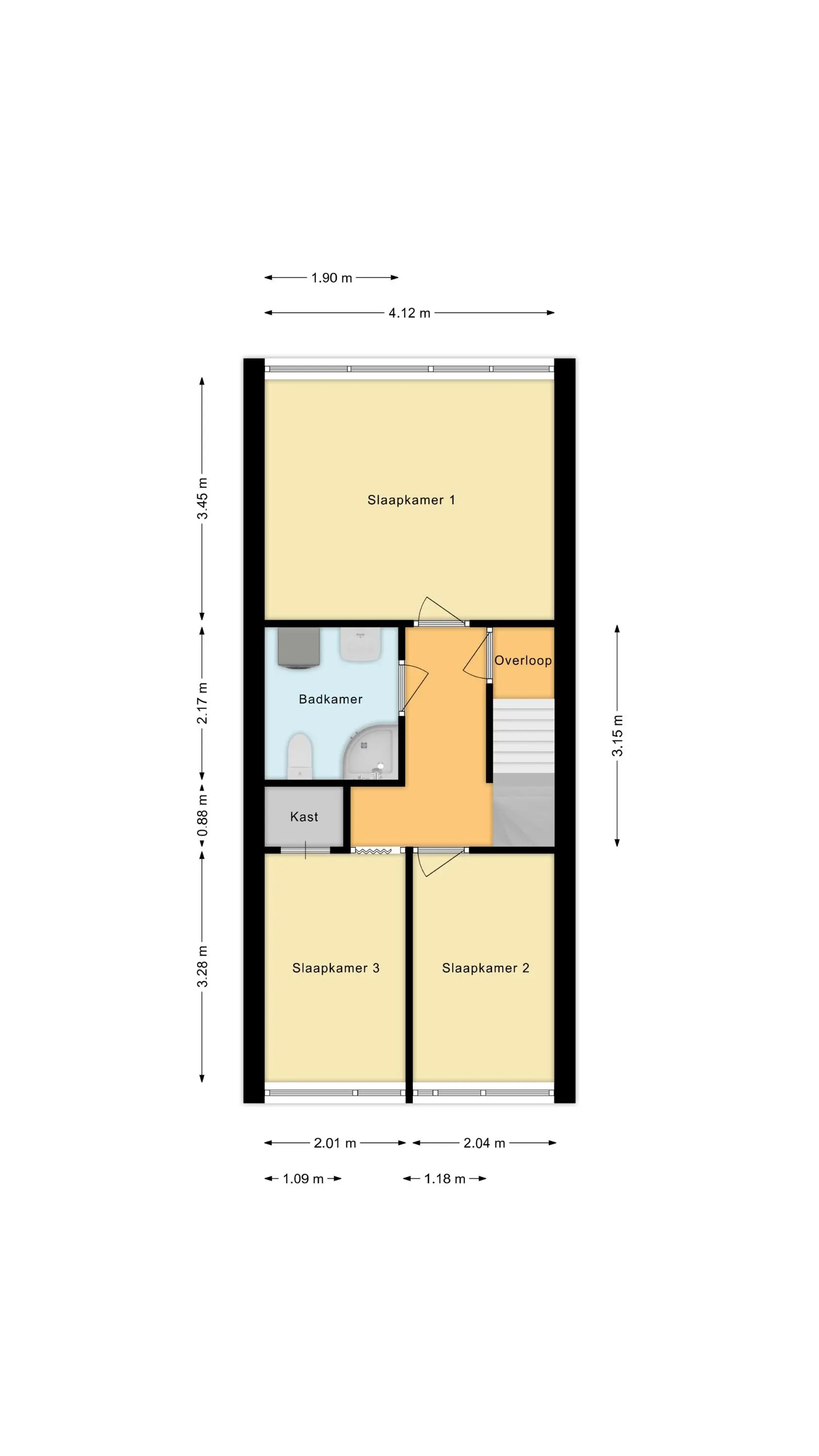 Overloop met drie slaapkamers en een badkamer met douchehoek, wastafelmeubel, toilet, ventilatie en aansluiting voor de wasmachine.