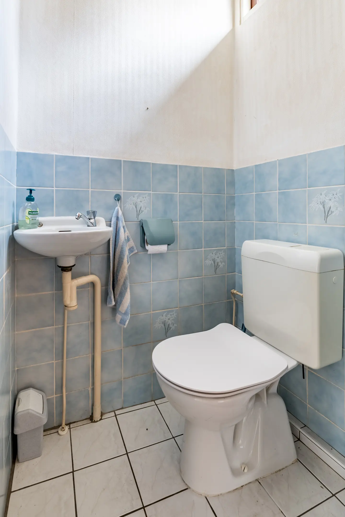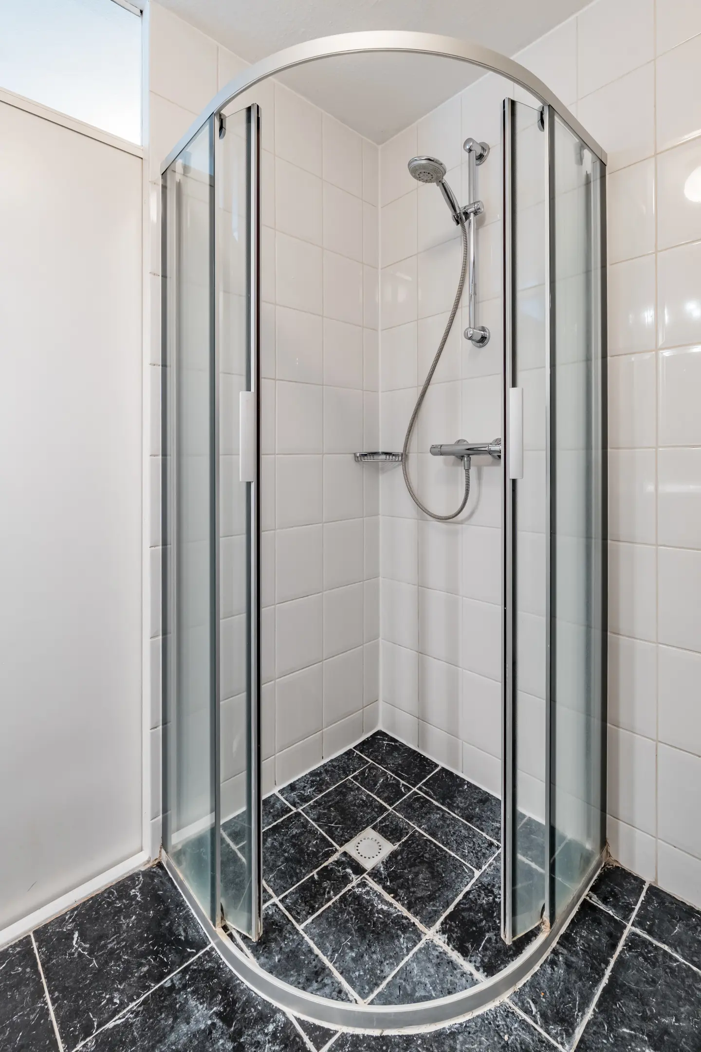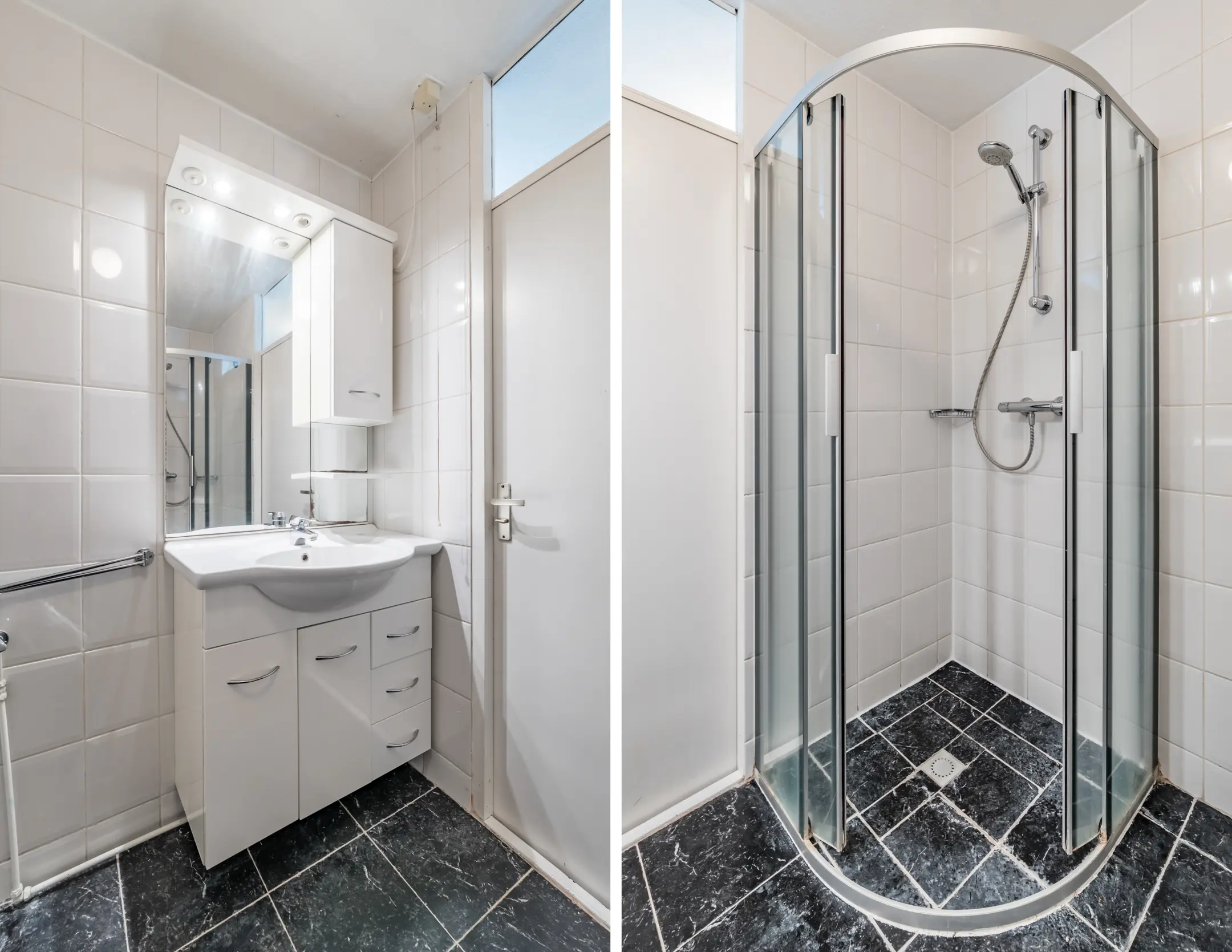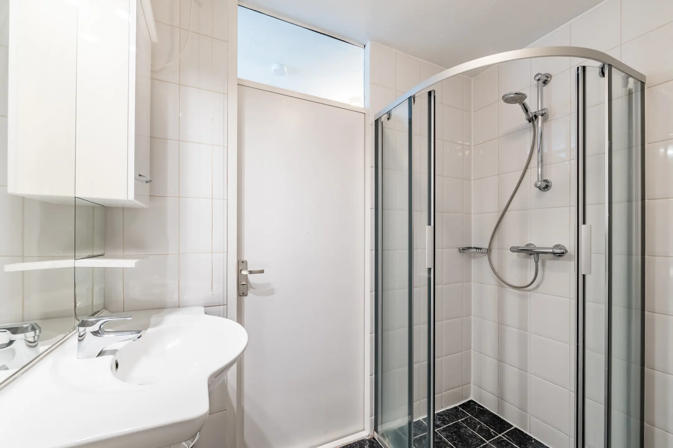 Overloop met drie slaapkamers en een badkamer met douchehoek, wastafelmeubel, toilet, ventilatie en aansluiting voor de wasmachine.