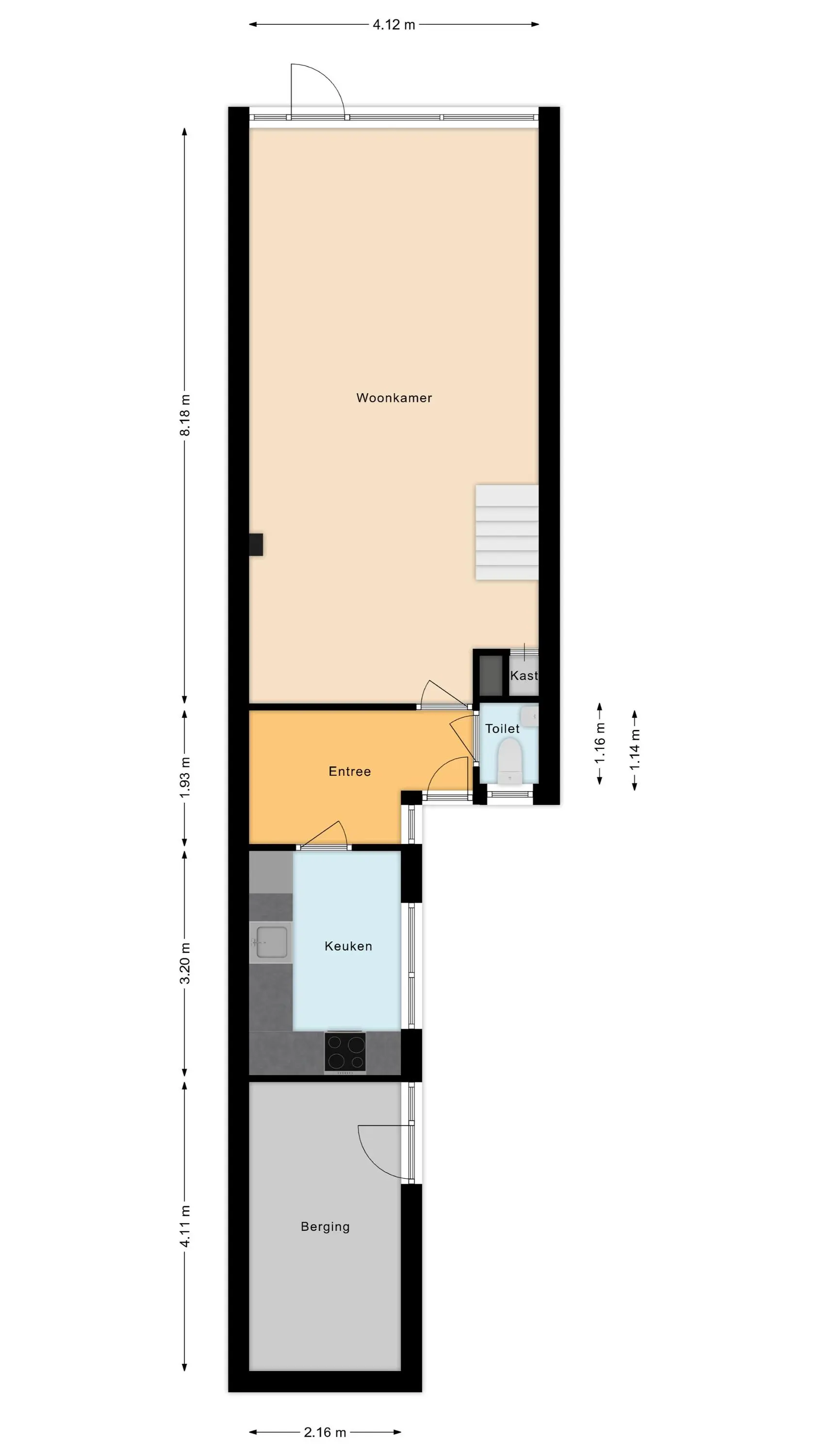 Entree in hal met toilet en toegang tot de keuken. De keuken is aangebouwd midden jaren 80 en in 2021 volledig vernieuwd. Vanuit de hal kom je verder in de lichte, tuingerichte woonkamer. Aan de voorzijde van de woning bevindt zich verder een aangebouwde berging.