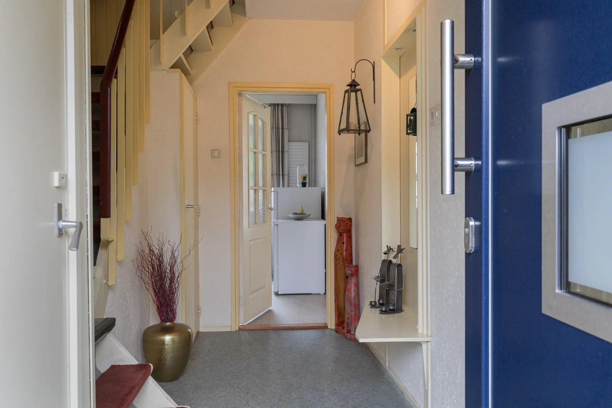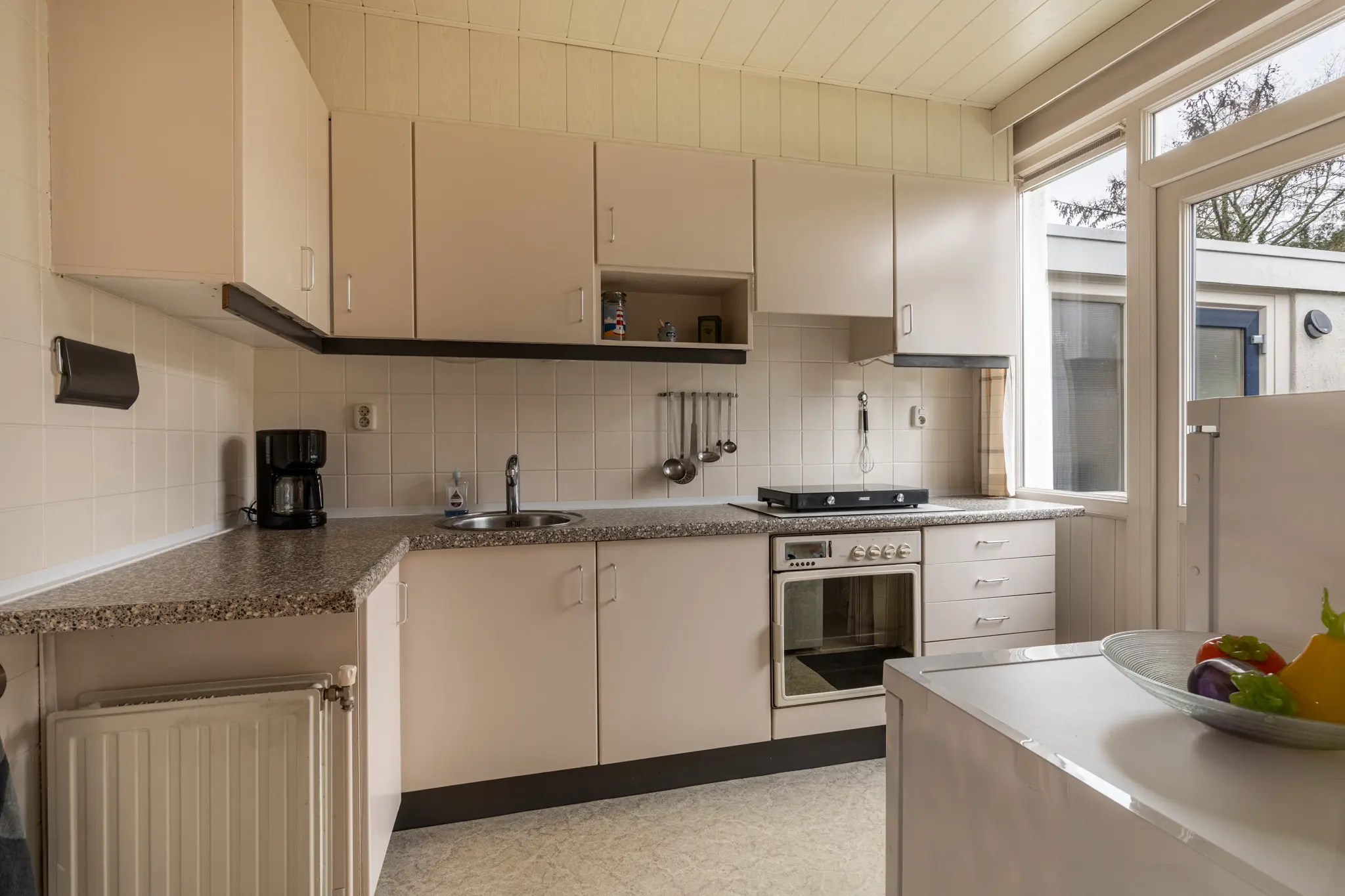 Entree/hal met toilet, trapopgang en praktische bergruimte. Lichte en ruime woonkamer met kachel, grote raampartijen en een schuifpui met directe verbinding naar de tuin, wat zorgt voor veel daglicht en een prettige binnen-buitenbeleving. De schuifpui is voorzien van een hor, waardoor je ook in de zomer comfortabel kunt ventileren. Er is volop ruimte voor een gezellige zit- en eethoek. De keuken staat in verbinding met de woonkamer en biedt eveneens toegang tot de achtertuin.