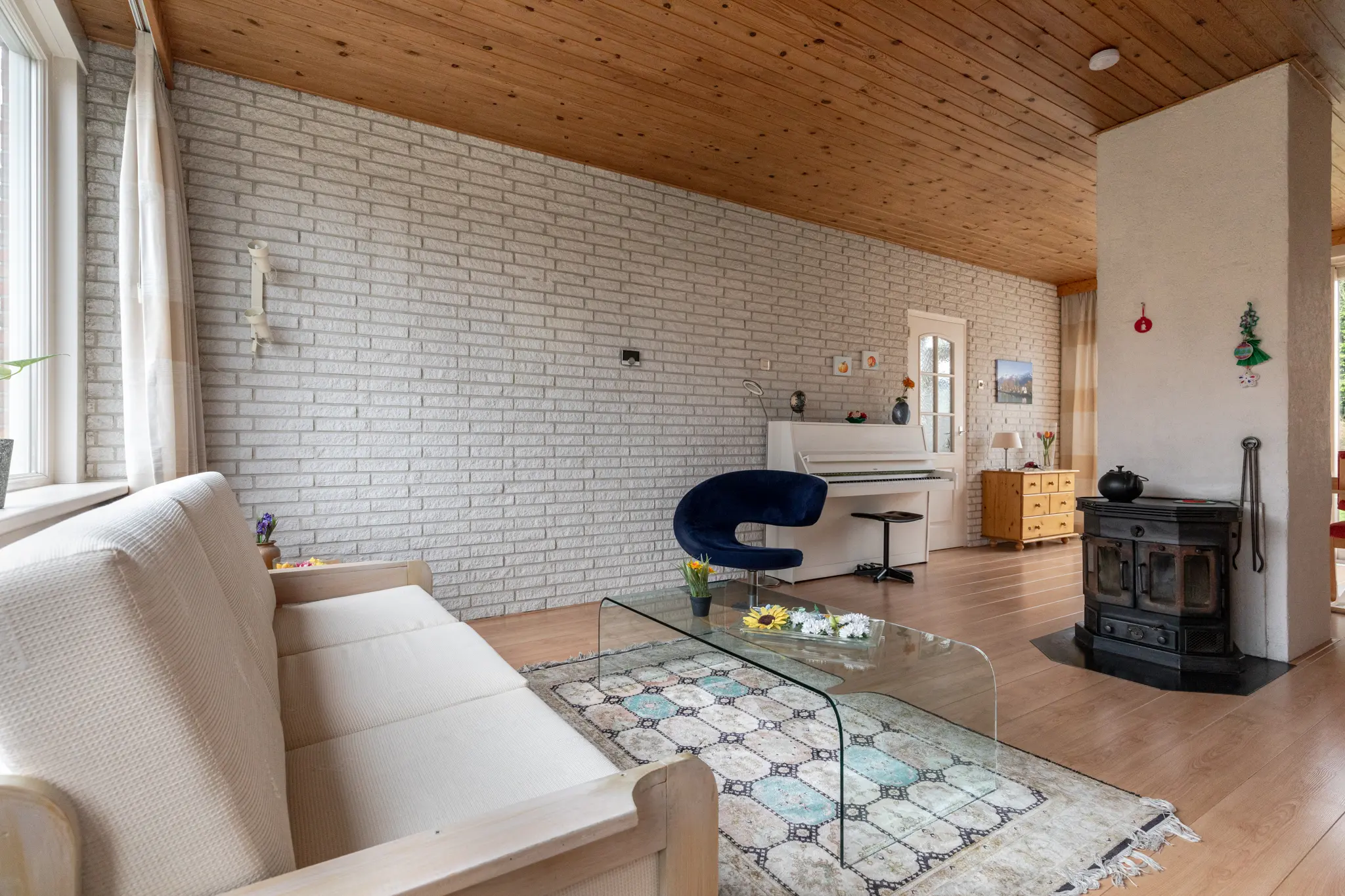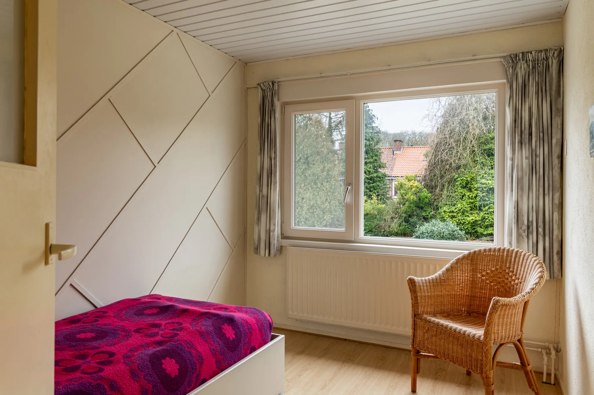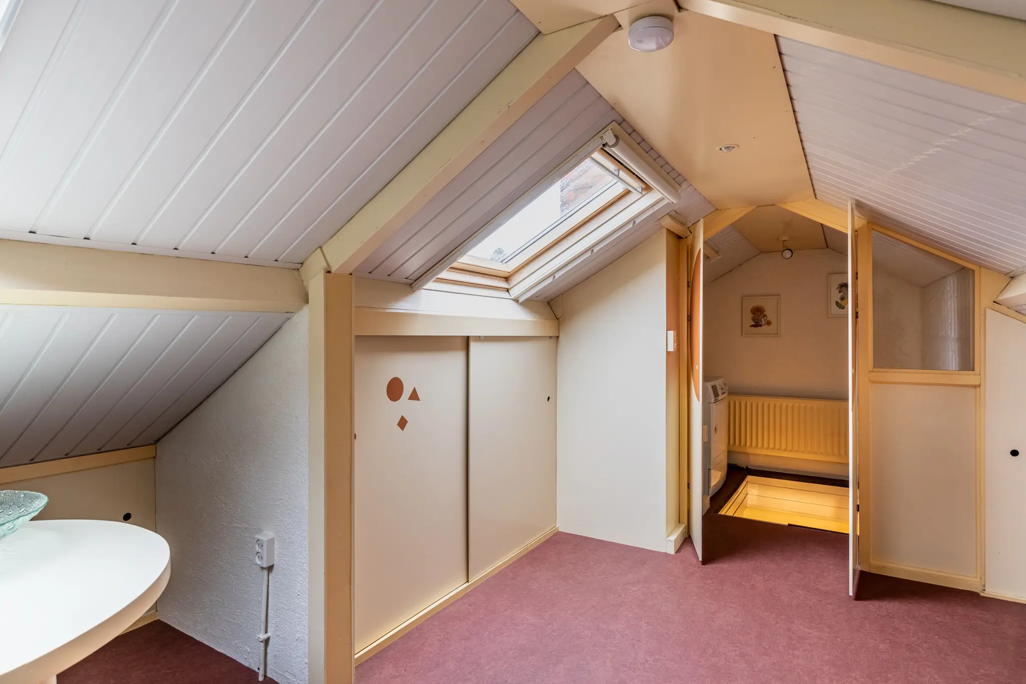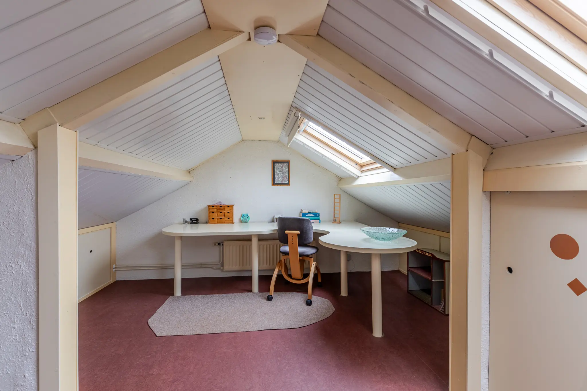 - Het schuine dak is van binnenuit geïsoleerd met circa 6–7 cm glaswol