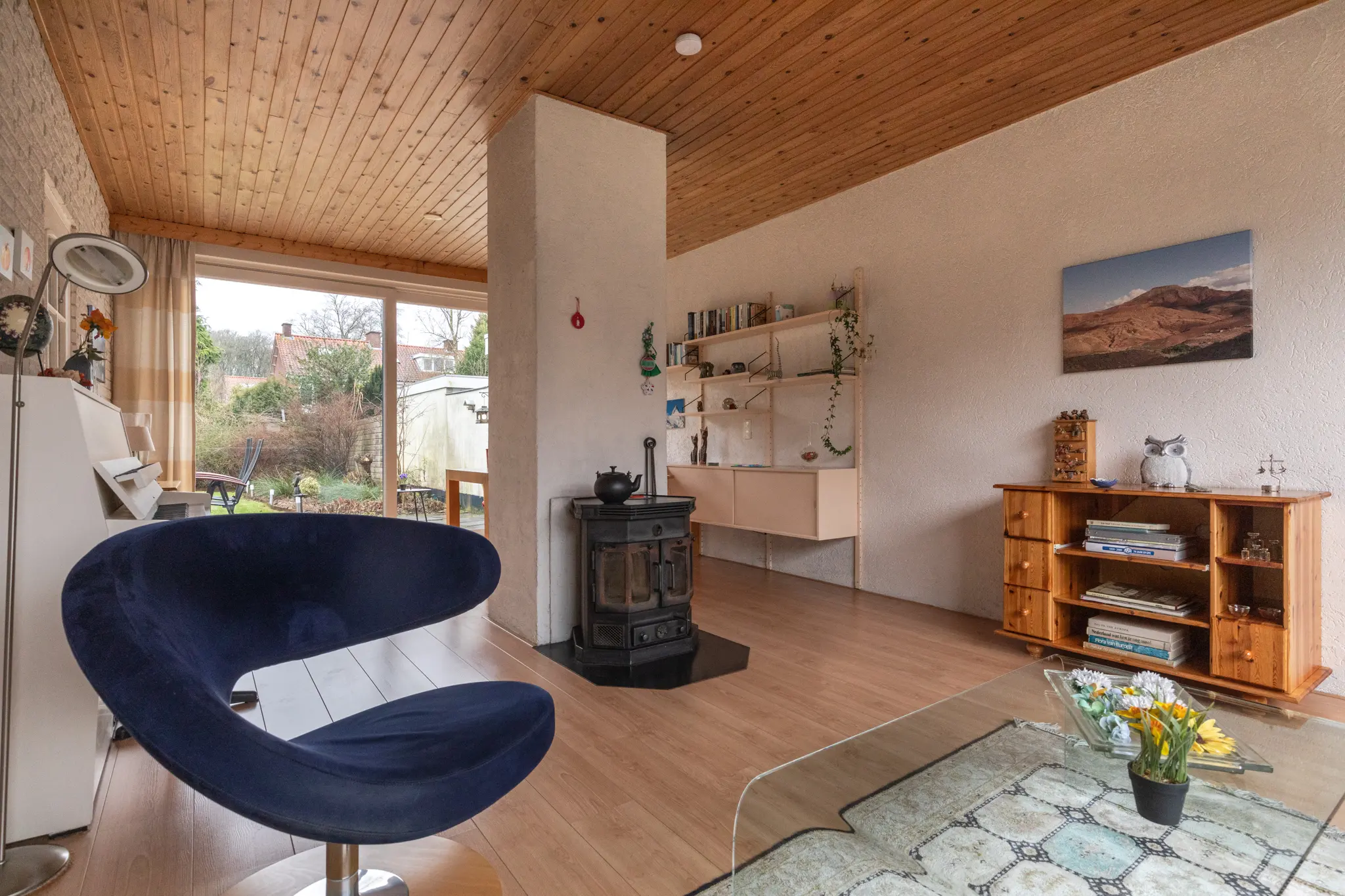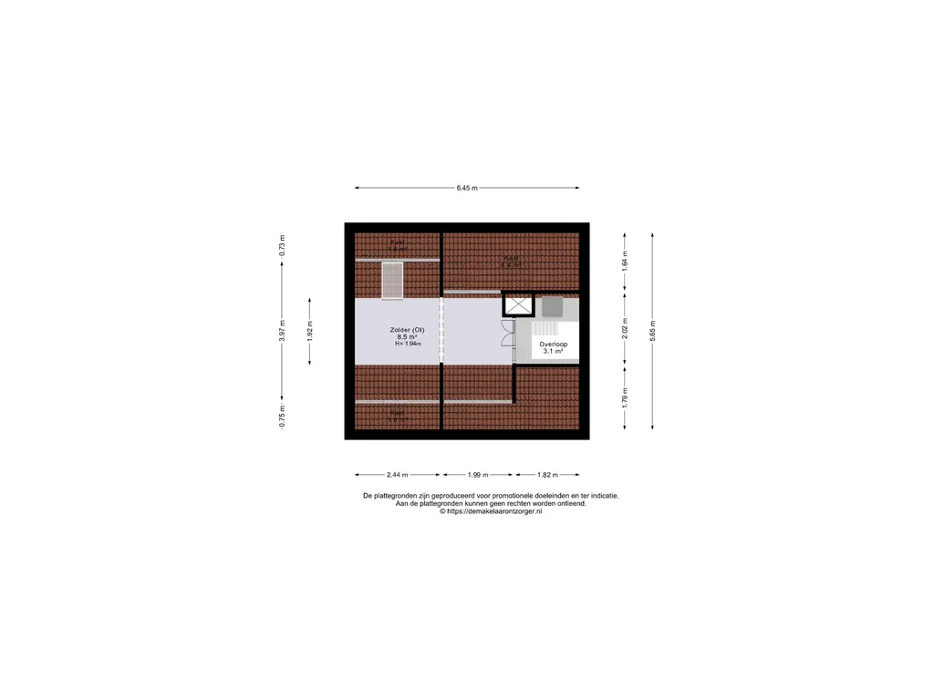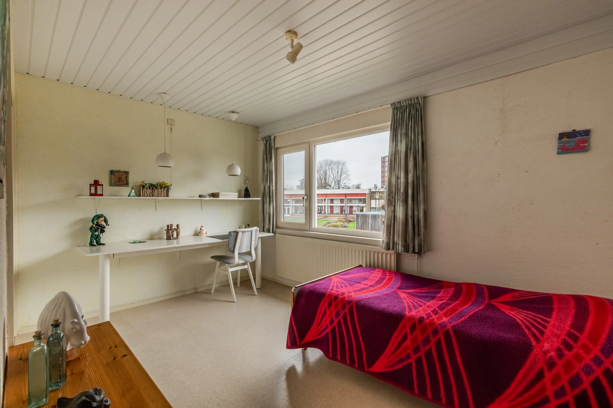 - Het schuine dak is van binnenuit geïsoleerd met circa 6–7 cm glaswol