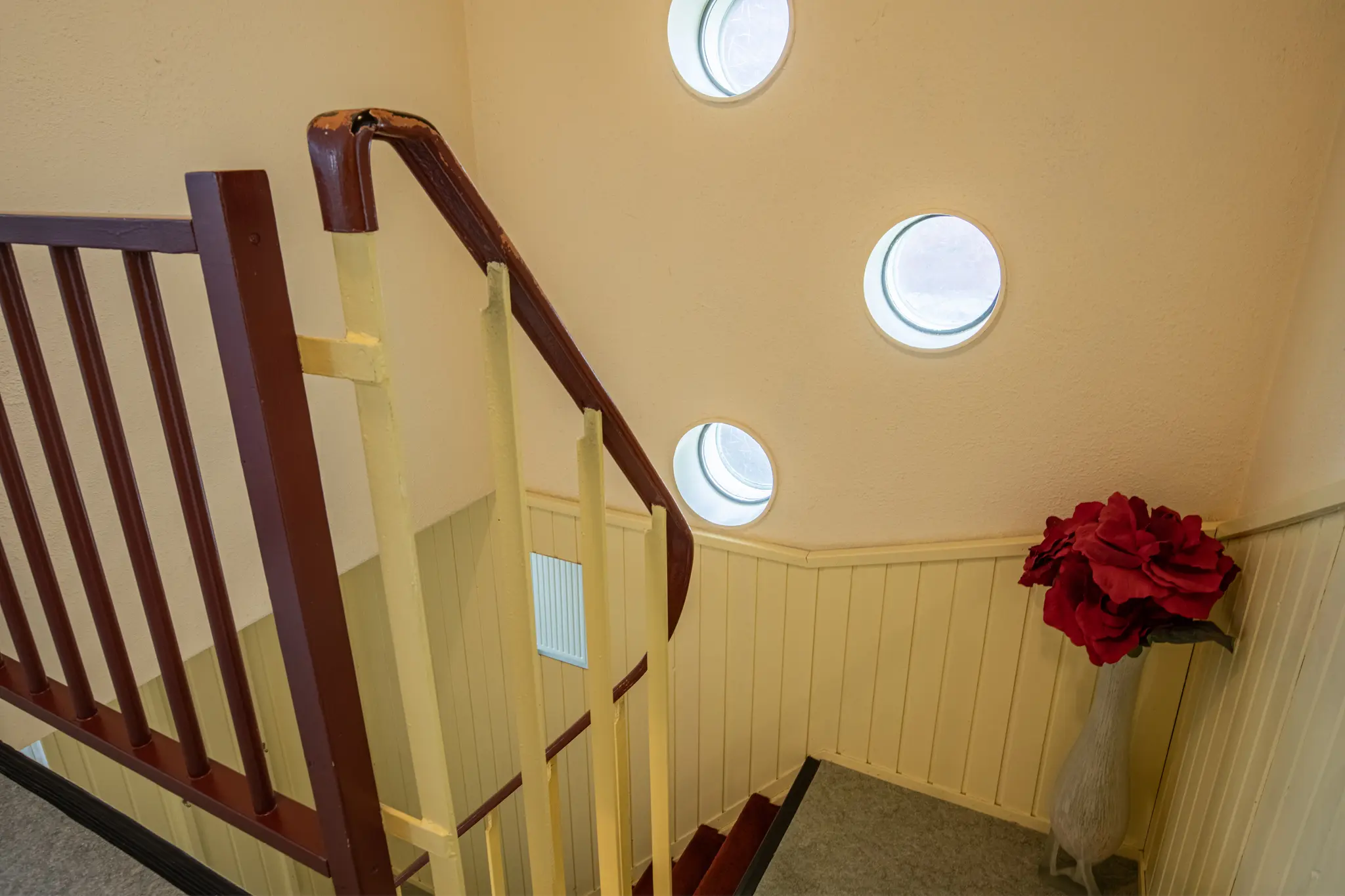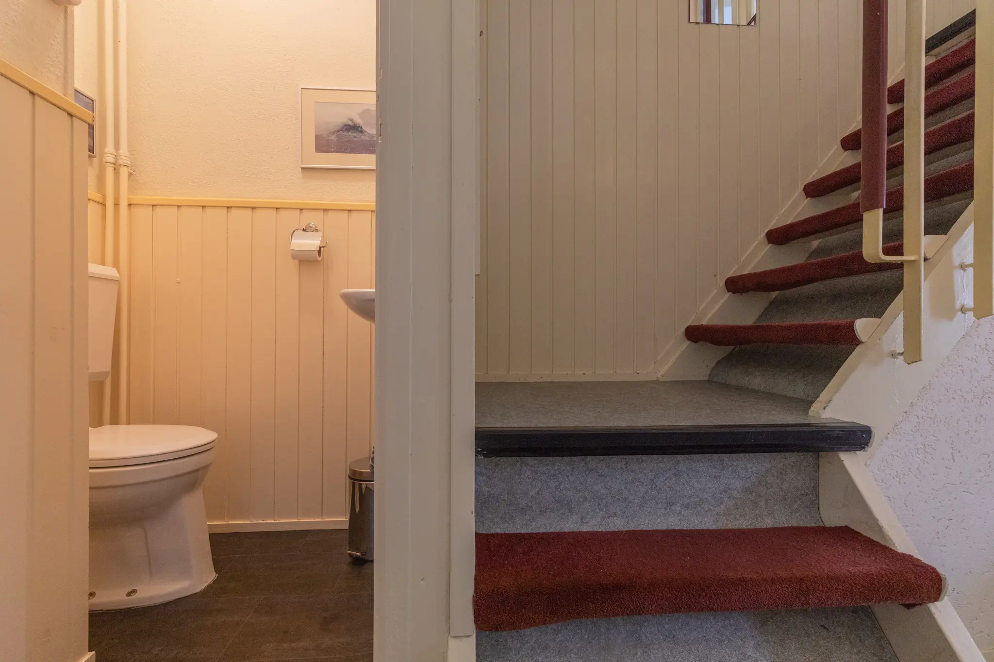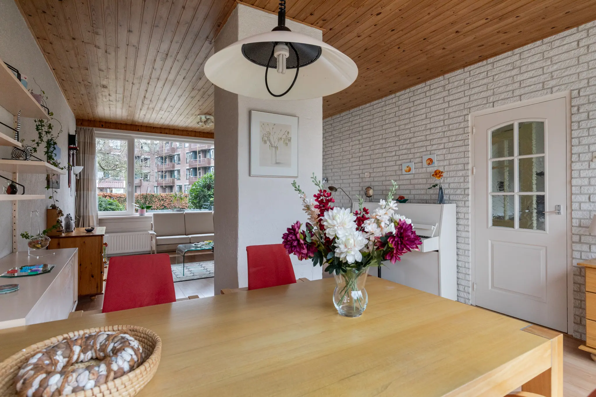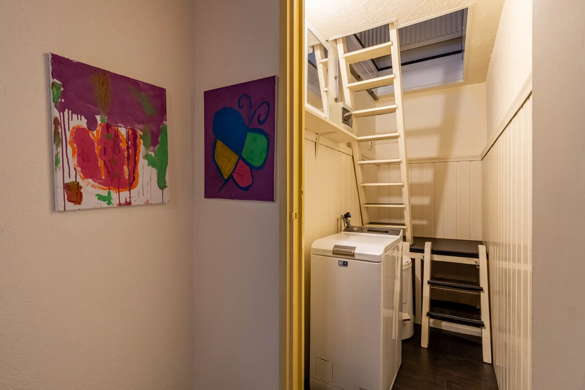 - Het schuine dak is van binnenuit geïsoleerd met circa 6–7 cm glaswol