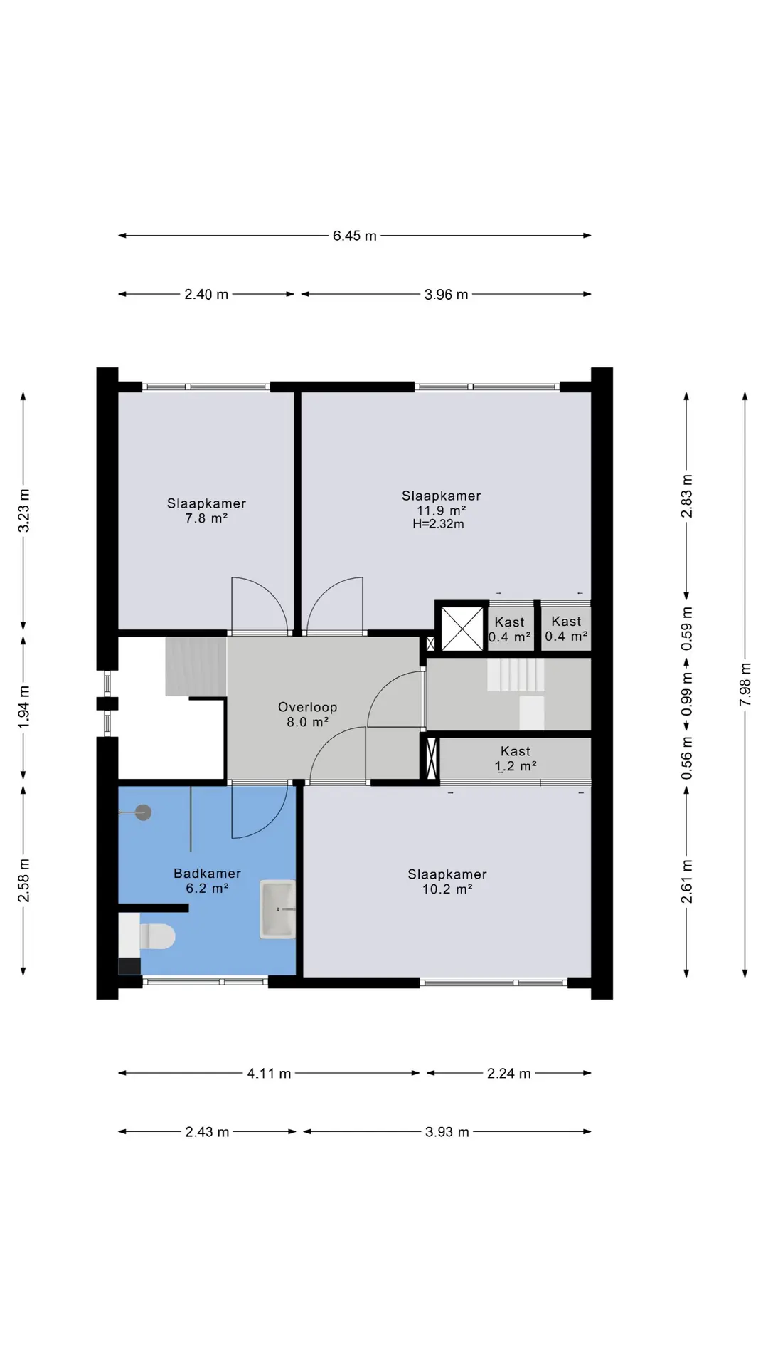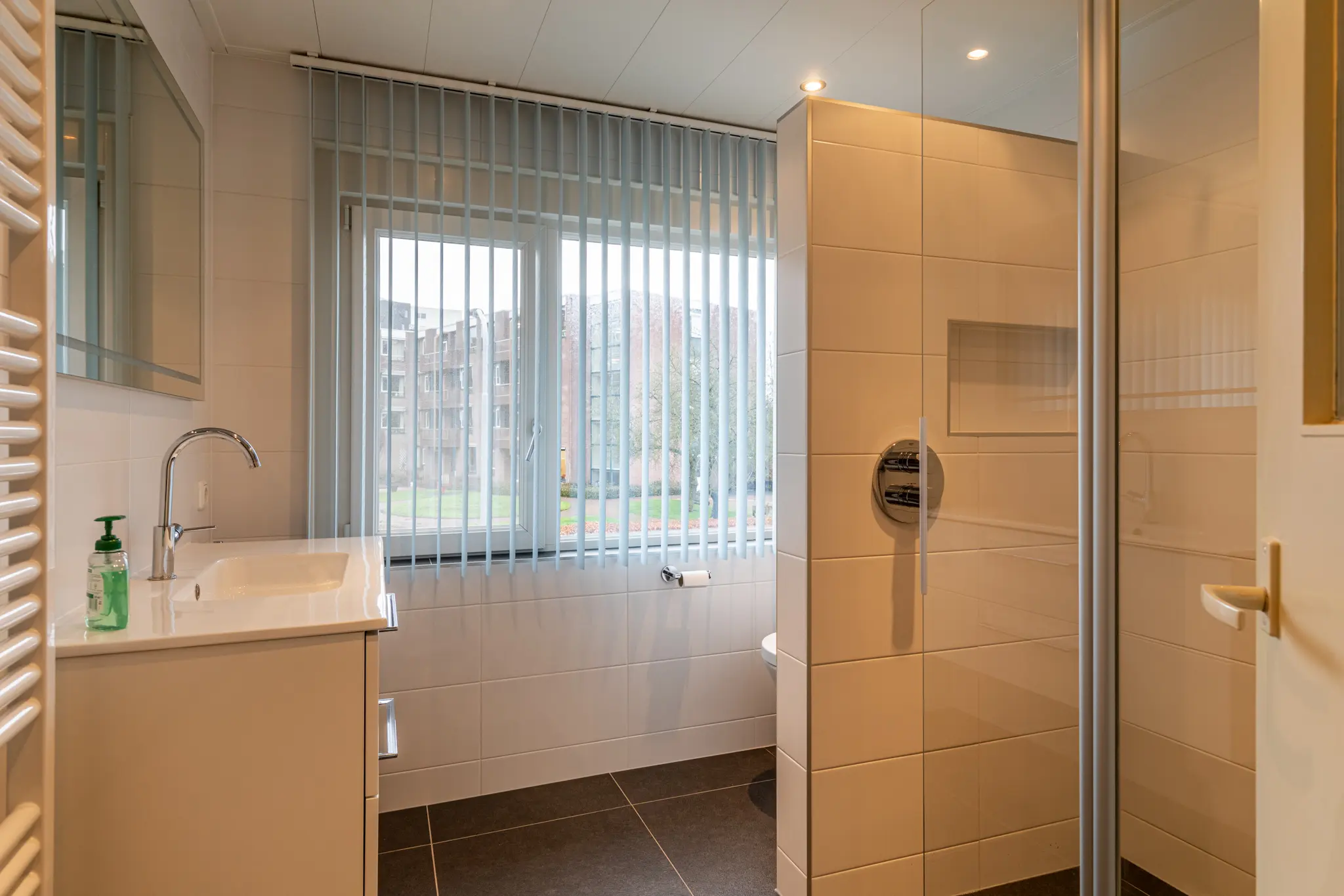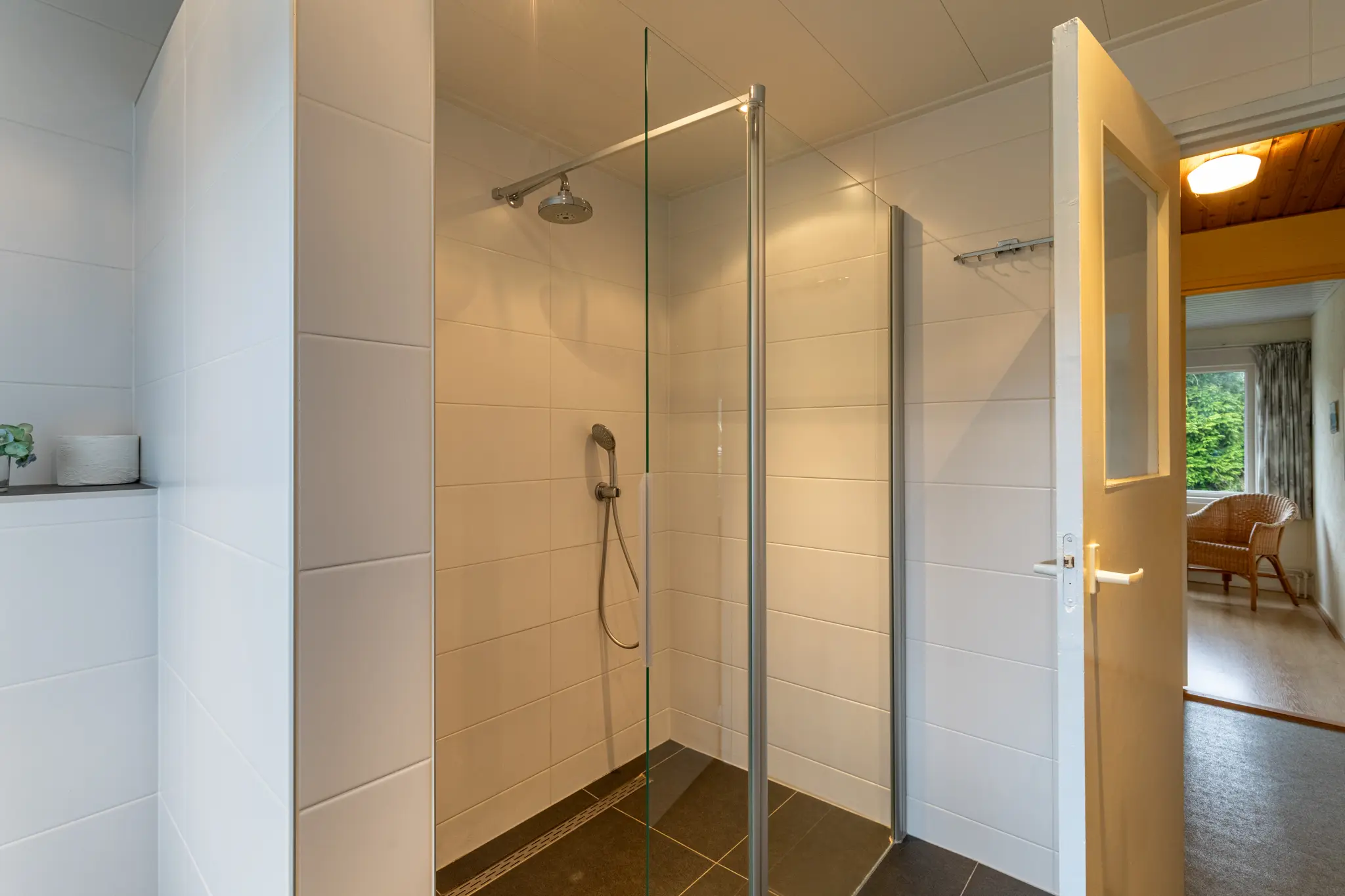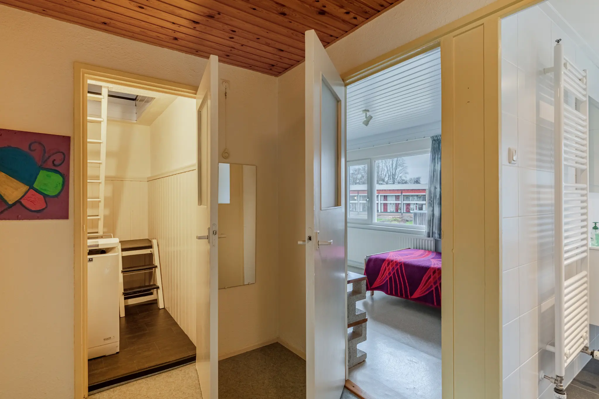 Overloop met toegang tot drie slaapkamers en de badkamer. De slaapkamers zijn praktisch en veelzijdig in gebruik, ideaal als slaap-, werk- of hobbyruimte. De ramen op deze verdieping zijn voorzien van horren, wat bijdraagt aan extra comfort. De badkamer is verplaatst (voorheen centraal in de woning) en bevindt zich nu in één van de voormalige slaapkamers. Deze is modern afgewerkt en voorzien van een toilet, wastafelmeubel en een comfortabele inloopdouche.
