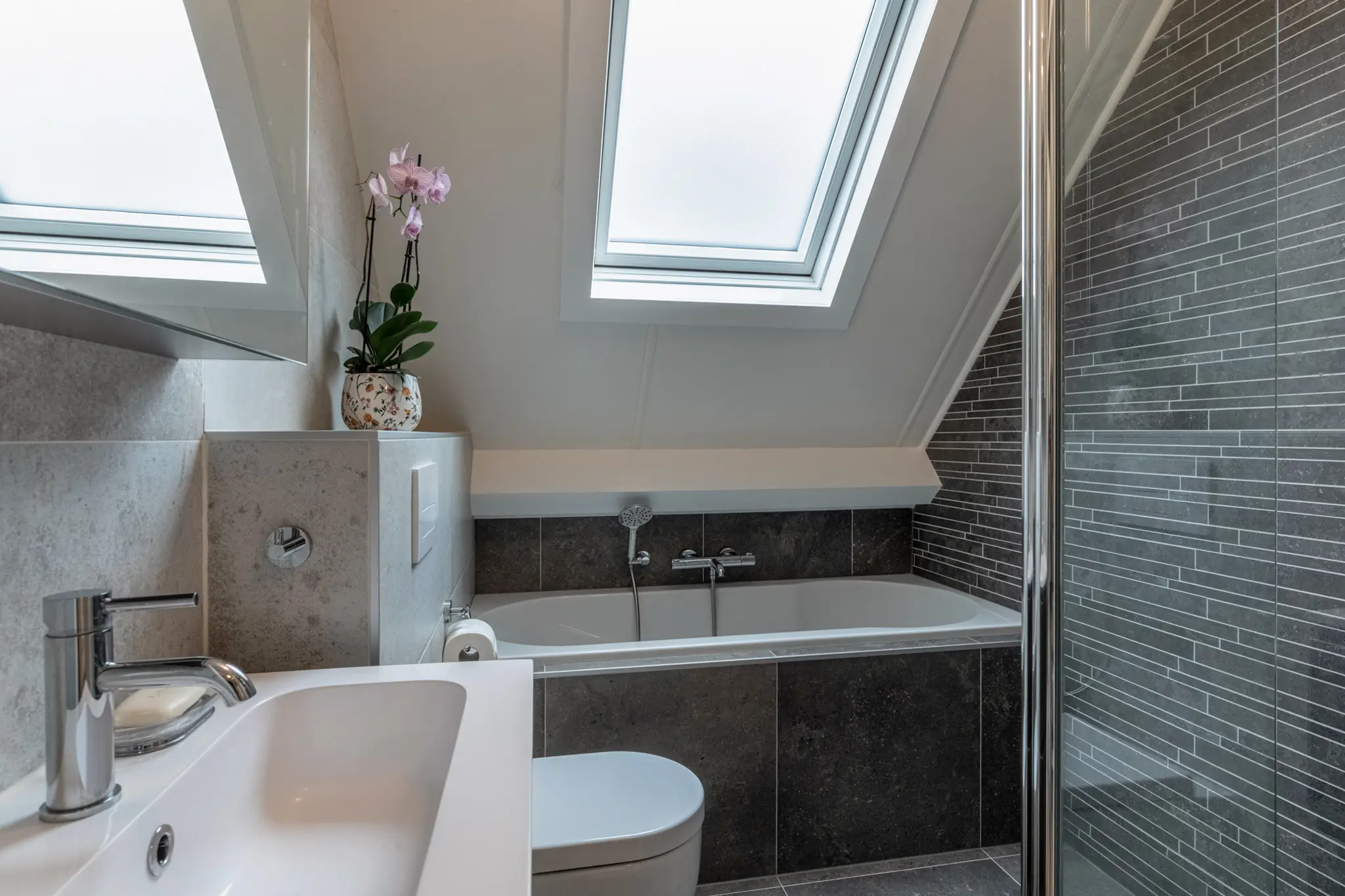 Op de verdieping bevinden zich de slaapkamers en de moderne en complete badkamer, die in 2024 volledig is vernieuwd. De badkamer is uitgerust met een douchecabine, wastafelmeubel, toilet én ligbad. In de badkamer is bovendien elektrische vloerverwarming aanwezig, wat zorgt voor extra comfort.