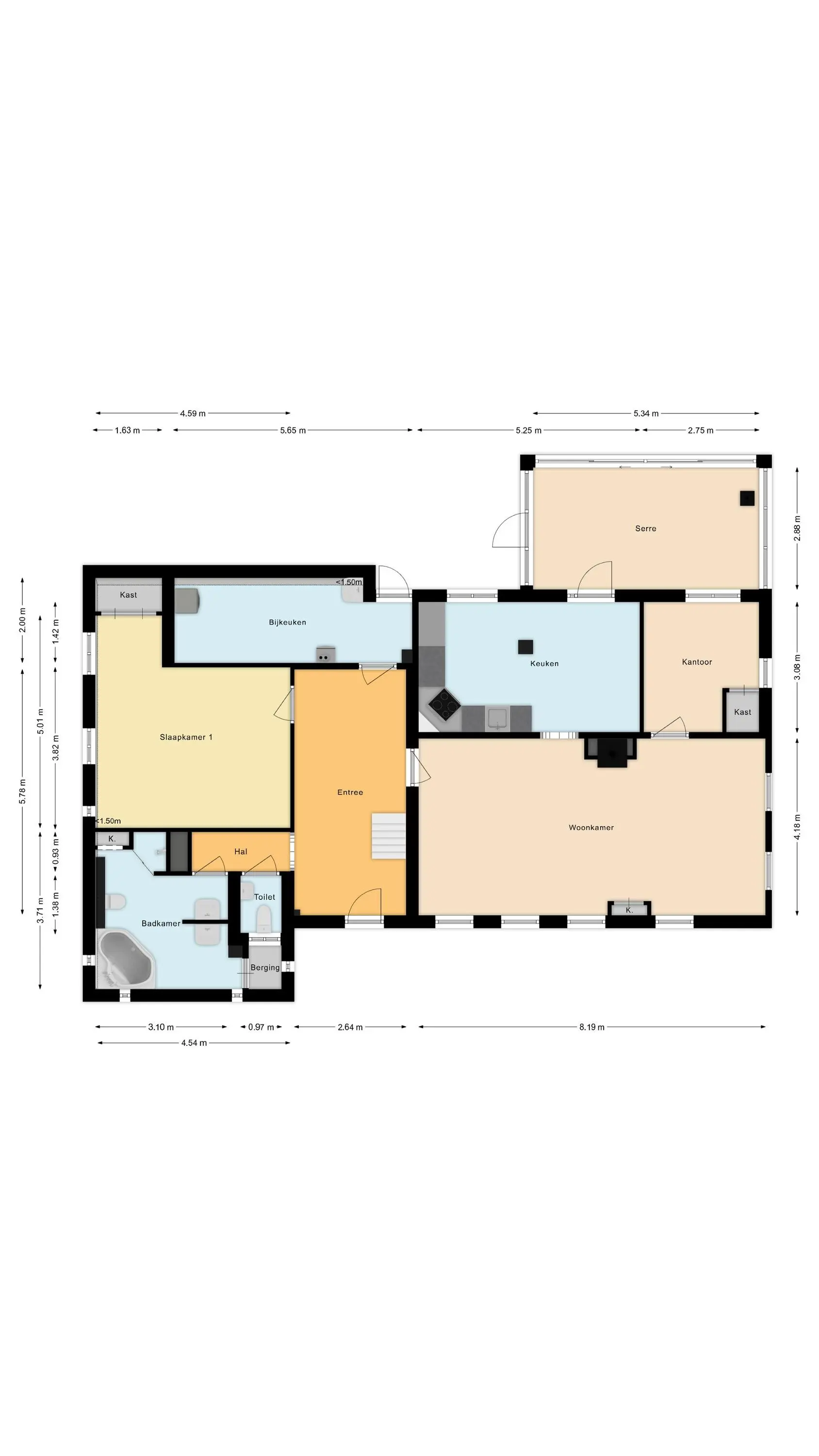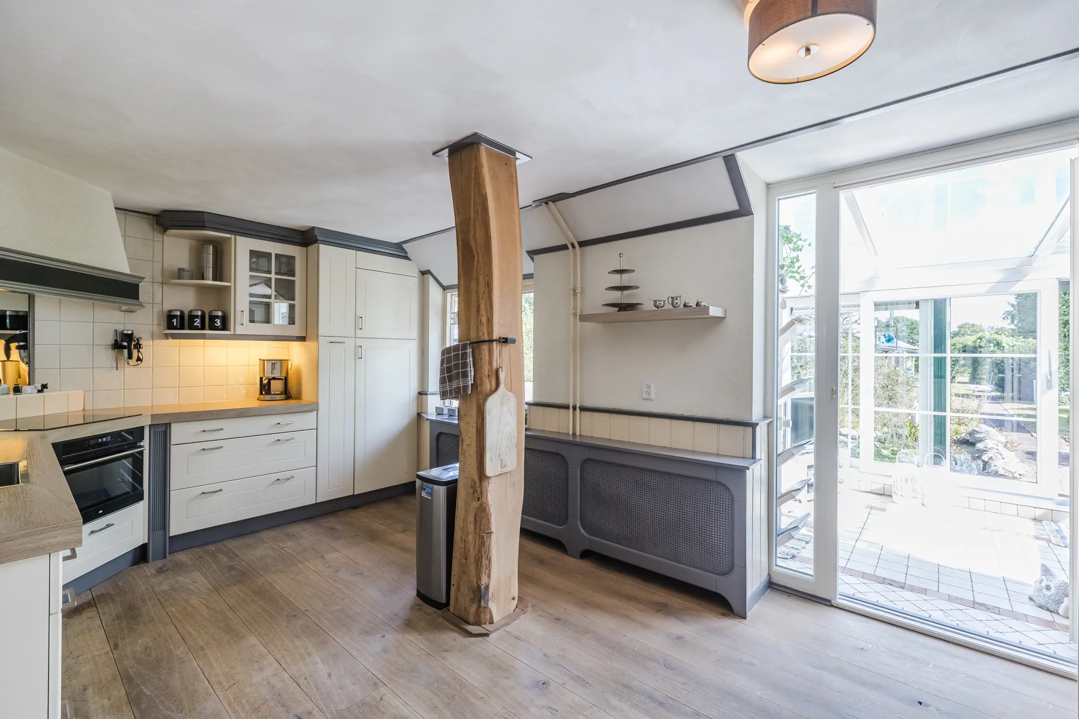 Op de begane grond bevindt zich een ruime entree en een net toilet. Vanuit de hal leidt de weg naar een sfeervolle woonkamer, waar een houtkachel en een eiken houten vloer zorgen voor een warme uitstraling. Aansluitend ligt de halfopen keuken, voorzien van inbouwapparatuur en in landelijke stijl vormgegeven. Dit aaneengesloten geheel met de karakteristieke houten balken geeft deze leefomgeving extra charme. De serre vormt een licht en aangenaam verlengstuk van de woning. Dankzij de vloerverwarming, een tweede houtkachel en een schuifpui naar de tuin is dit een ideale plek om te genieten van de rust en het prachtige uitzicht. Verder biedt de begane grond een studeerkamer/kantoor met vaste kast, een bijkeuken, een ruime nostalgische slaapkamer met vaste (bedstede)-kast en een badkamer met ligbad, dubbele wastafel, douchecabine en een tweede toilet.