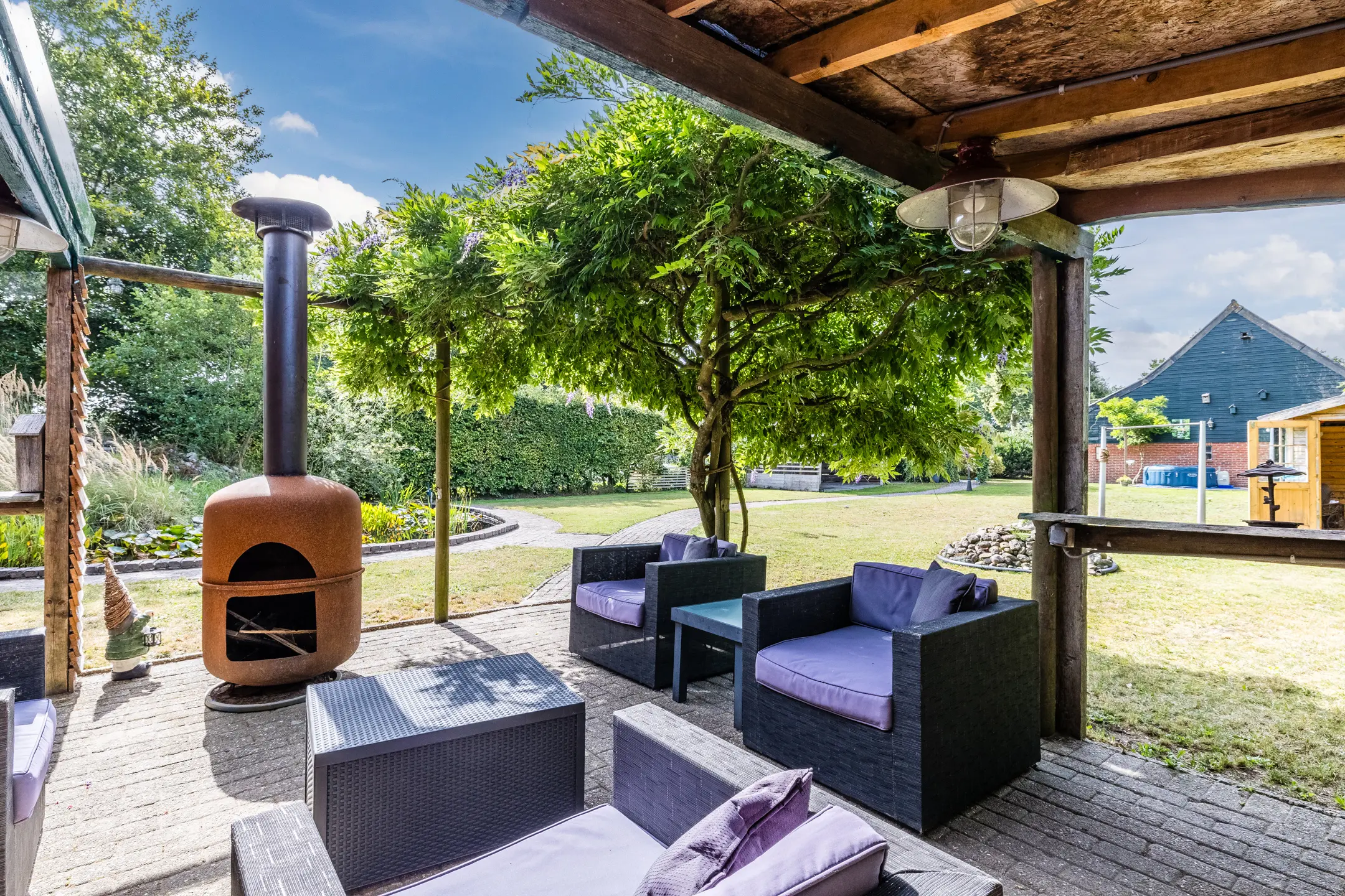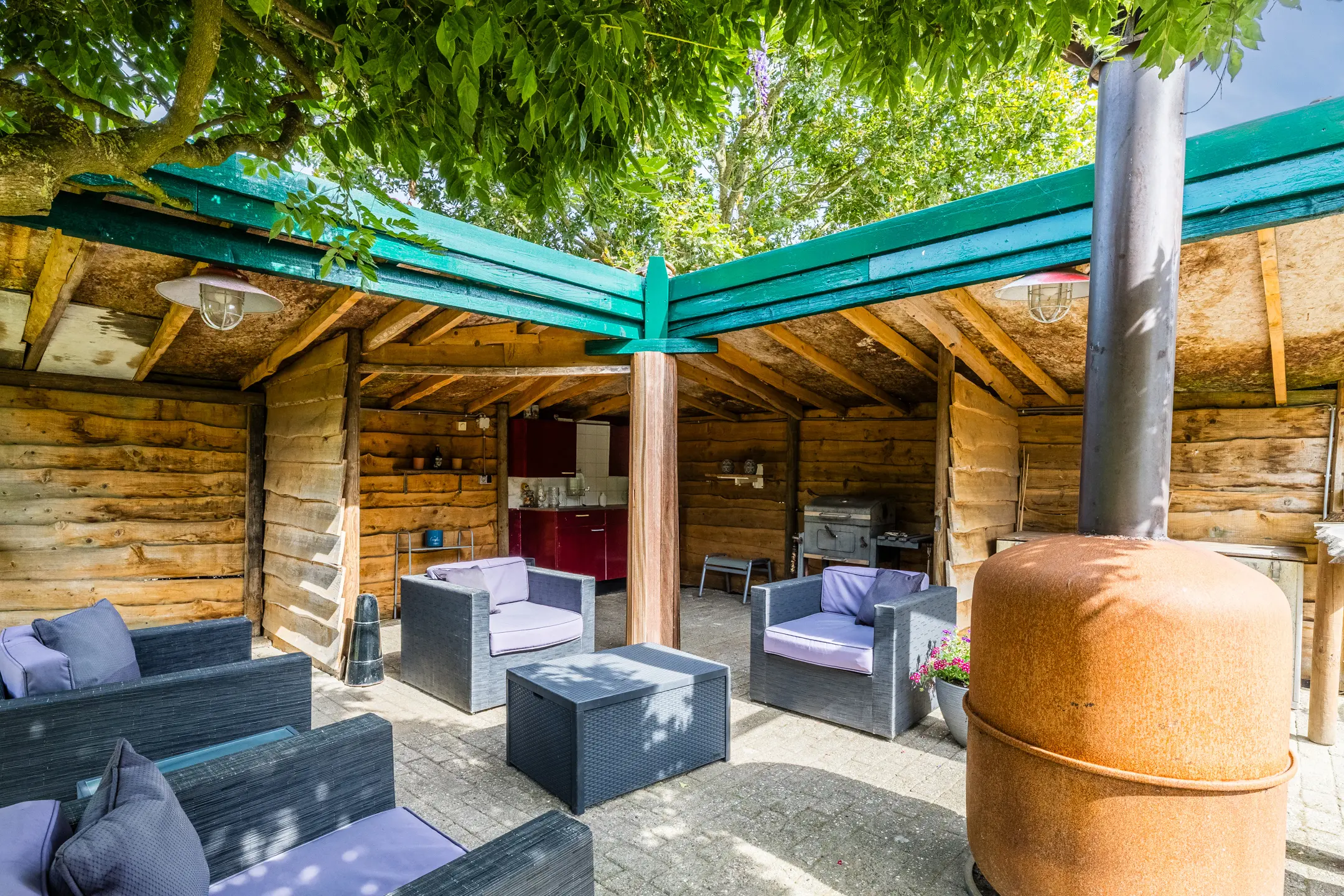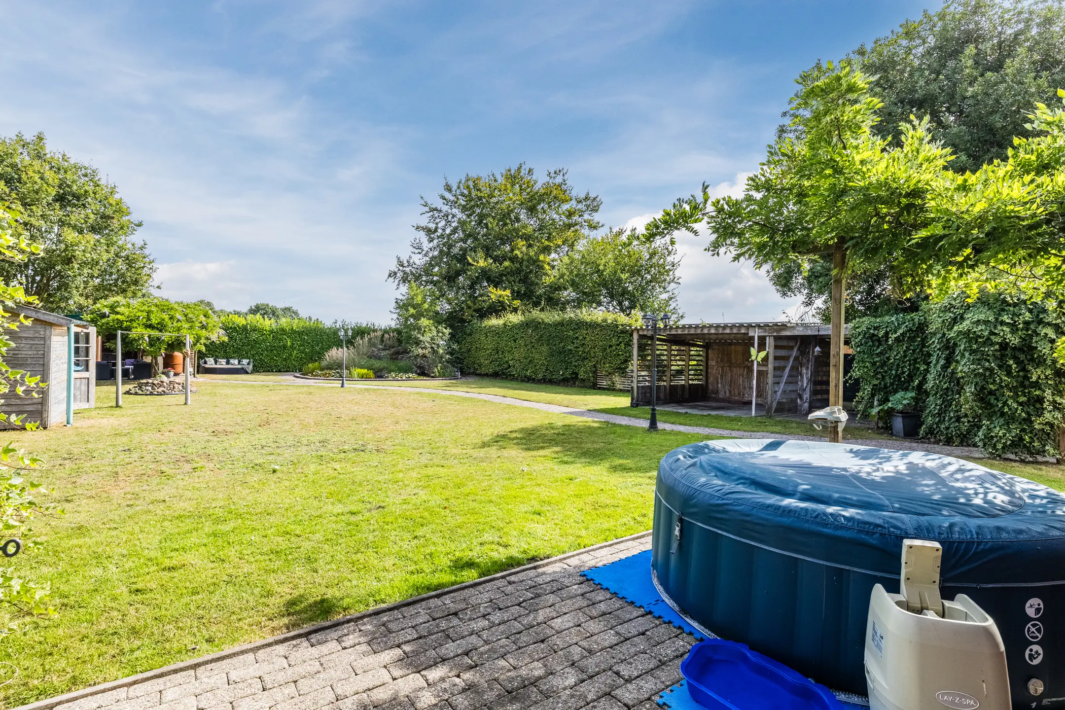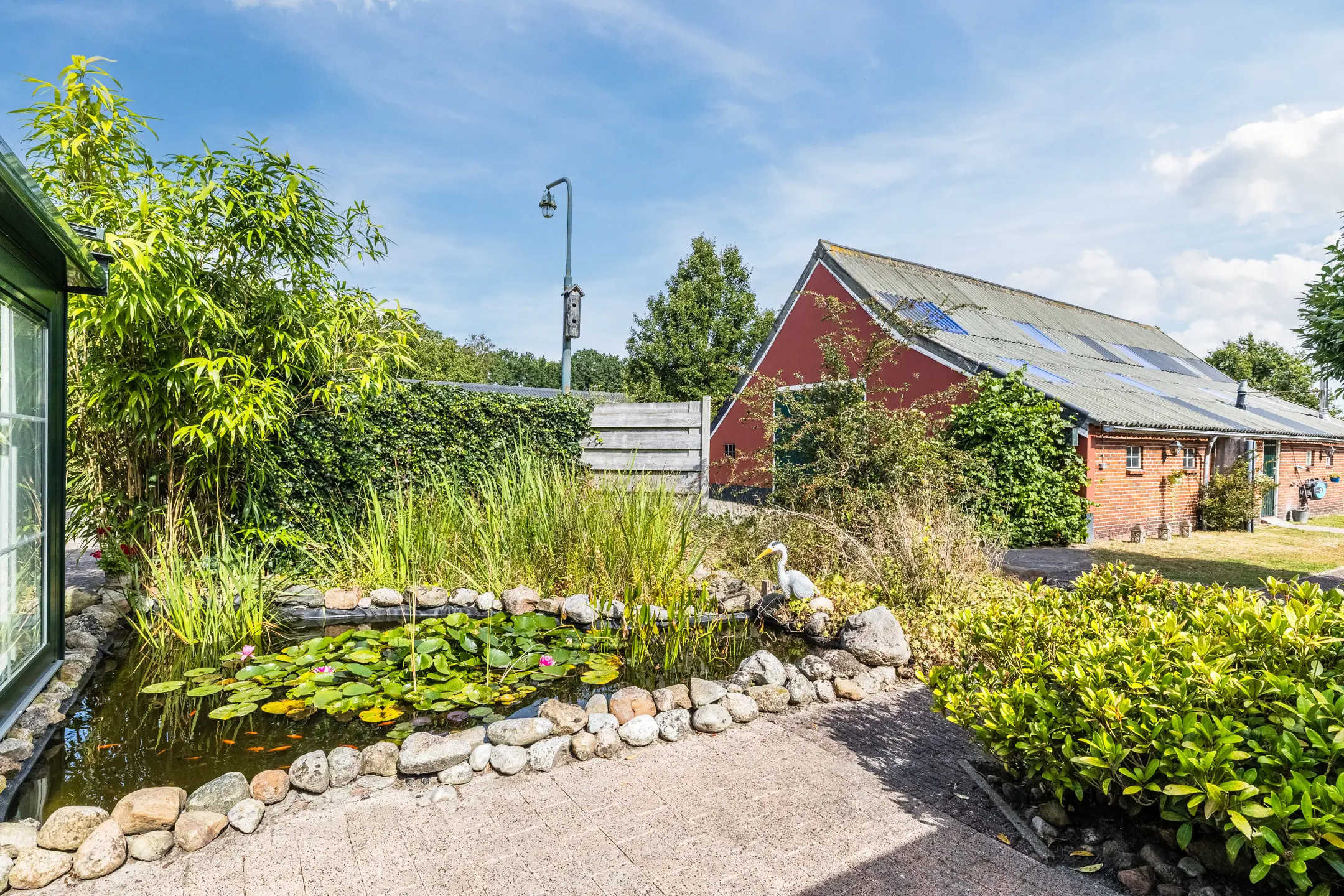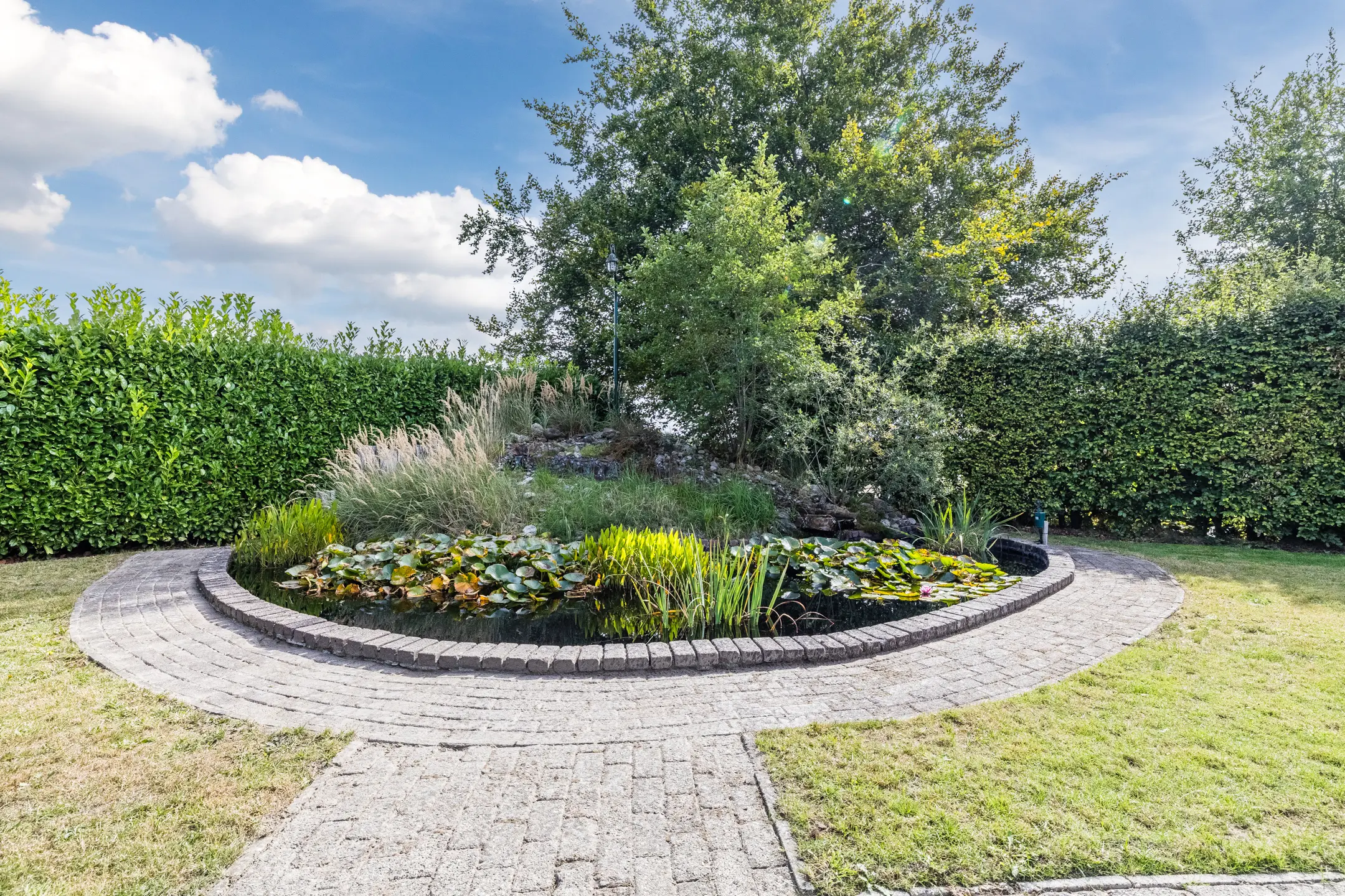 De royale tuin rondom de woning is ingericht met diverse terrassen, vijverpartijen en een overkapping met buitenkeuken. Dankzij het vrije/natuurlijke uitzicht aan zowel de voor- als achterzijde en de grote mate van privacy vormt de buitenruimte een oase van rust. Parkeren kan natuurlijk eenvoudig op eigen terrein.