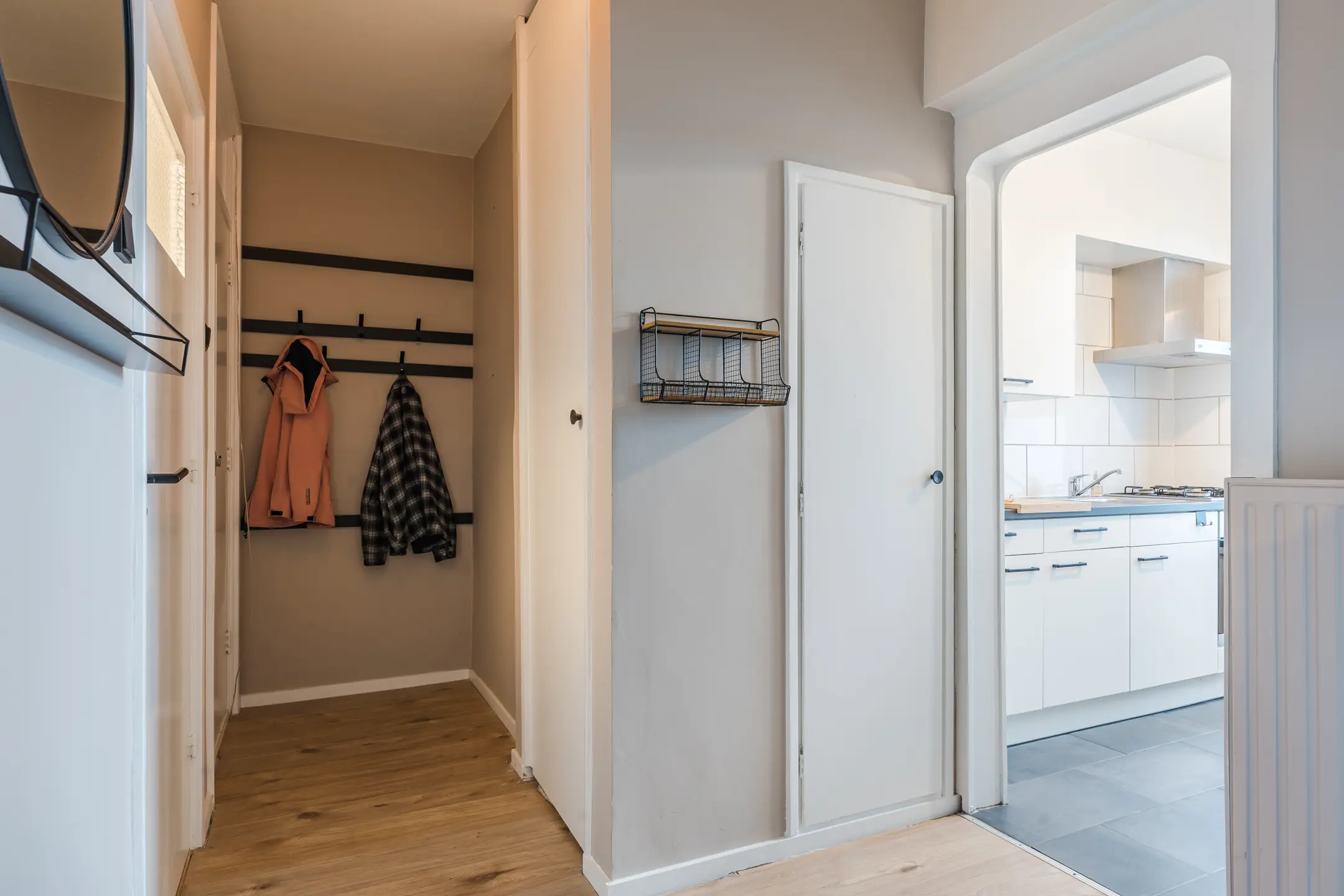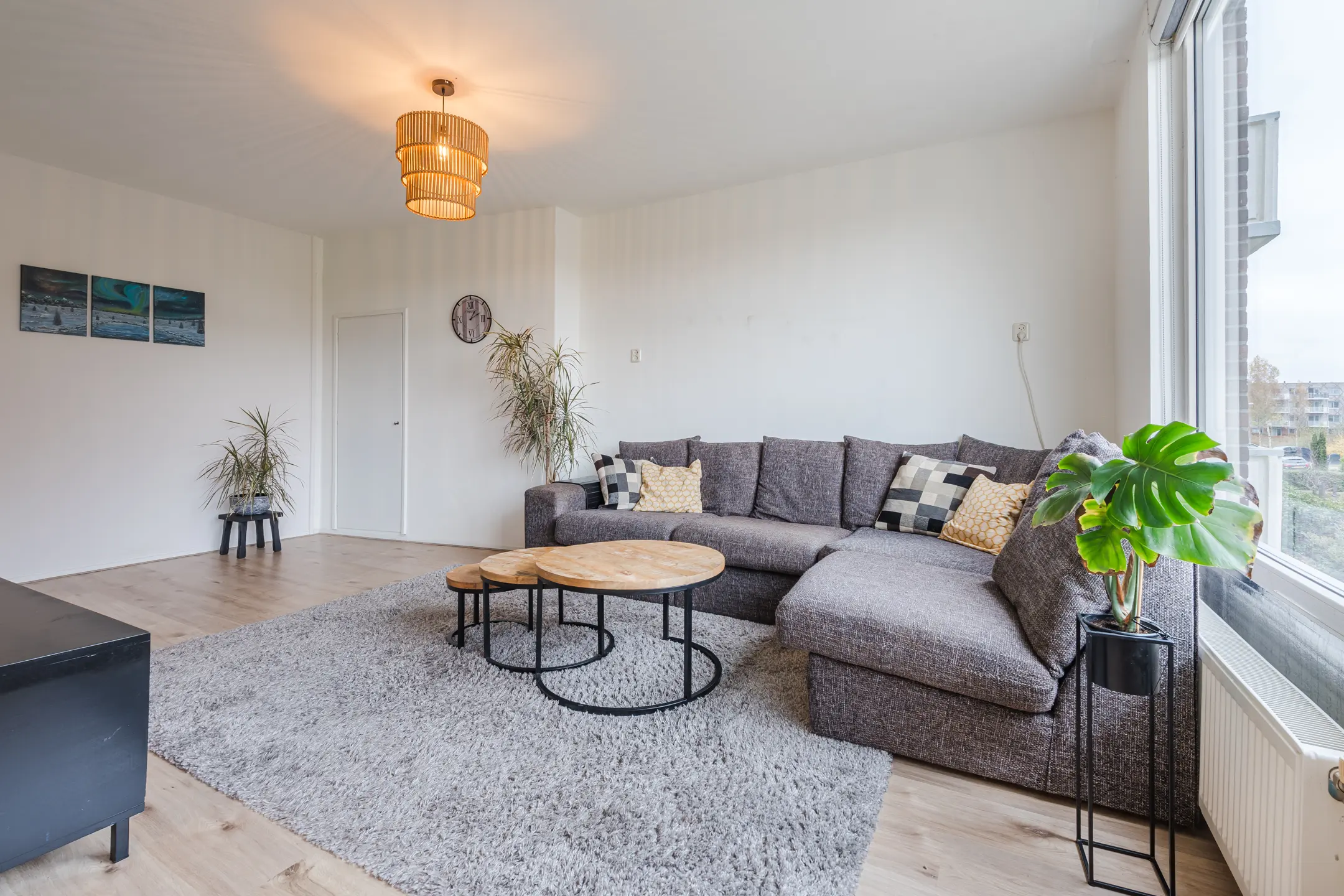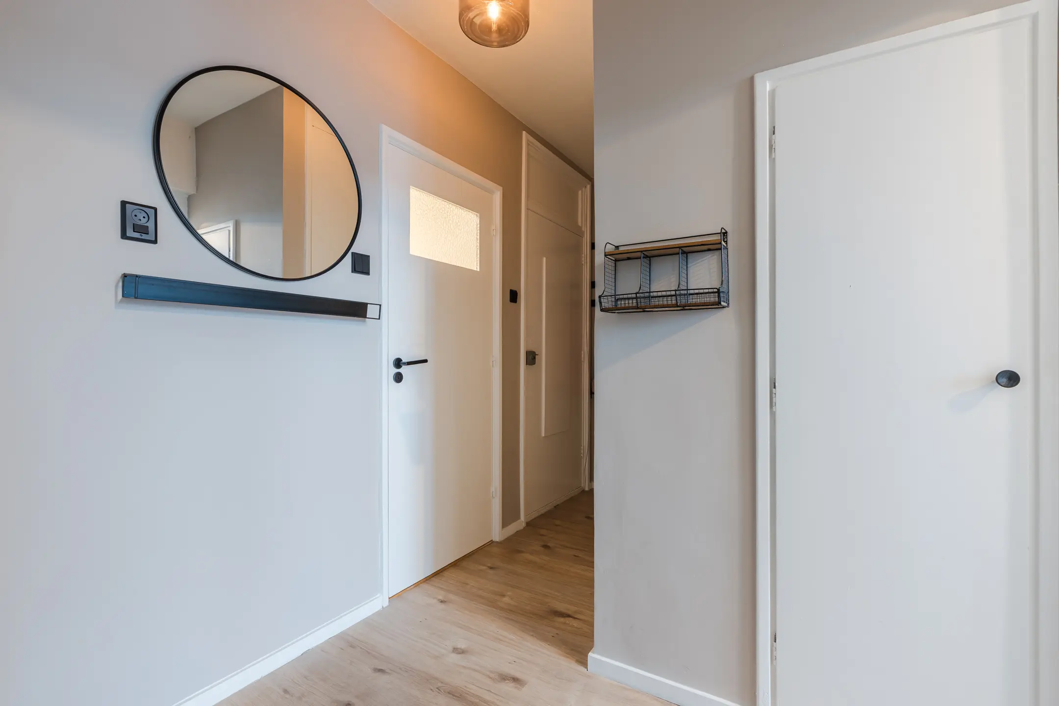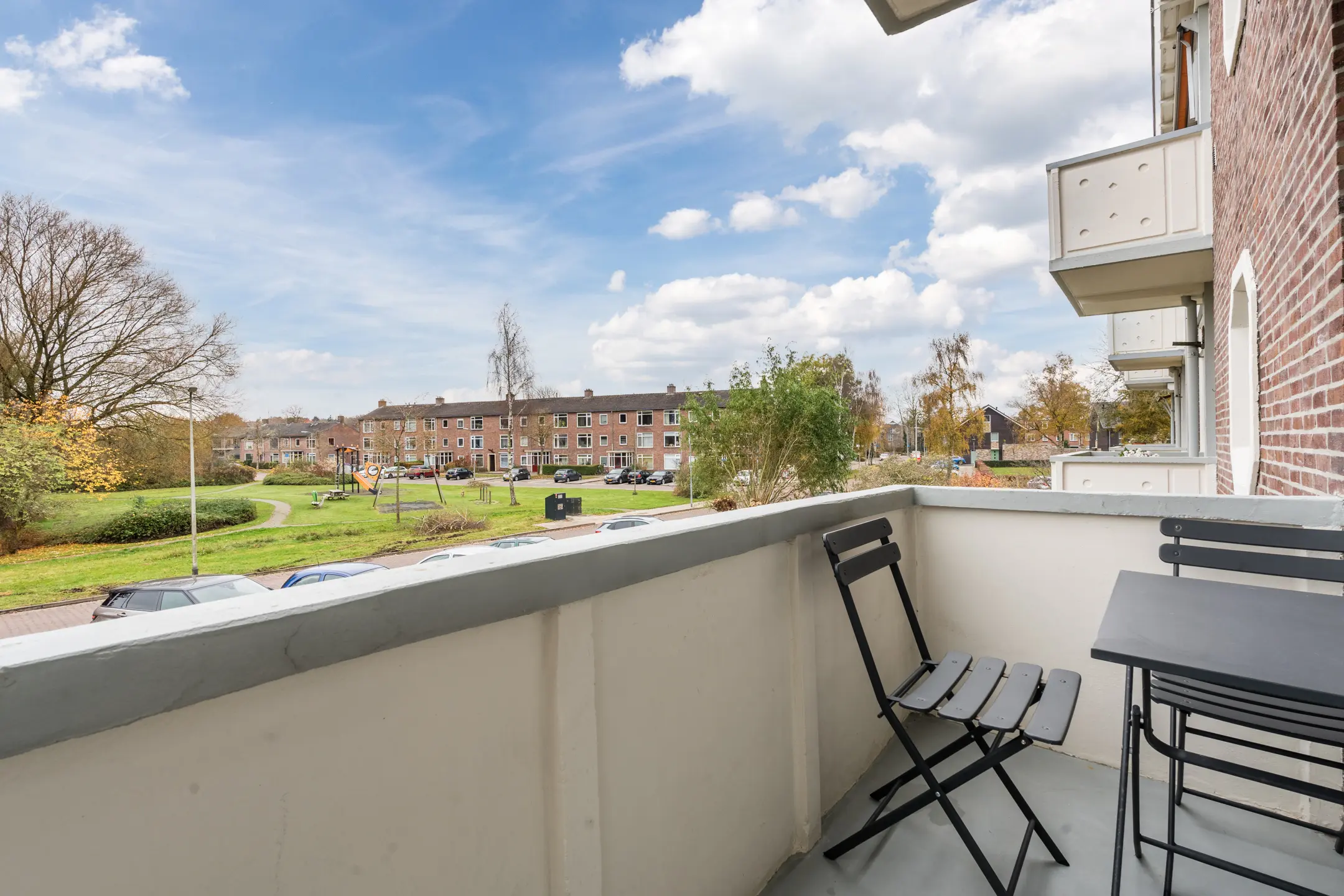 Entree, gang, badkamer met douche, toilet en wastafel, parkgerichte lichte woonkamer met balkon, grote master bedroom en dichte keuken met toegang tot het tweede balkon. Oorspronkelijk had de woning twee slaapkamers; één slaapkamer is bij de woonkamer gevoegd waardoor een zeer ruime leefruimte is ontstaan met plaats voor zowel een eethoek als een zithoek. Indien gewenst kan de tweede slaapkamer eenvoudig worden teruggebracht. Aan de achterzijde bevindt zich een balkon op het noordoosten, ideaal om rustig te starten in de ochtend. Aan de voorzijde ligt het zonnige balkon op het zuidwesten, waar je vrijwel de hele dag van de zon kunt genieten. Aan de achterzijde van het complex bevindt zich een stenen fietsenberging.