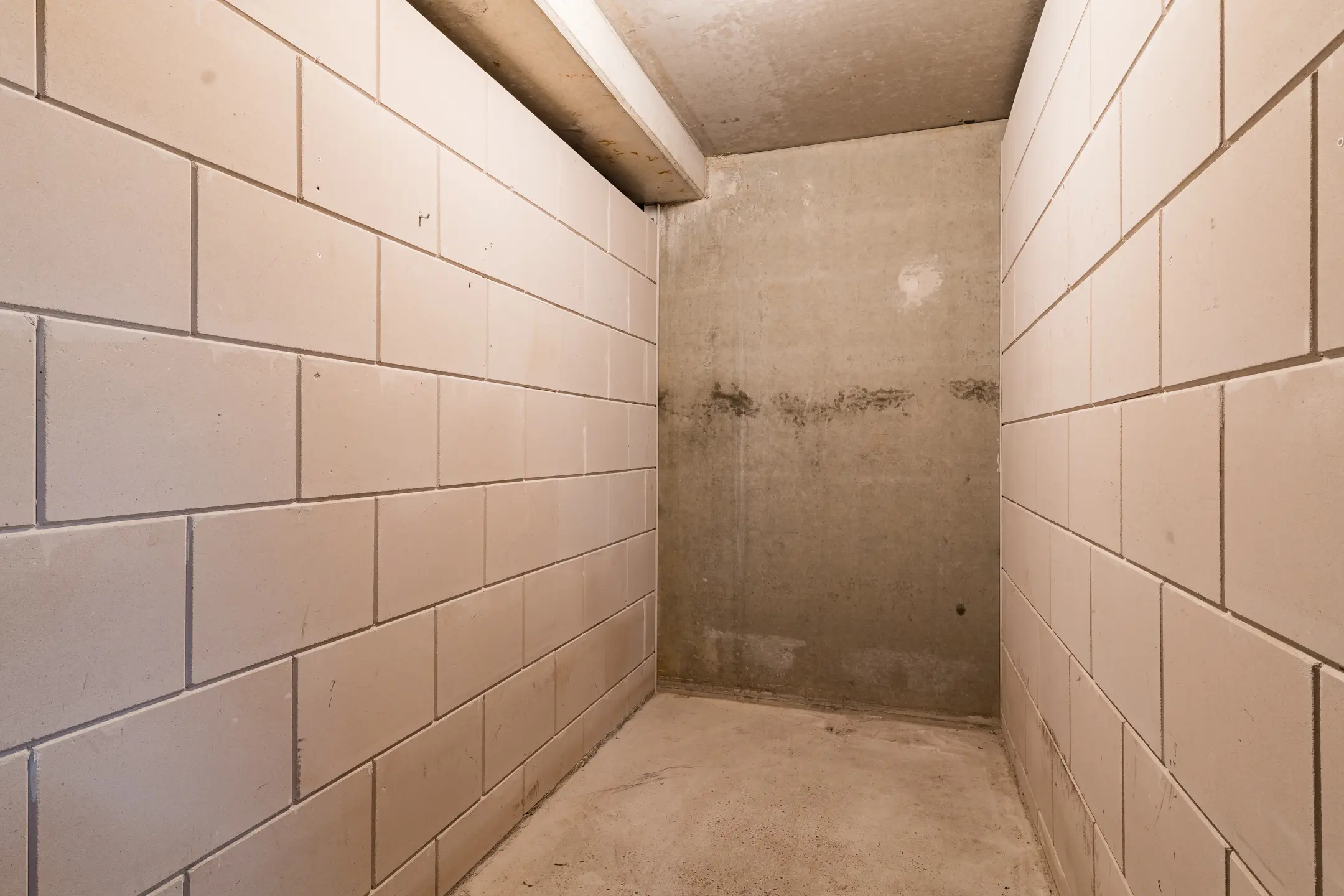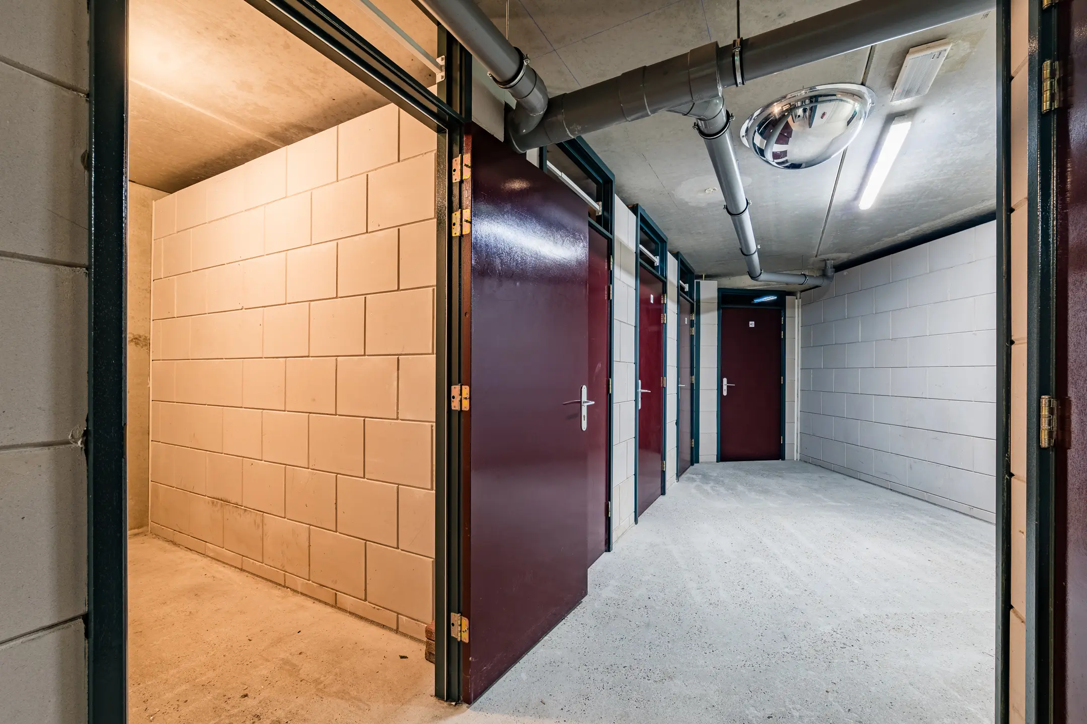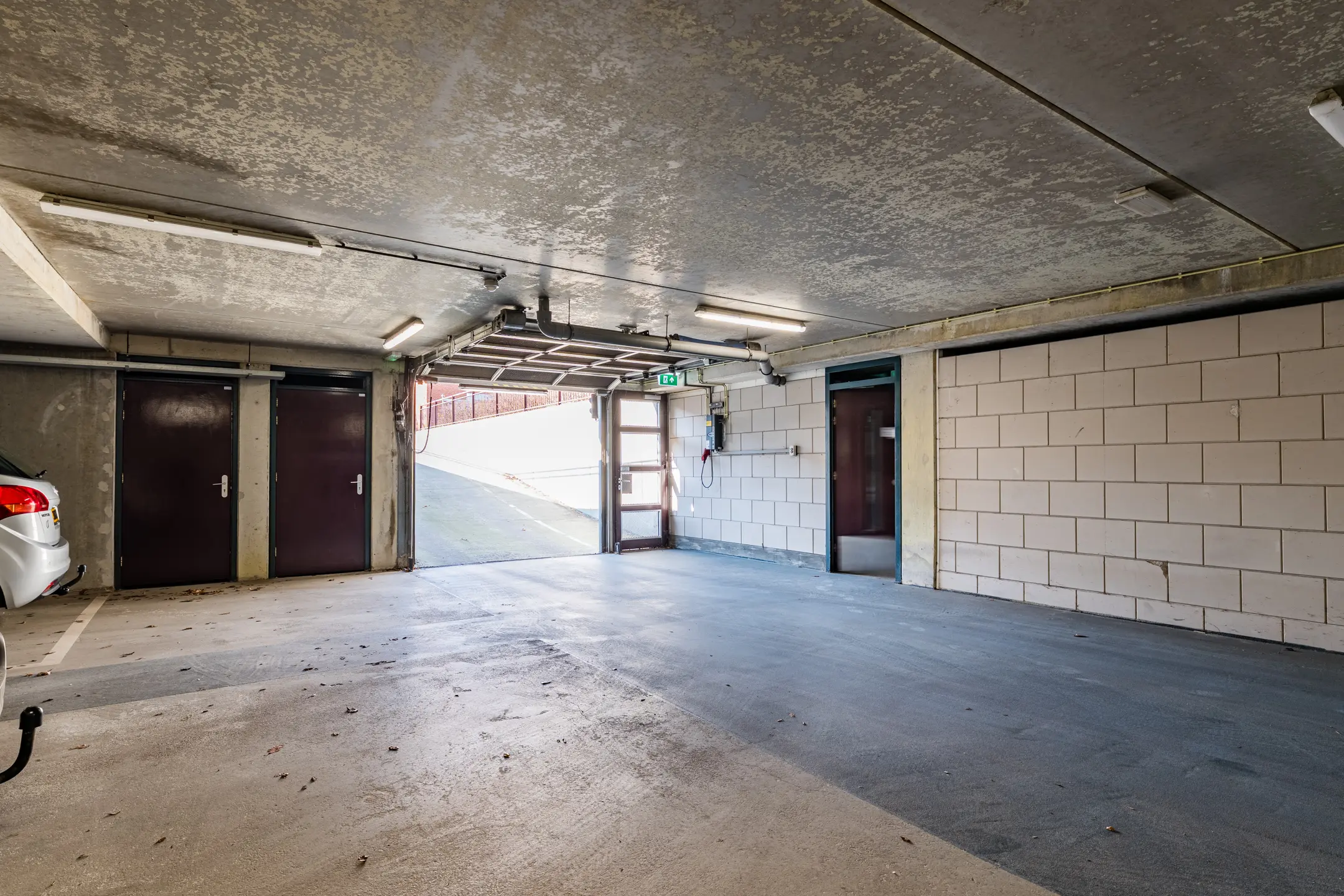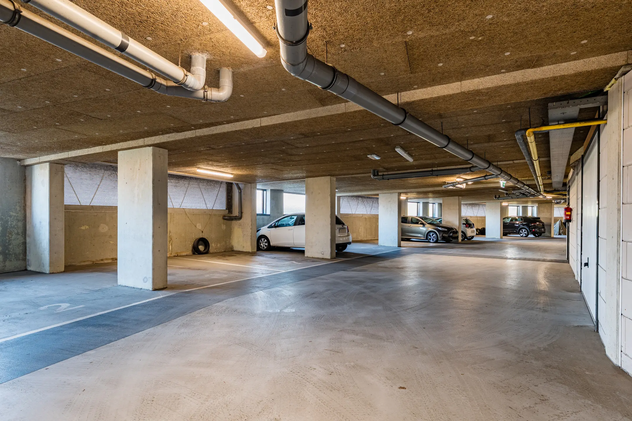 In de afgesloten parkeerkelder, bereikbaar via lift en trappenhuis, bevindt zich een eigen parkeerplaats en een berging. Bezoekers kunnen vrij parkeren aan de voorzijde van het complex.