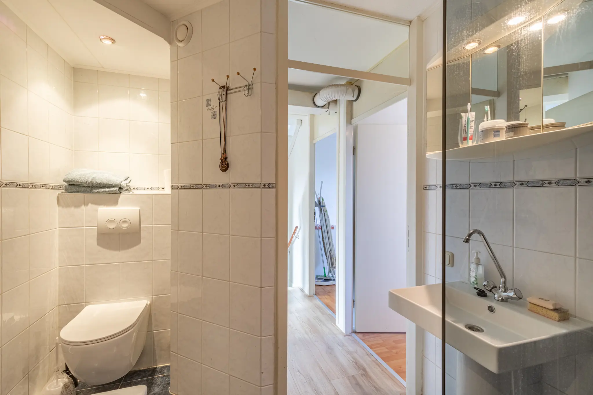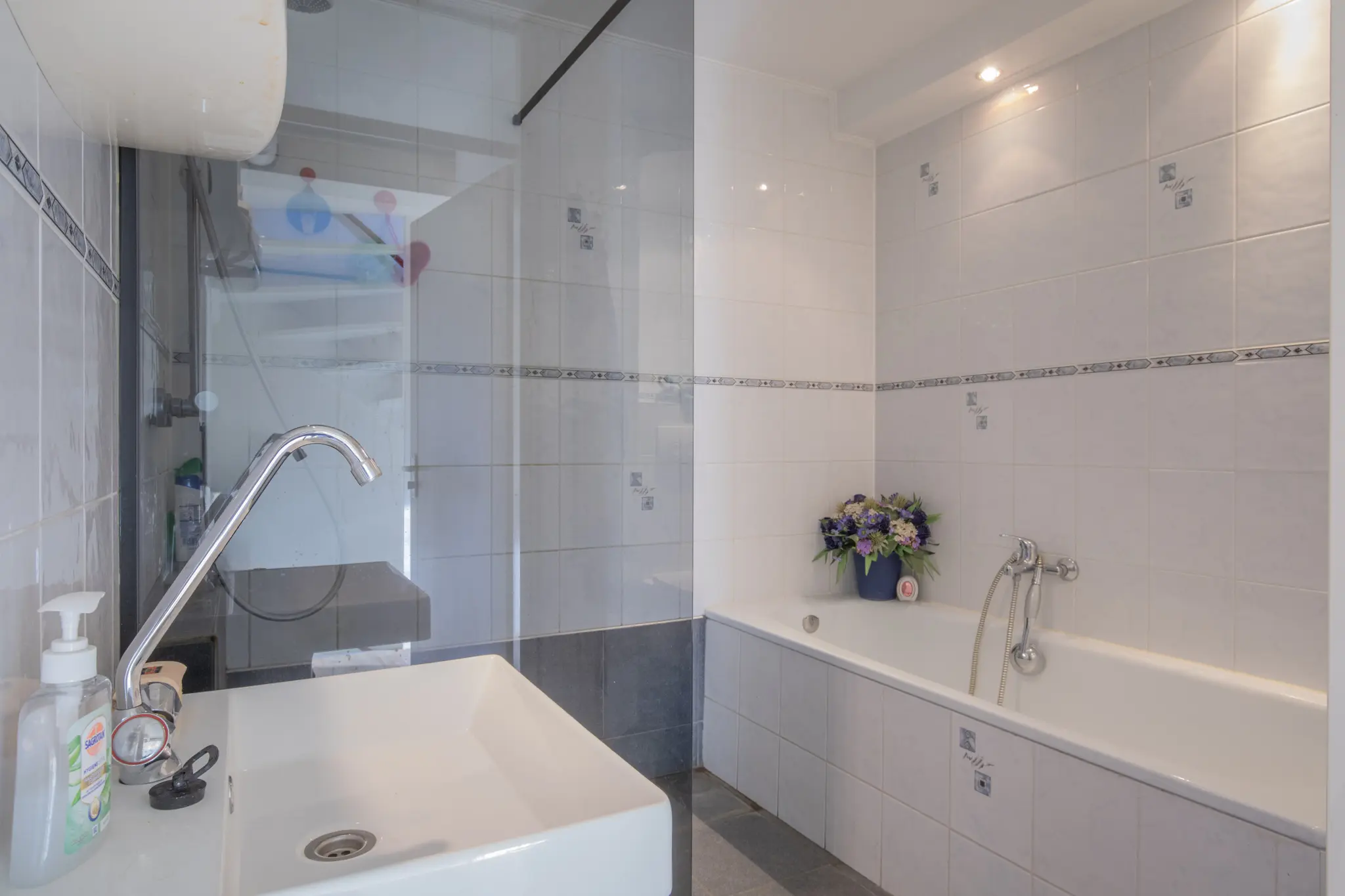 - Badkamer met ligbad, douche, toilet en wastafel