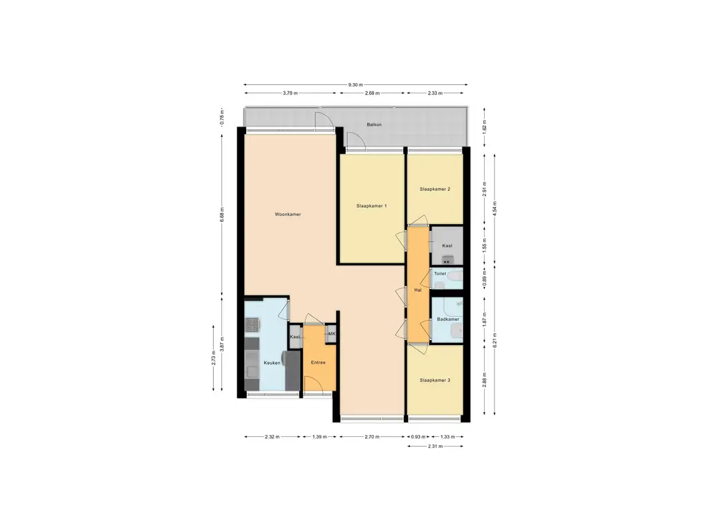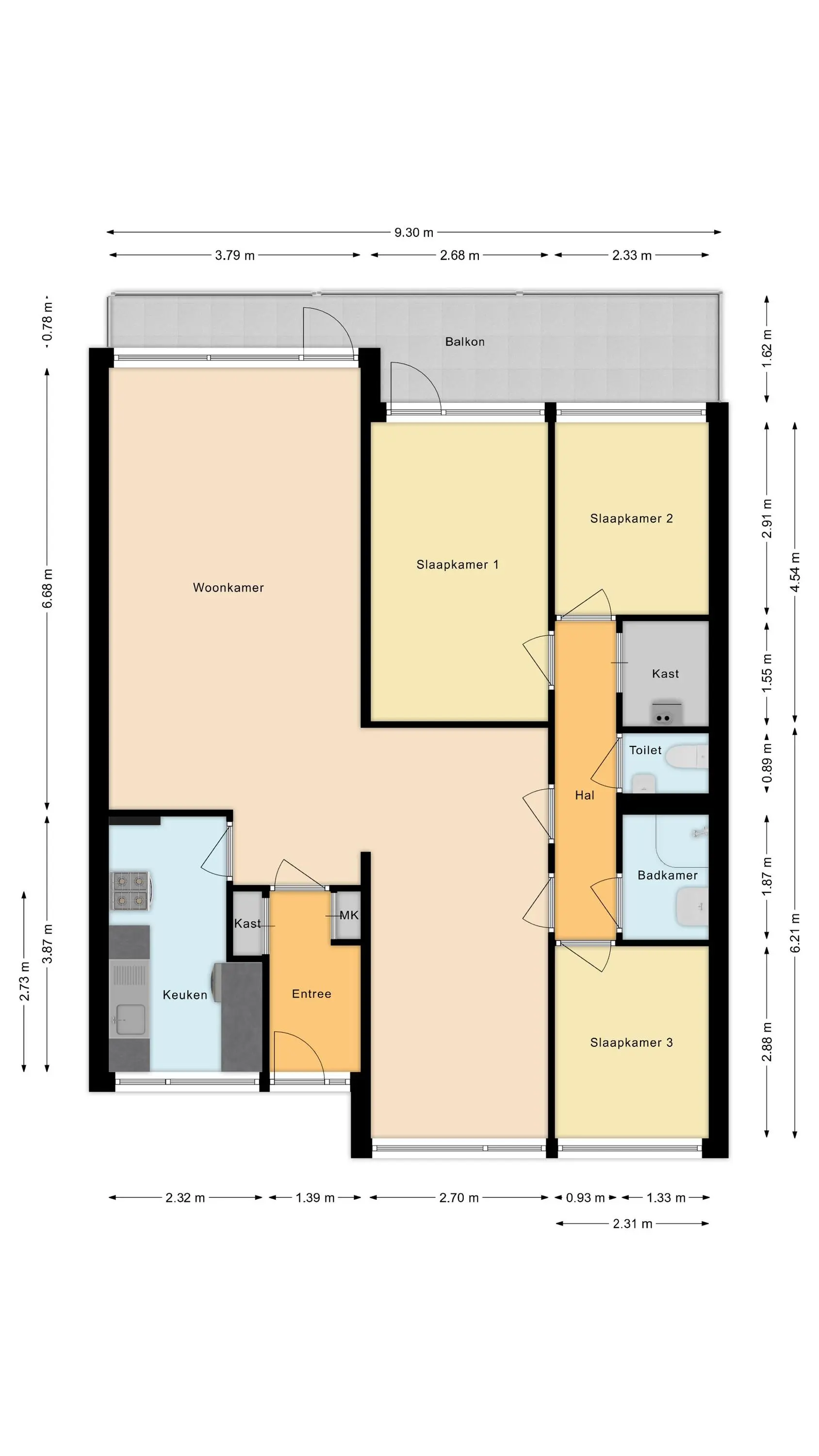 Via de entree kom je in de hal, die toegang biedt tot de ruime en lichte woonkamer biedt die volop mogelijkheden biedt voor een comfortabele zit- en eethoek. De gesloten keuken is voorzien van een keukenblok en beschikt over aansluitingen voor witgoed. Het appartement beschikt verder over drie slaapkamers, waarvan één slaapkamer directe toegang heeft tot het balkon. De badkamer is uitgerust met een douchecabine en een wastafelmeubel. Daarnaast is er een separaat toilet.
