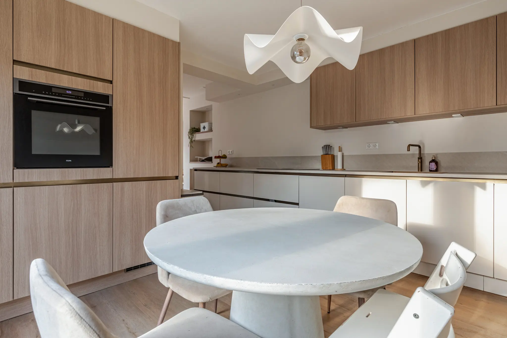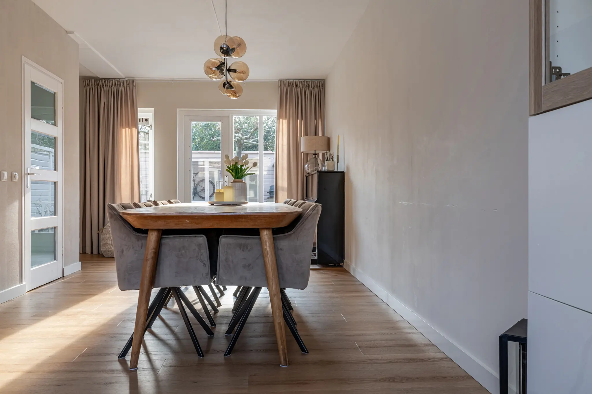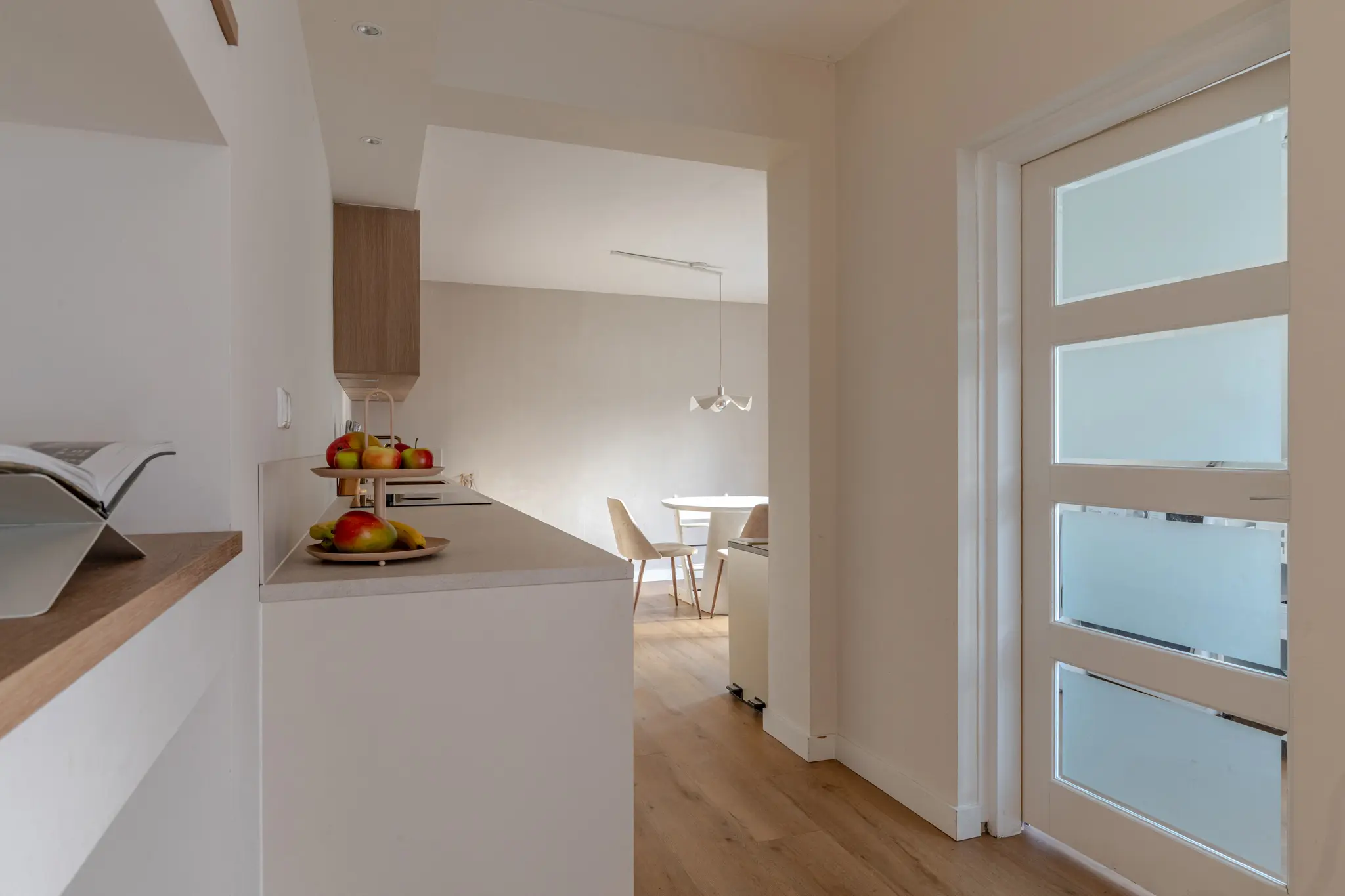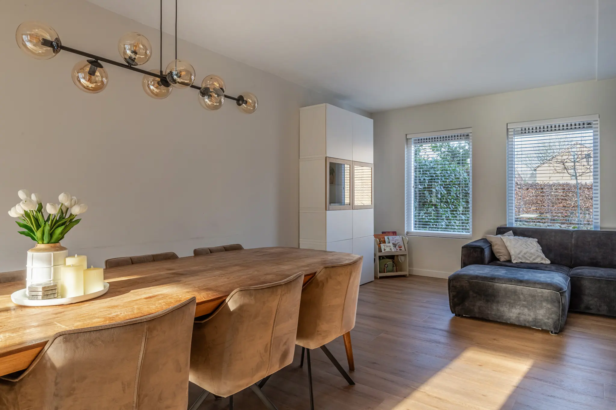 Via de entree kom je in de hal met vernieuwde meterkast, modern toilet en toegang tot de berging/voormalige garage. Vanuit de hal bereik je de ruime woonkamer, die in open verbinding staat met de eetkamer en keuken. De muur tussen woonkamer en keuken is verwijderd, waardoor aan de achterzijde een echte leefkeuken is ontstaan: ruim, licht en ideaal voor gezinnen en liefhebbers van koken en gezelligheid. De keuken is in 2024 volledig vernieuwd en uitgevoerd in een strakke, moderne stijl met luxe inbouwapparatuur, waaronder: