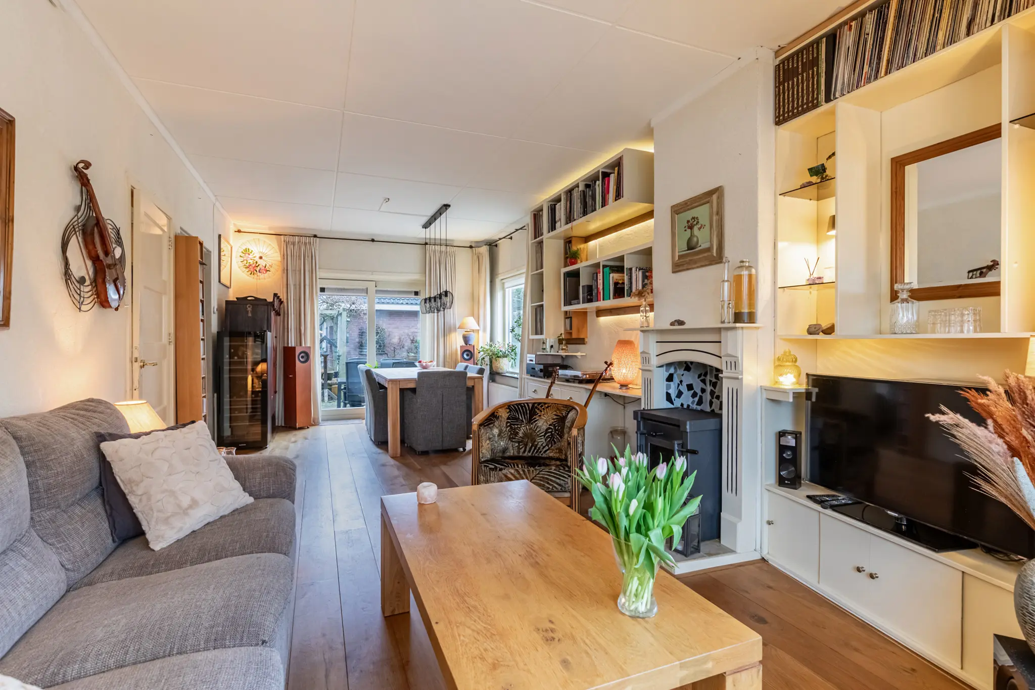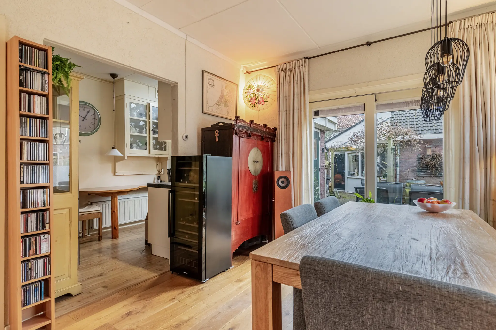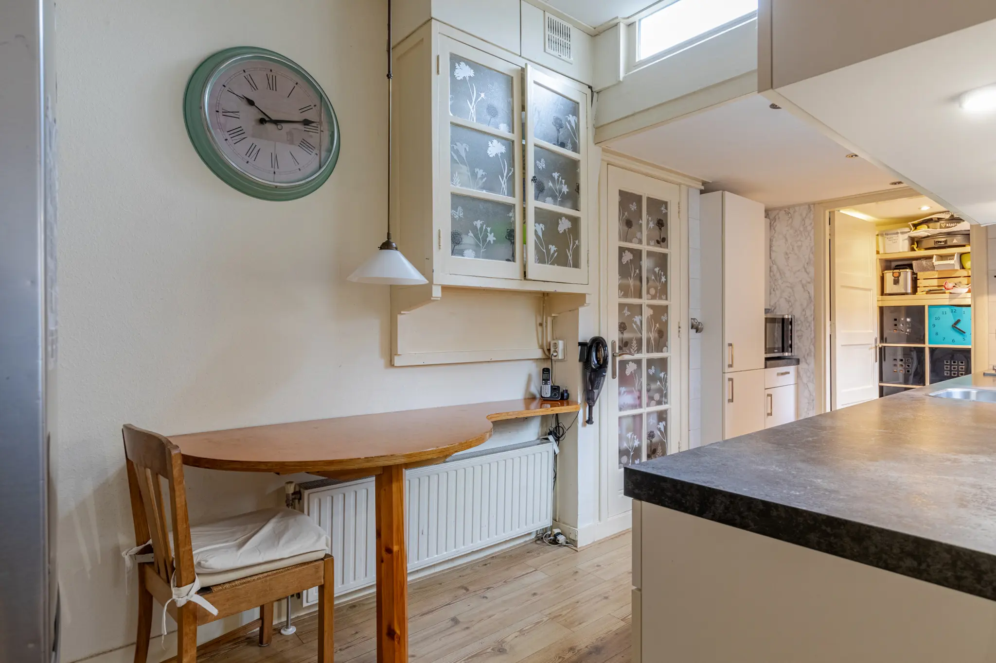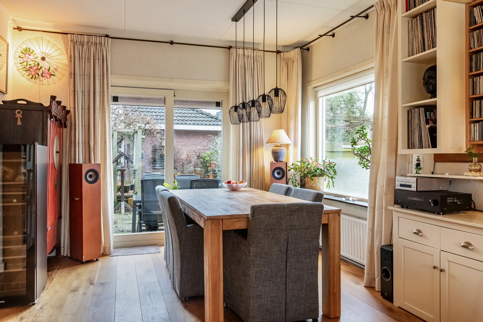 Via de entree komt u in de hal met trapopgang, toilet en meterkast. Vanuit de hal bereikt u de woonkamer. De lichte woonkamer bevindt zich aan de voorzijde en beschikt over grote raampartijen en een erker, wat zorgt voor een prettige lichtinval en een ruimtelijk gevoel. Aan de achterzijde ligt de eetkamer met schuifpui naar de tuin en toegang tot de (deels) gesloten keuken, centraal gesitueerd en met toegang tot de tuin. Aansluitend aan de keuken bevindt zich de toegang tot de kelder en een praktische bijkeuken/achter-entree.
